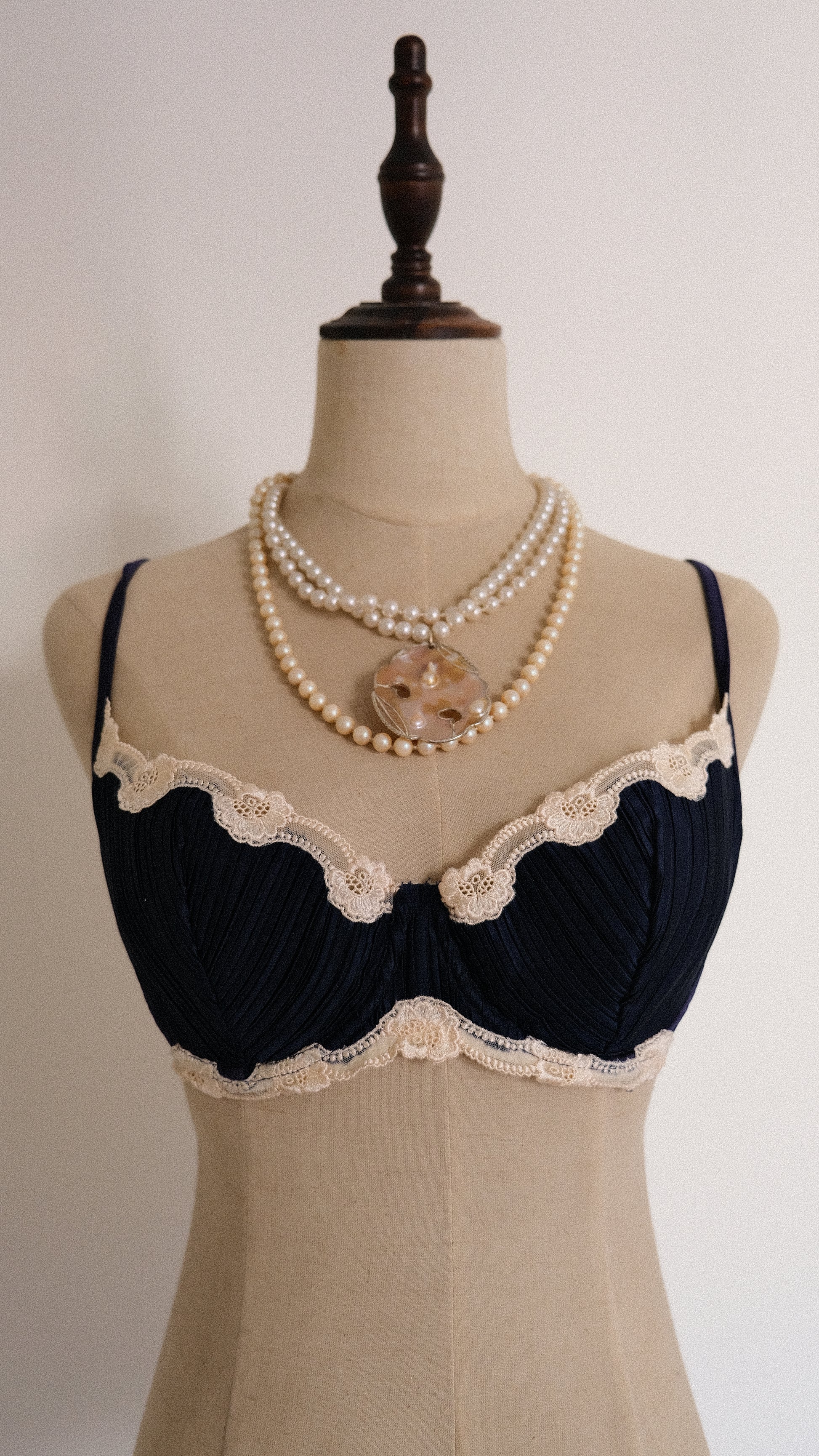 A vintage Italian navy blue pleated bra with cream lace adding a soft and romantic touch.