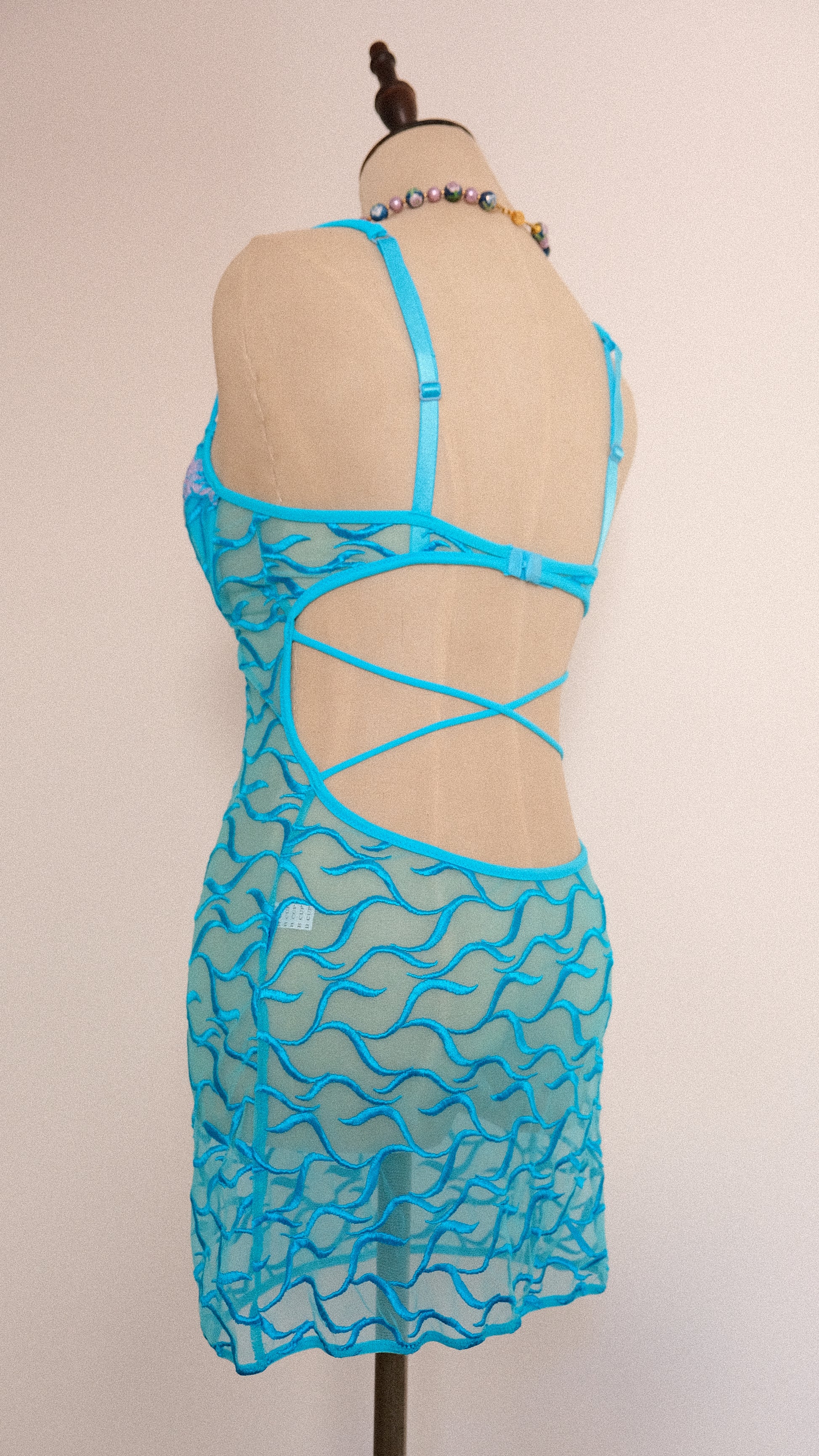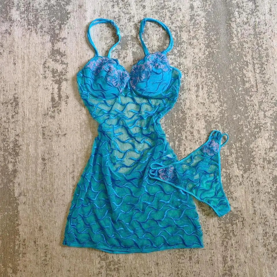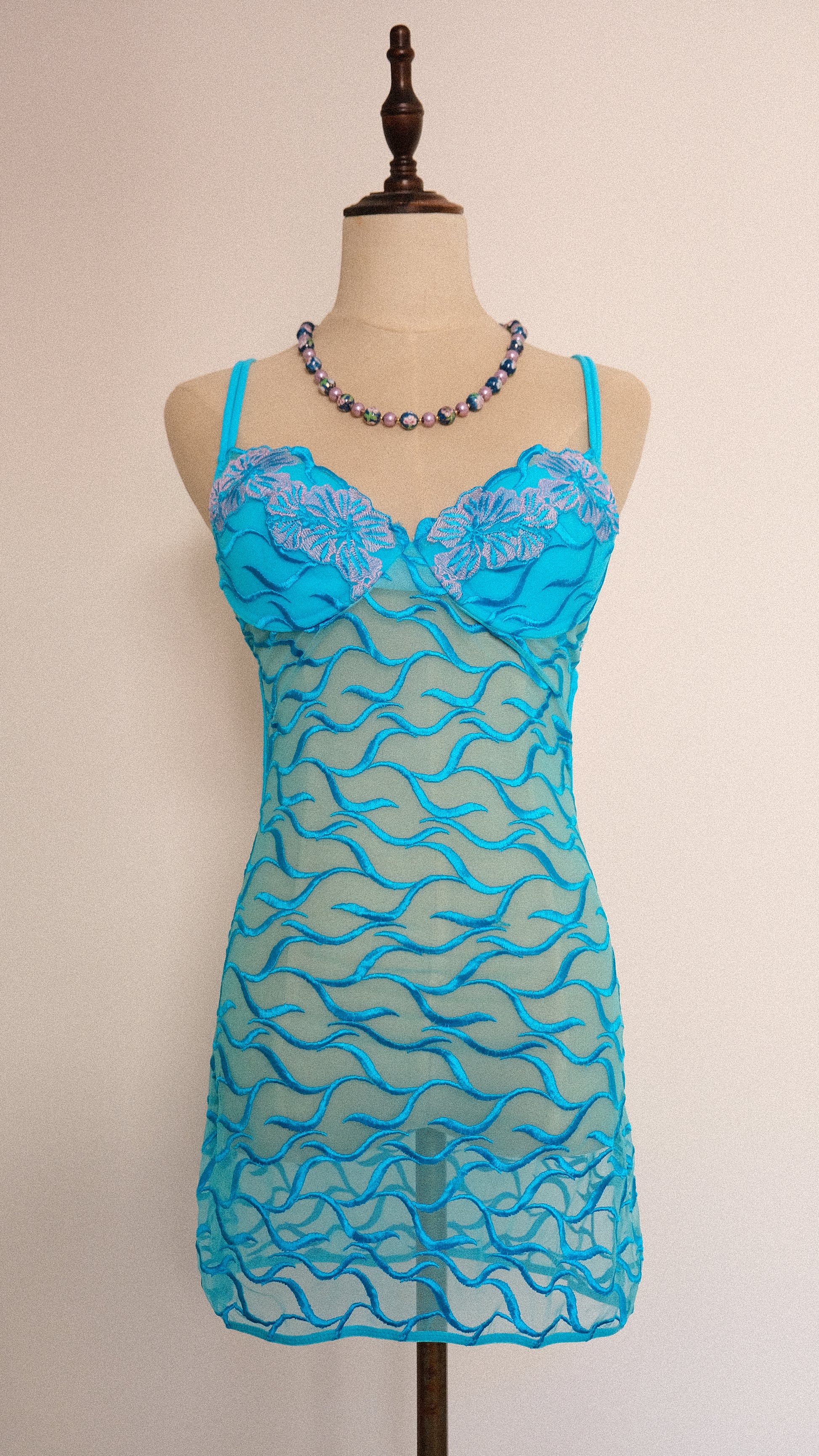 A lingerie set that is like a dive into a tropical ocean with vibrant blue mesh wave-like patterns that echo the movement of the sea. The floral embroidery on the cups adds a playful and tropical charm.