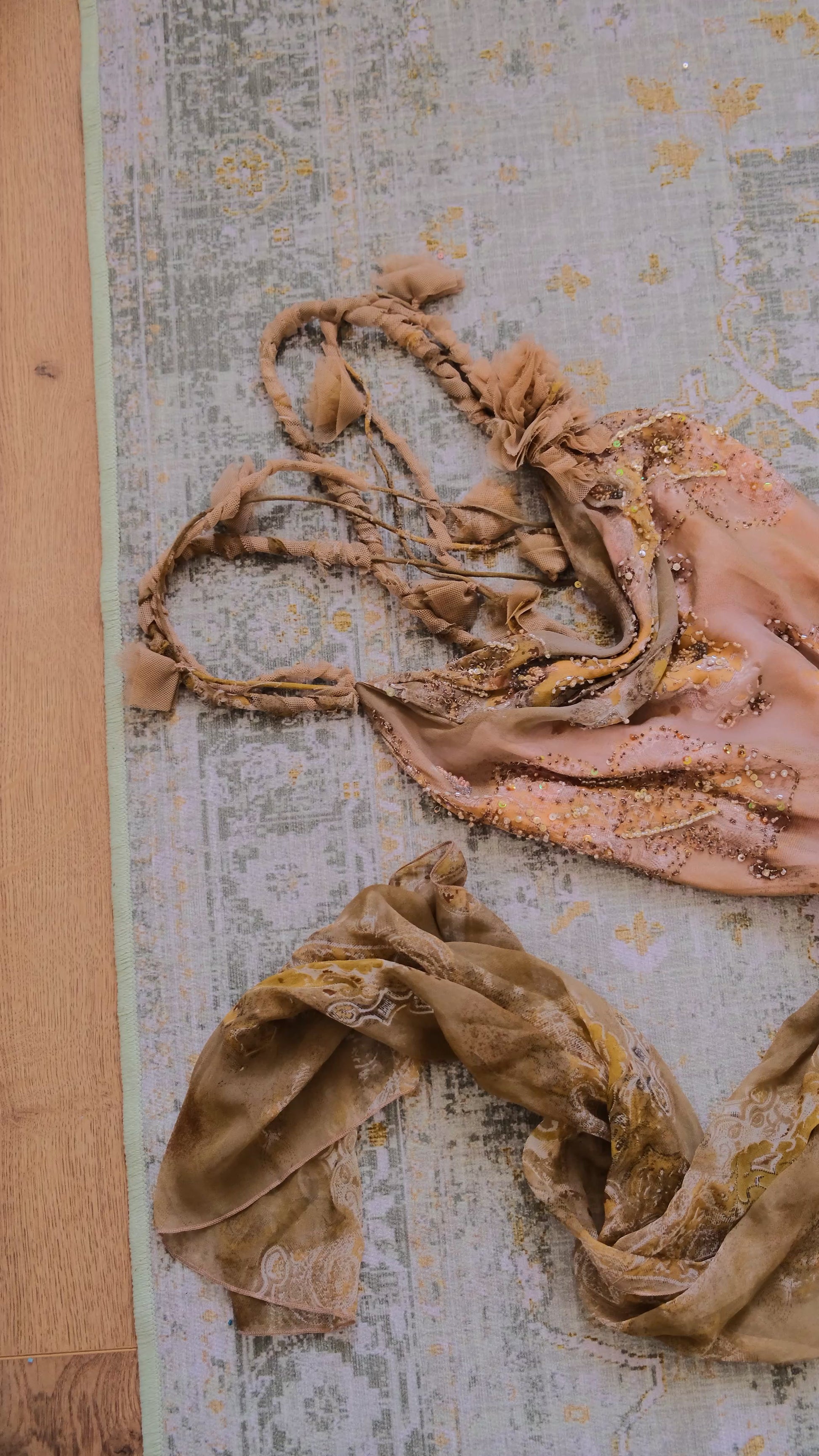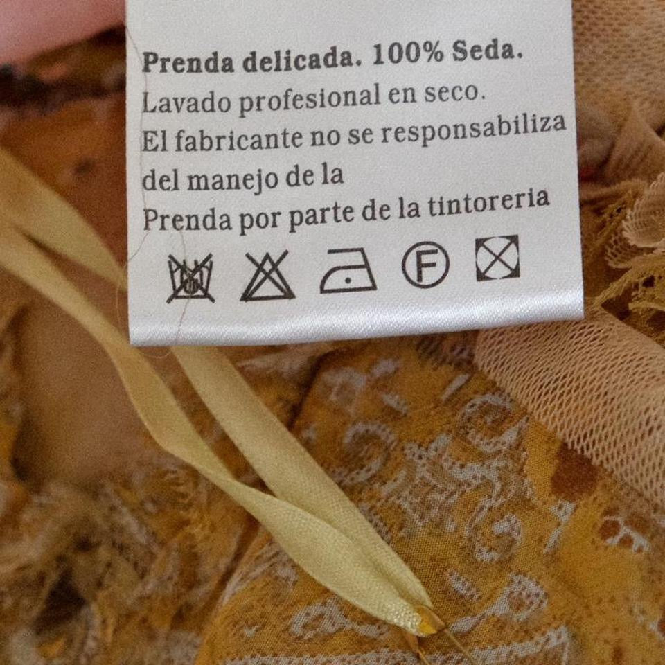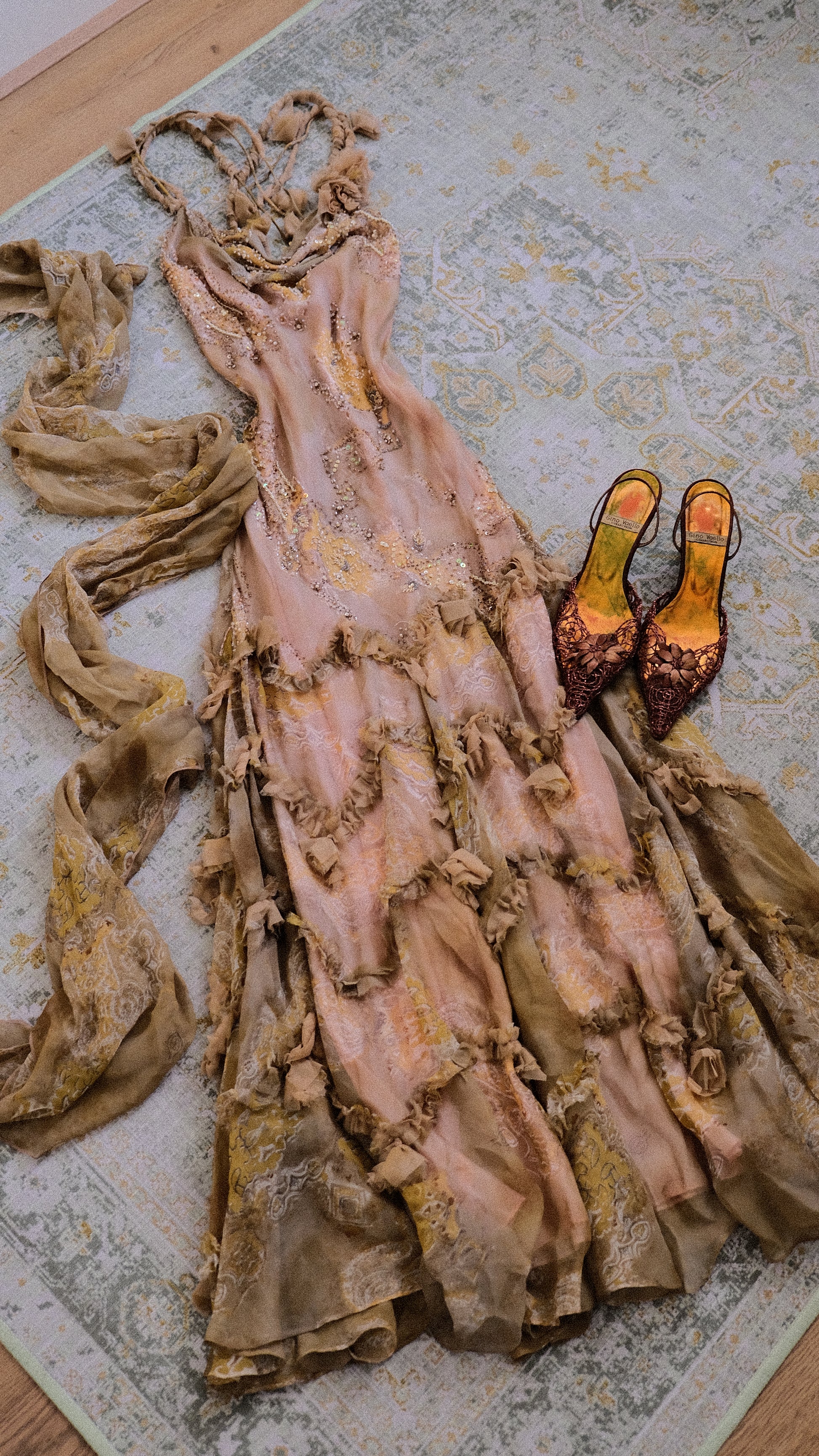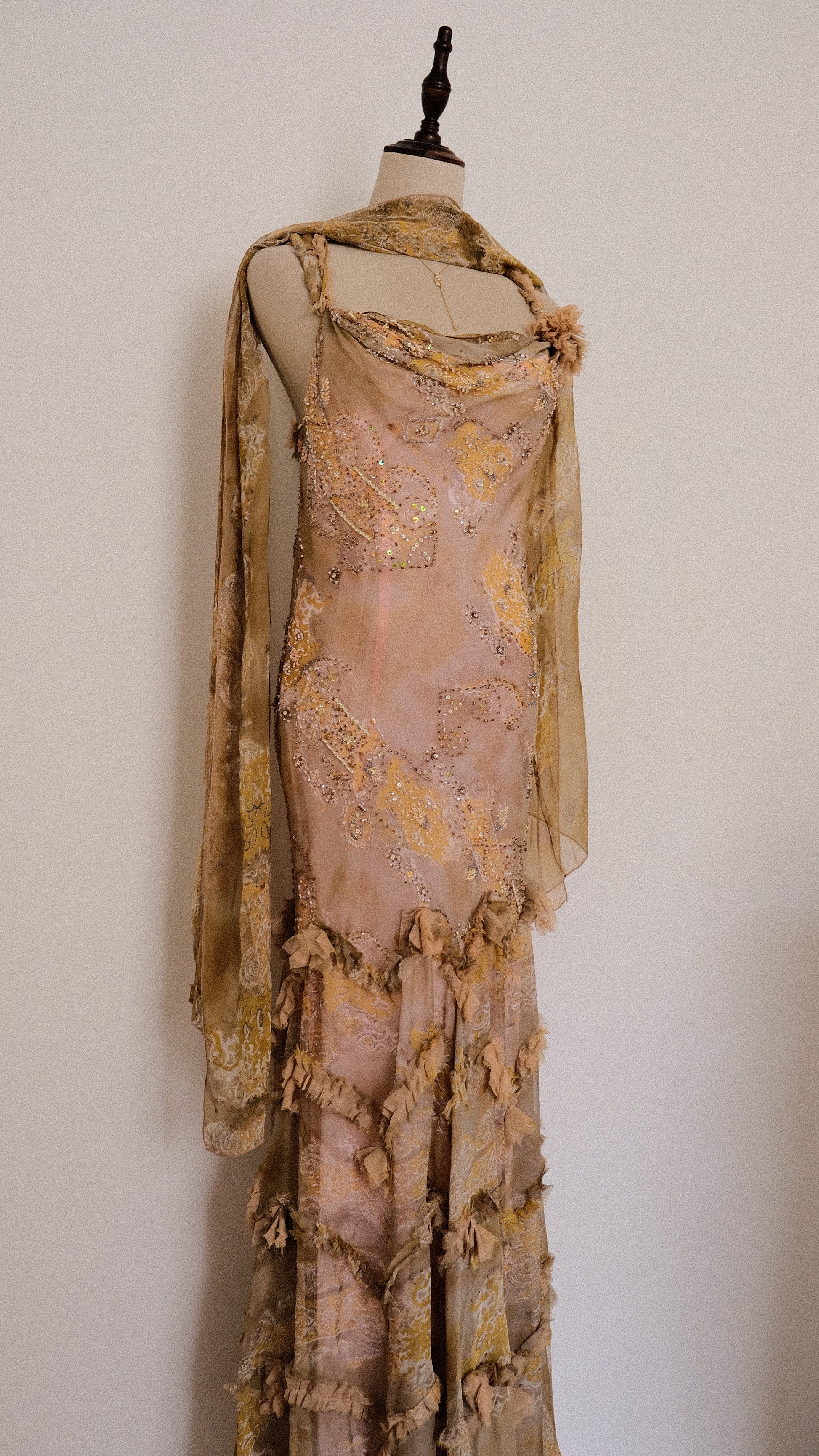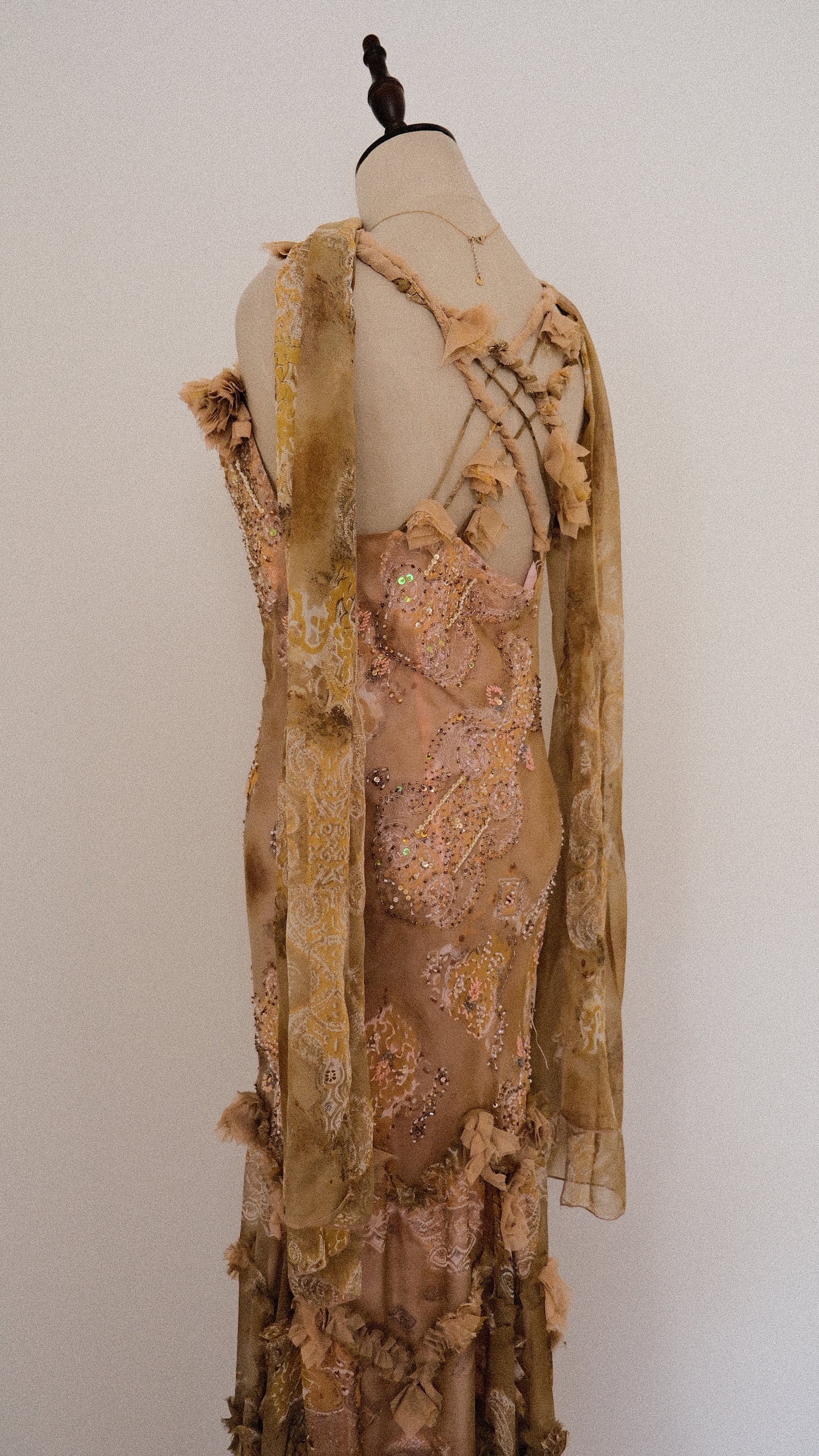 A beautiful NWT vintage Spanish dress in a brown caramel color palette. The dress has ruffled detailing and is covered here and there in beads.