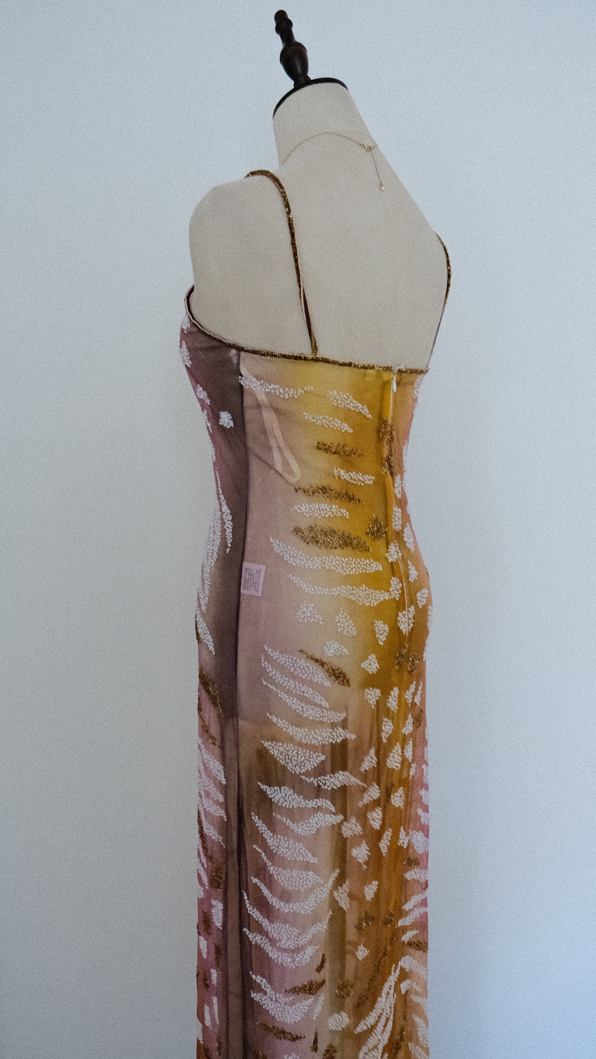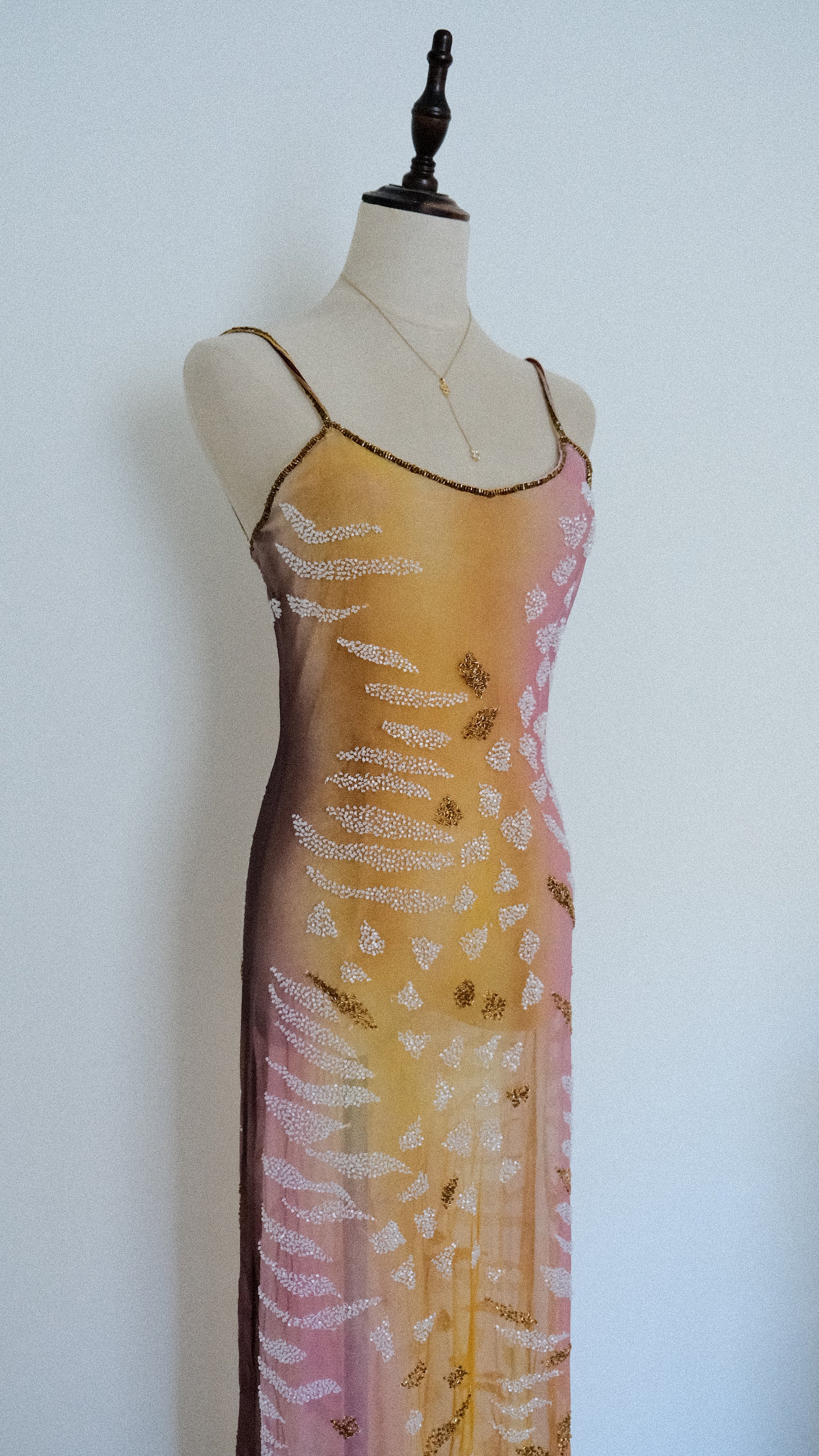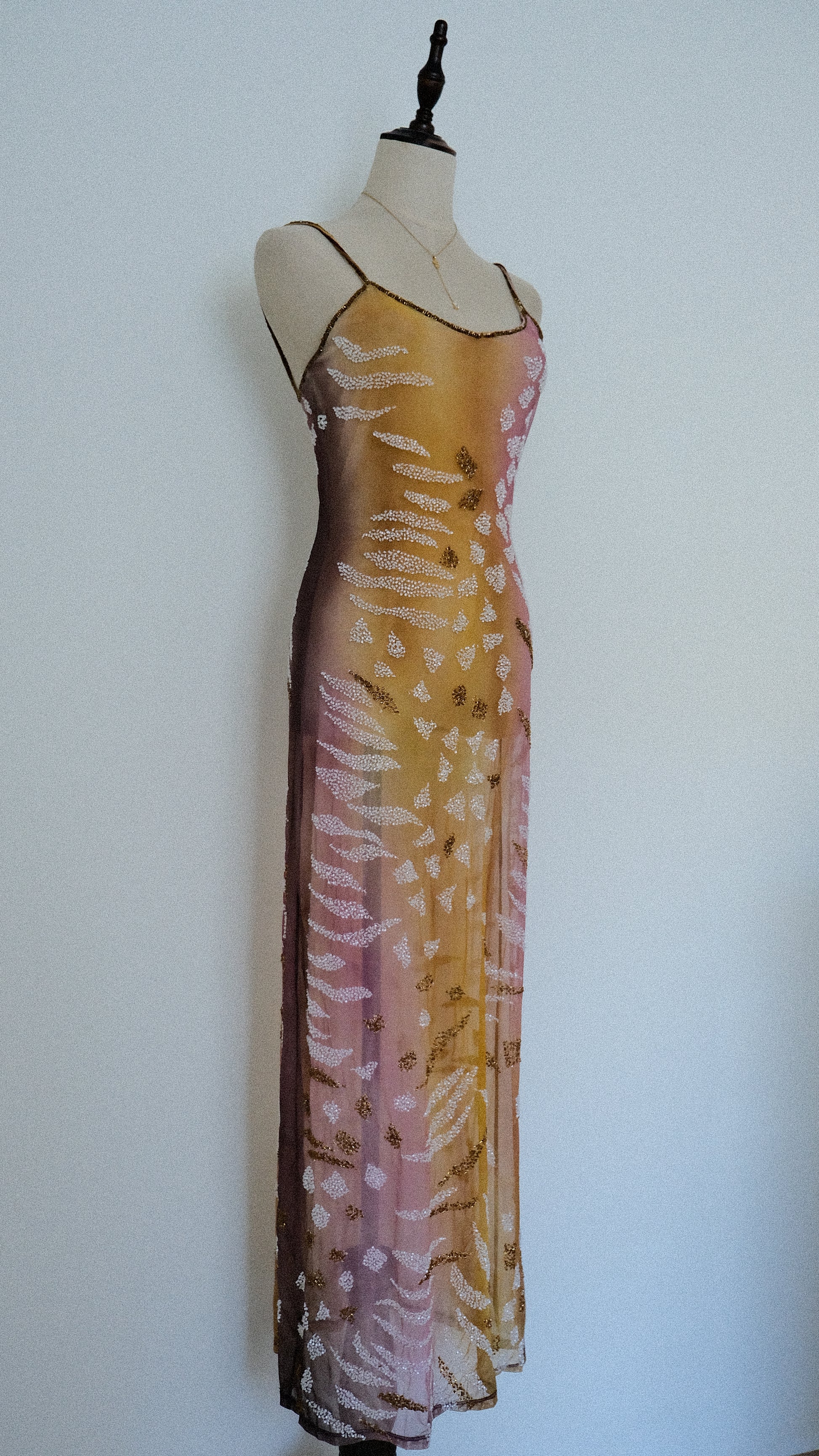 A breathtaking mesh lingerie dress in a warm sunset color palette and an mesmerizing embellished pattern.