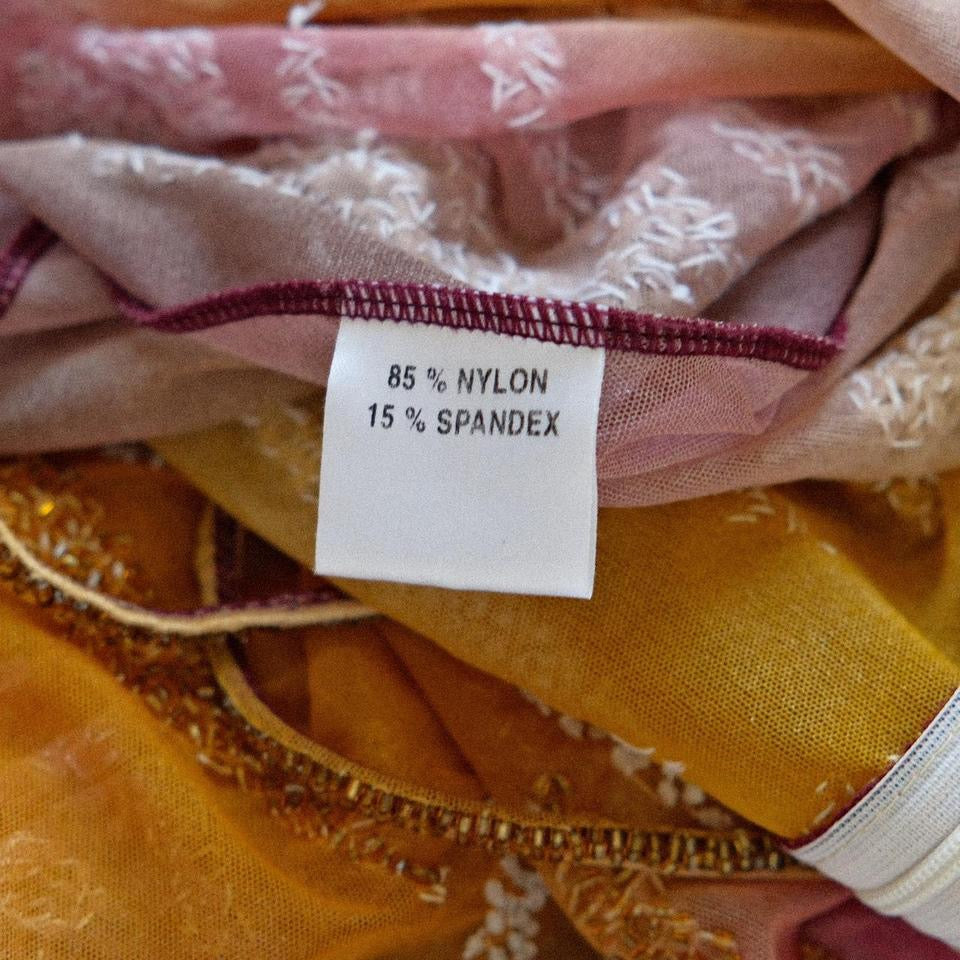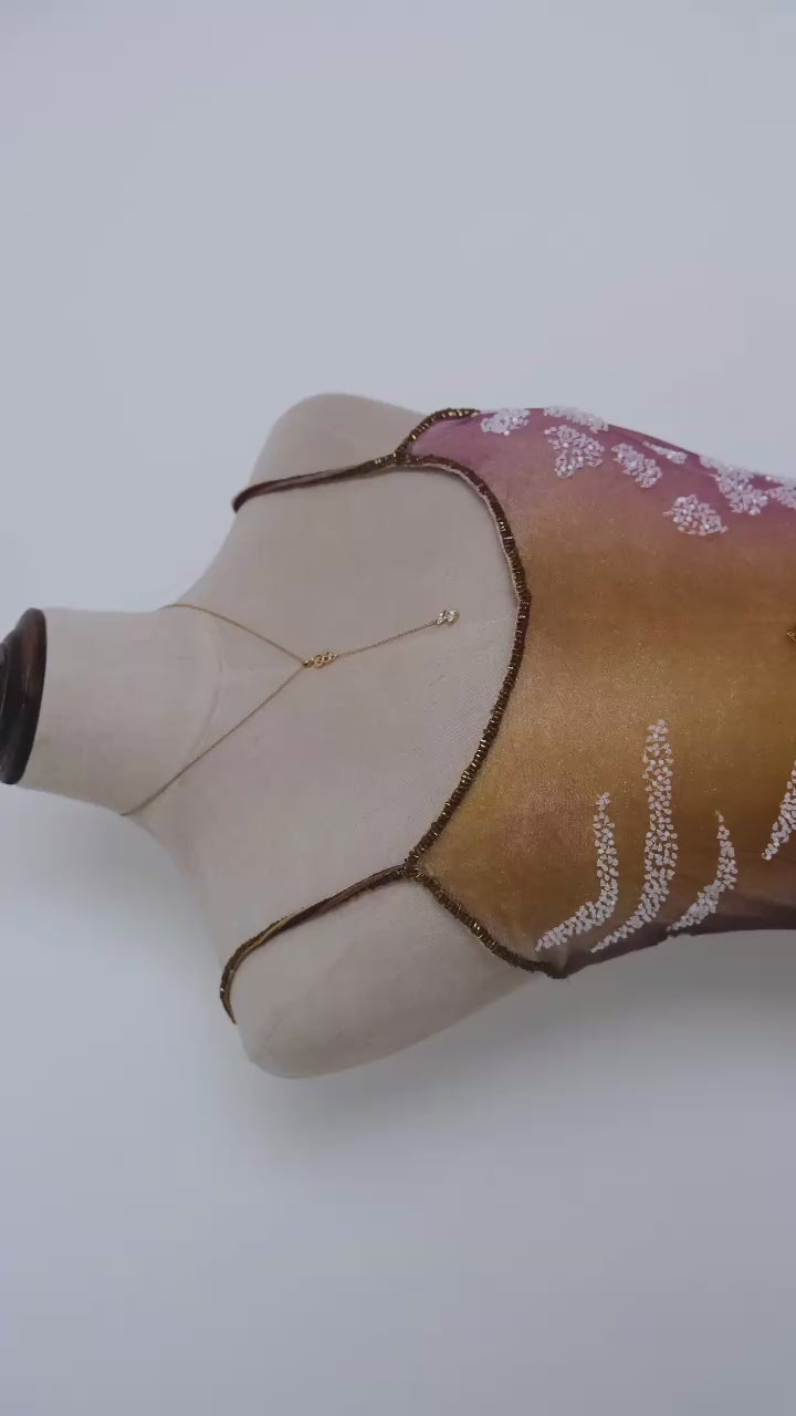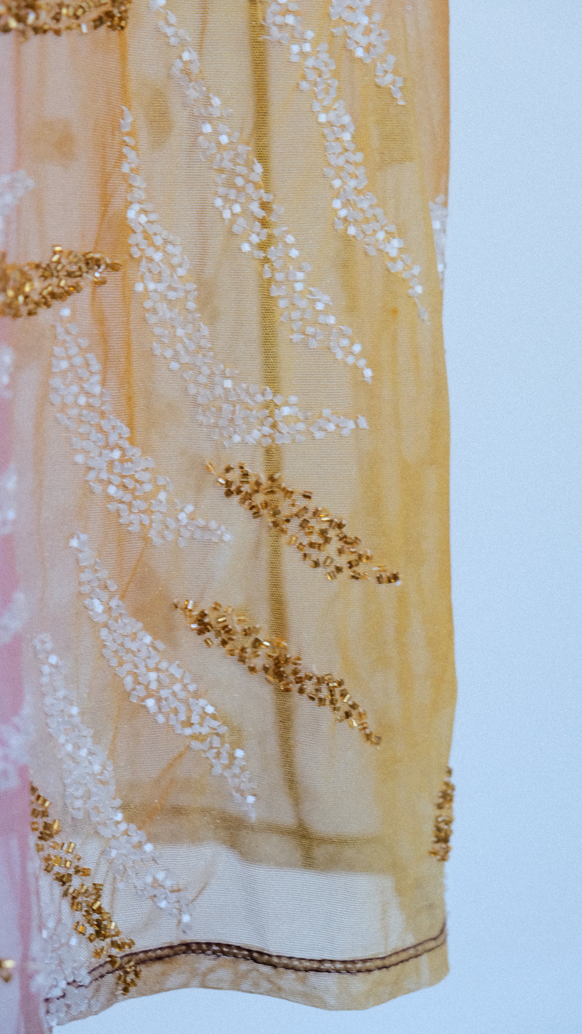 A breathtaking mesh lingerie dress in a warm sunset color palette and an mesmerizing embellished pattern.