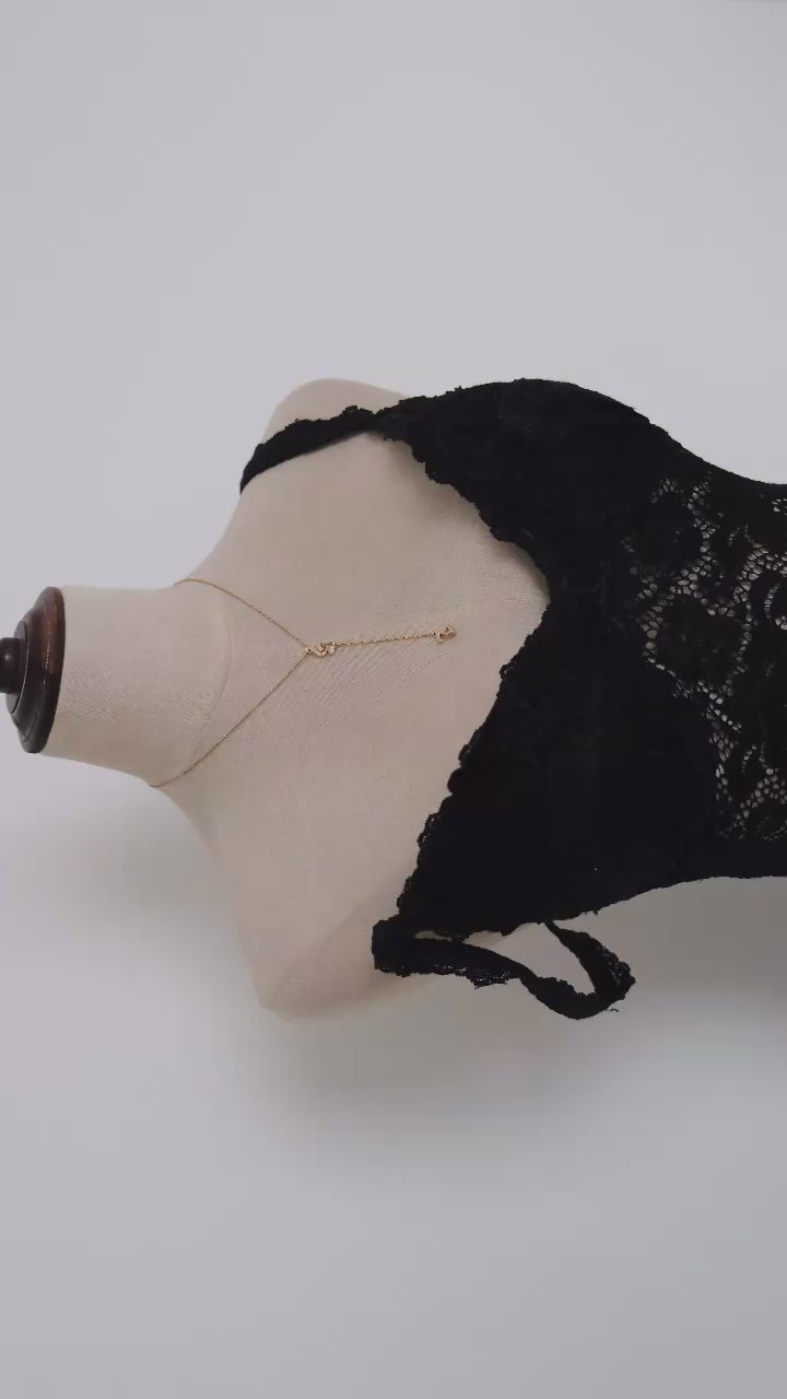 An English designer black lace lingerie dress with split detail at the front. The cups are non seethrough, while the rest of the dress is made of lace material. Brand: Catwalk Collection London.