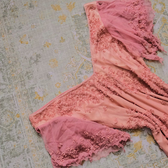 A romantic blush colored embellished fairycore dress with asymmetric cut at the bottom for a flirtatious look and the most stunning embellished ruffled sleeves.