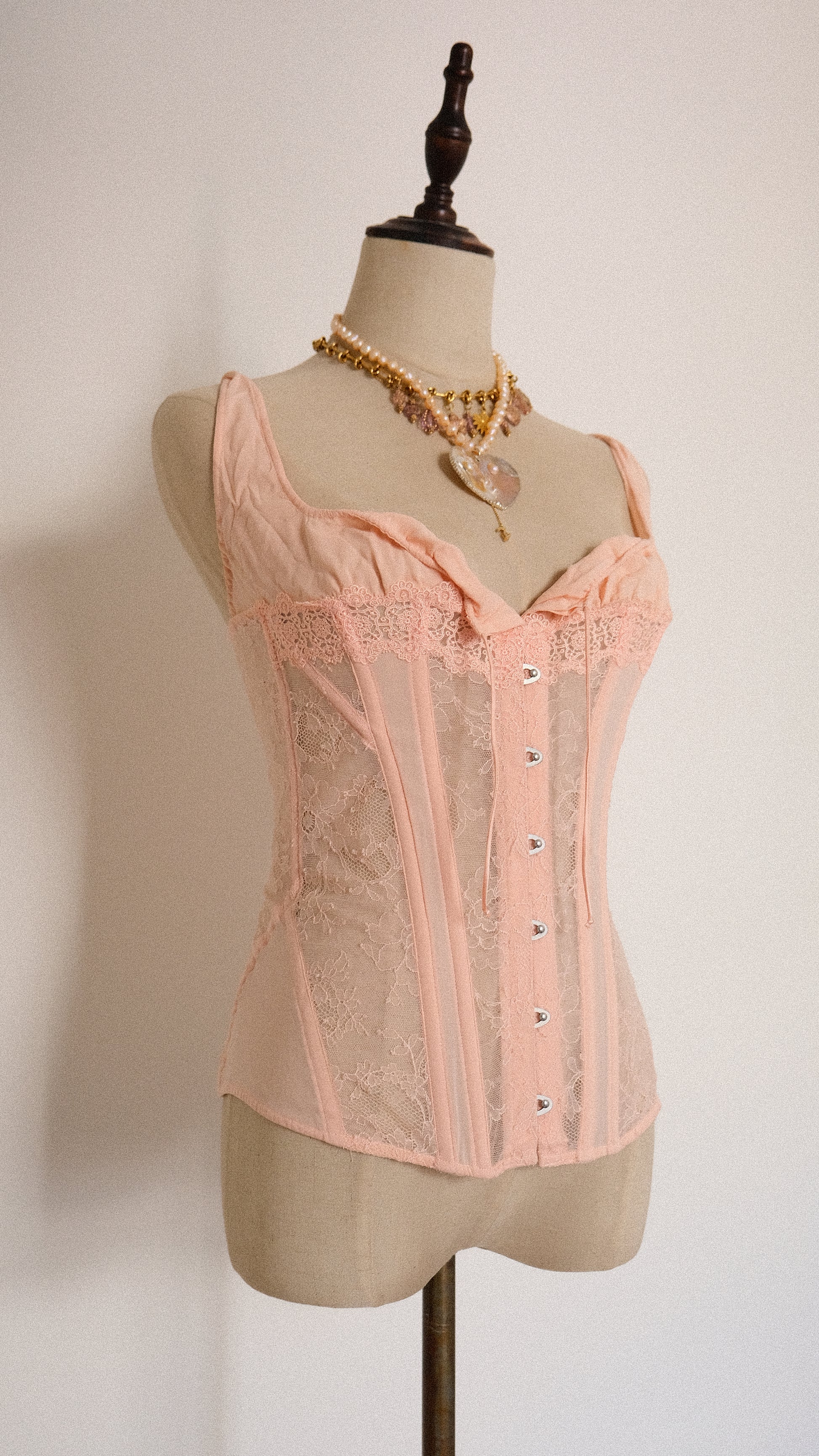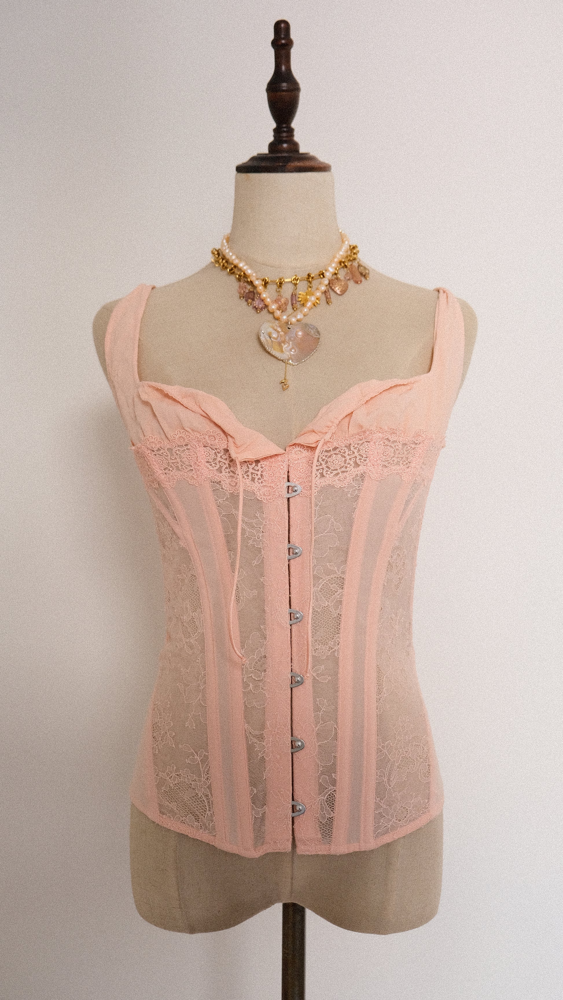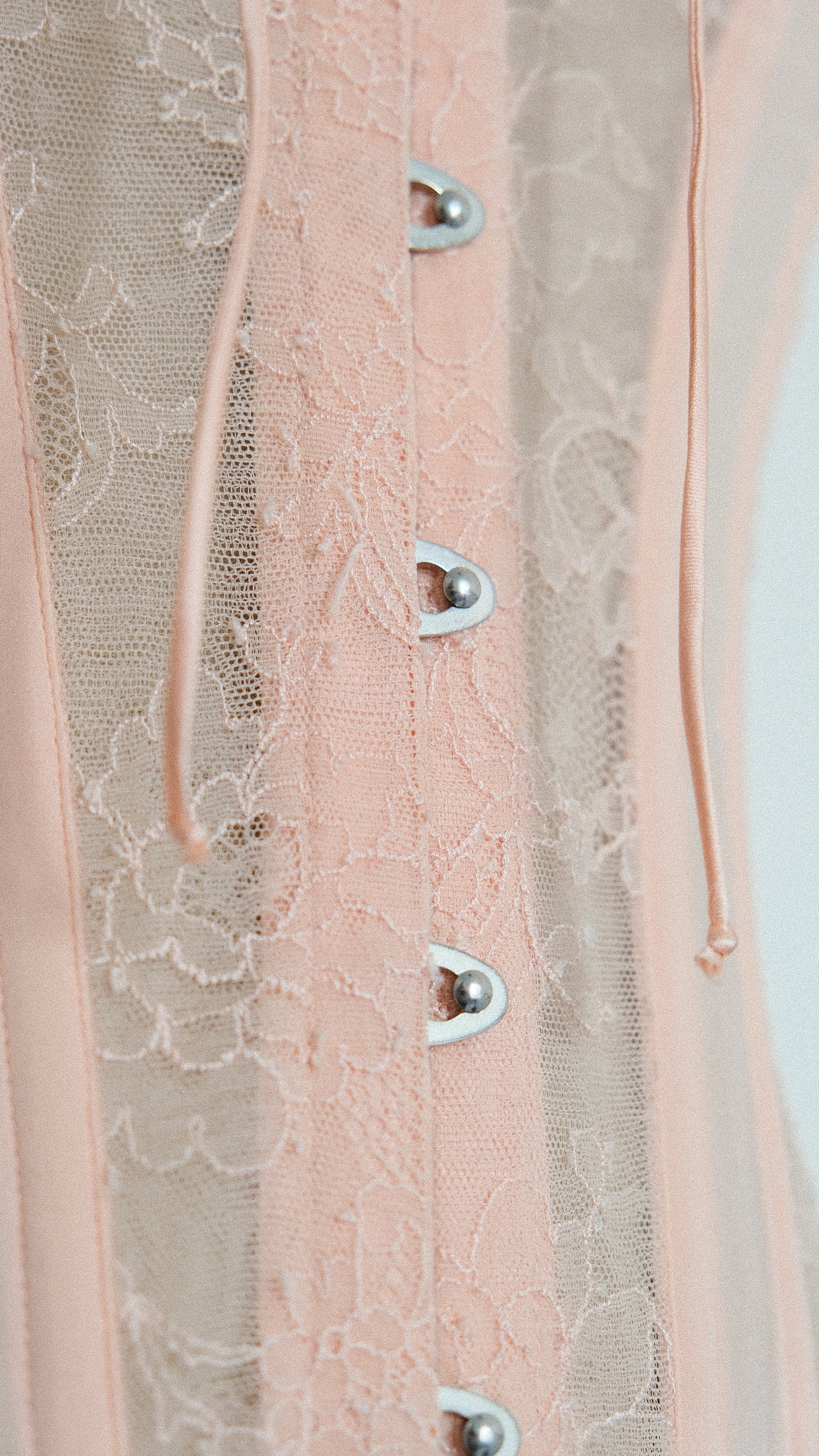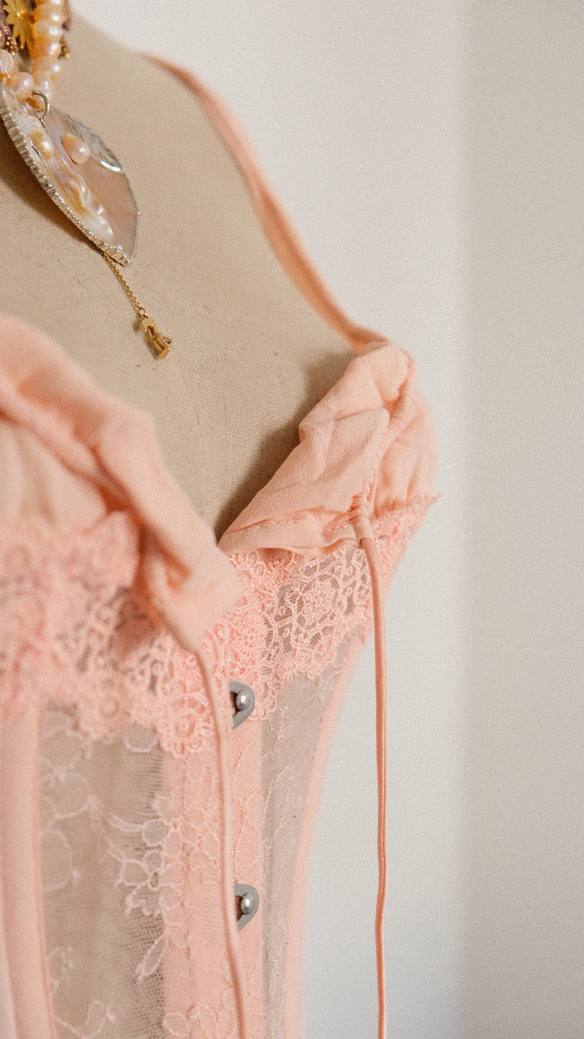 A rare blush pink bustier that feels like a sweet memory of a fairy’s first brush with love.