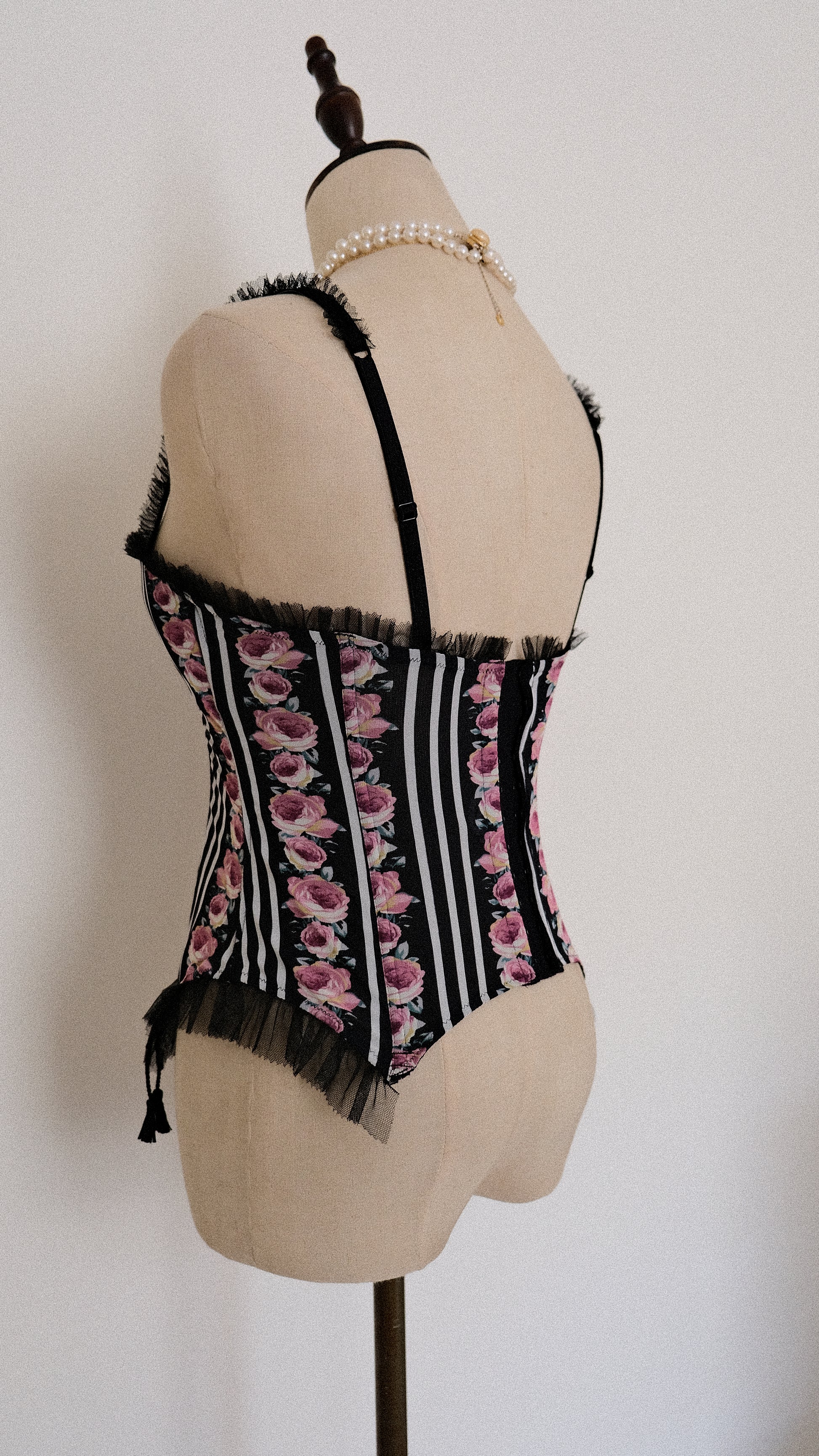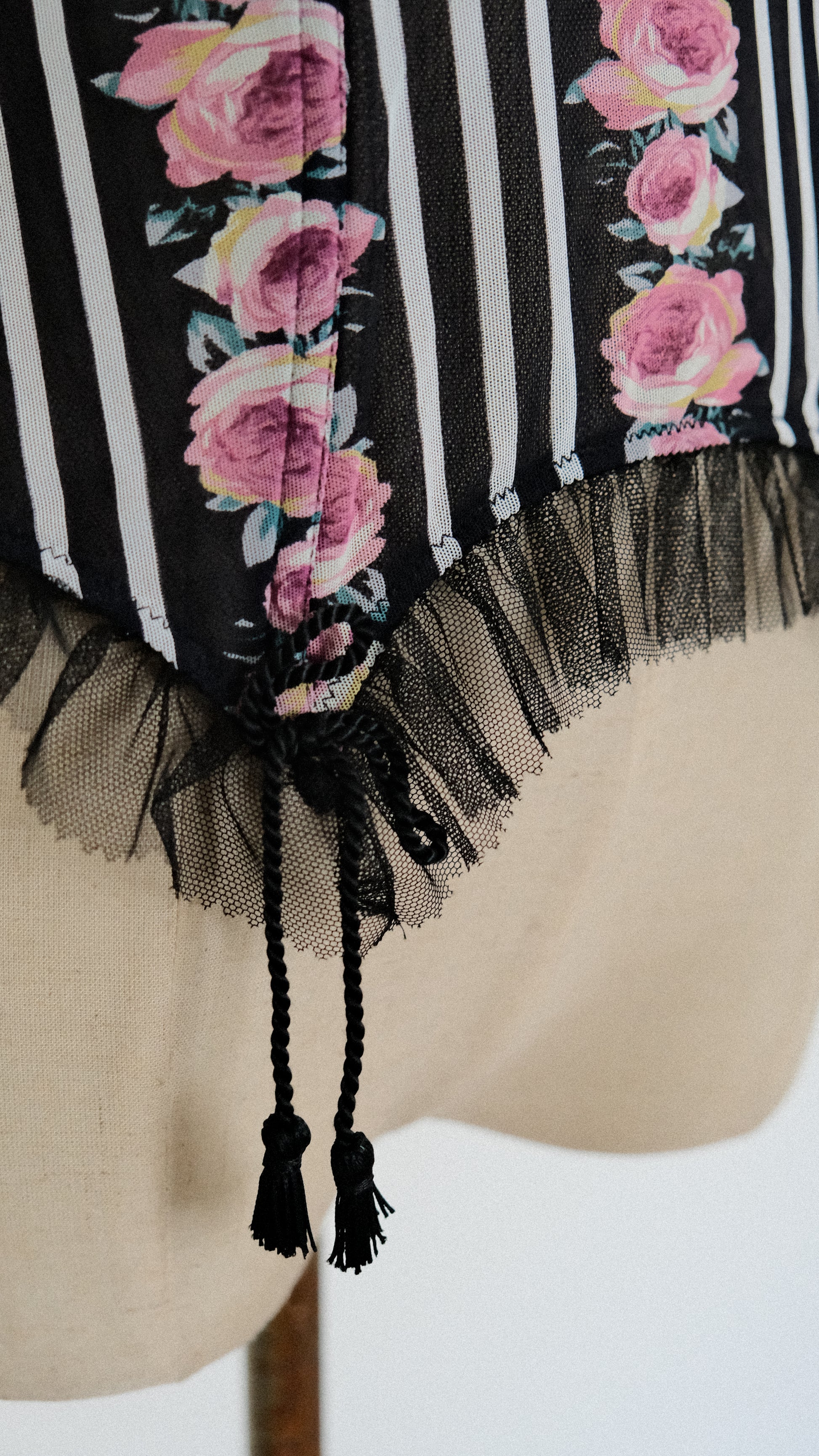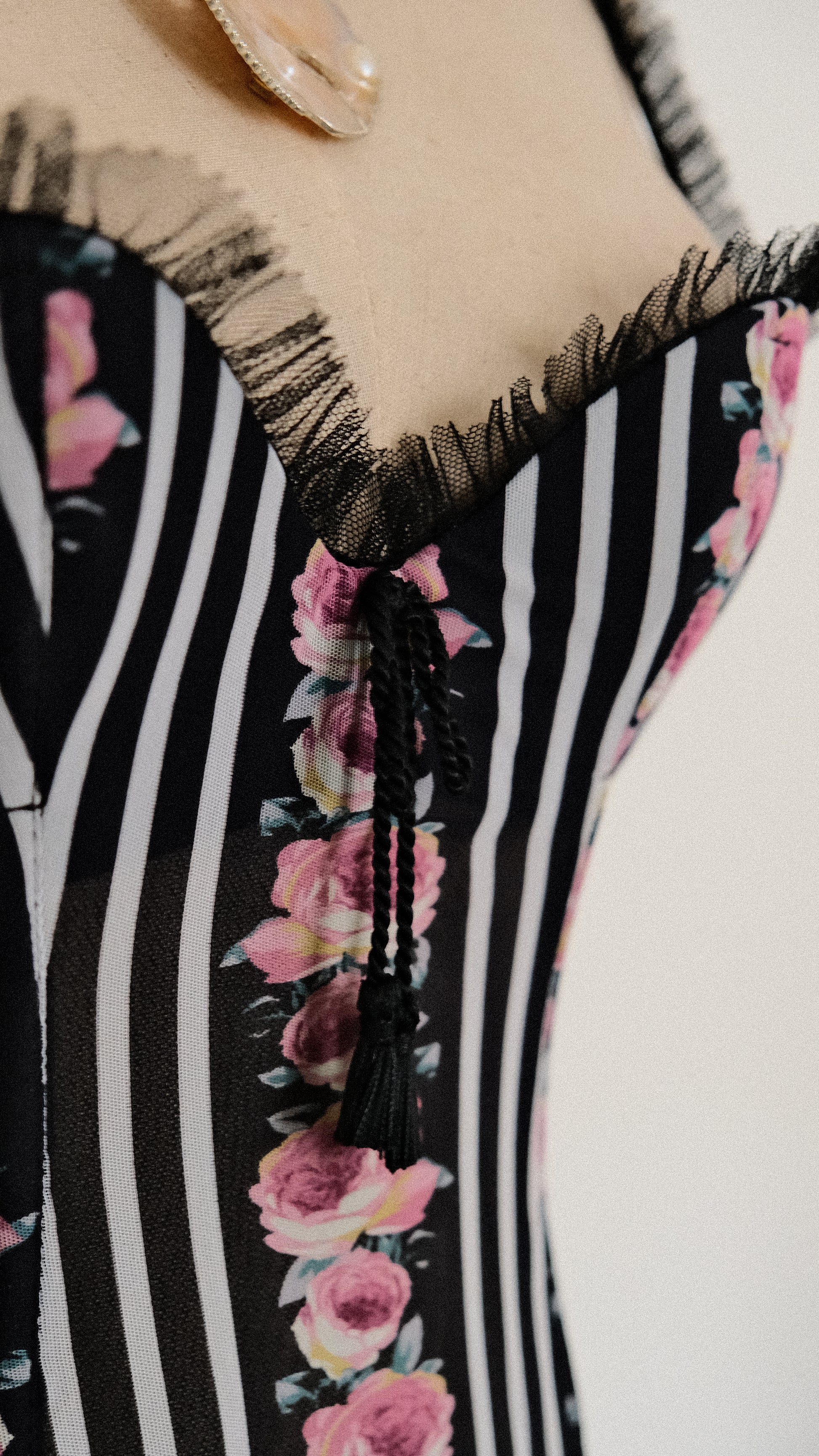 A rare Chantal Thomass striped corset with ruffled edges and romantic floral patterns.