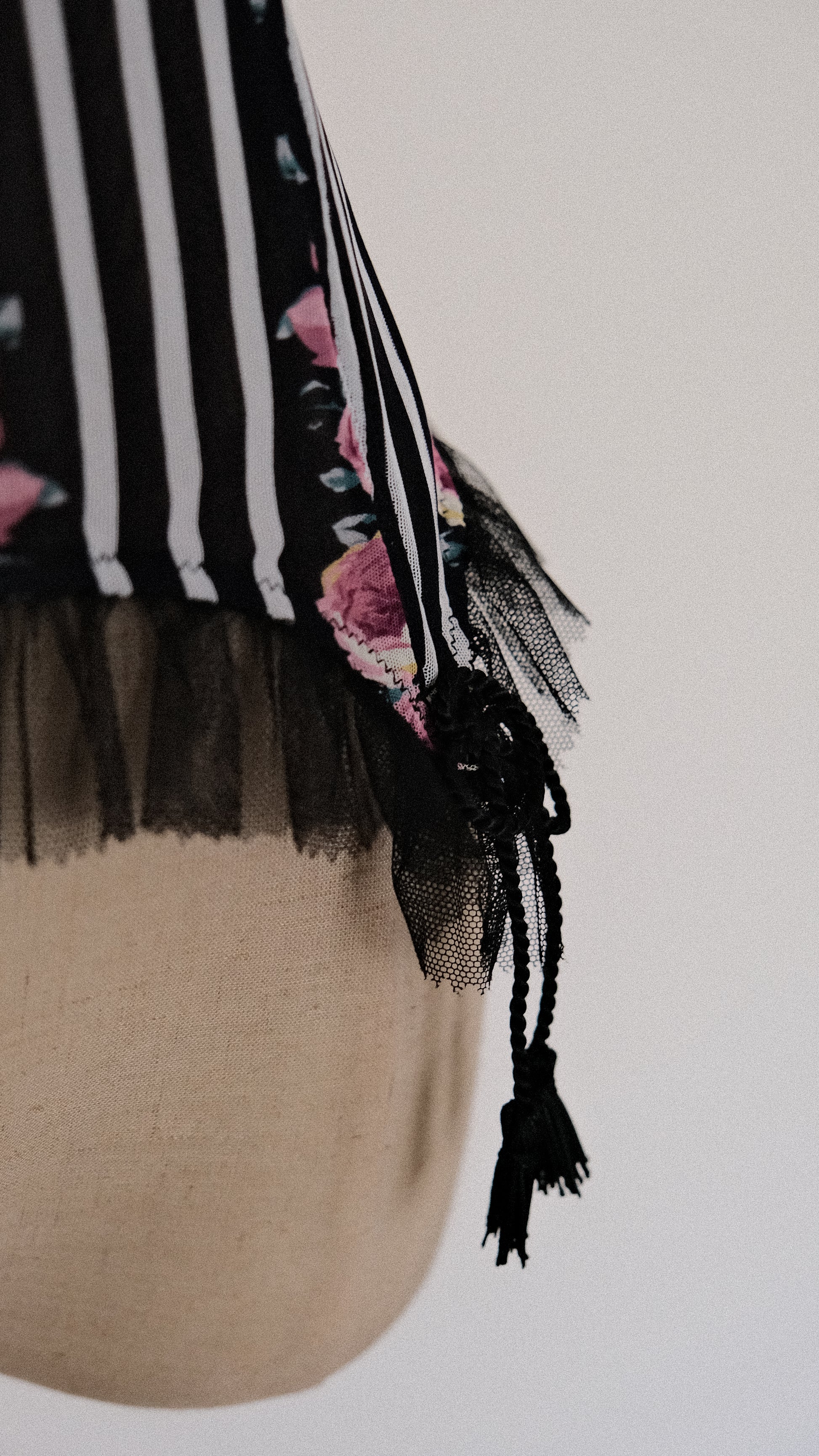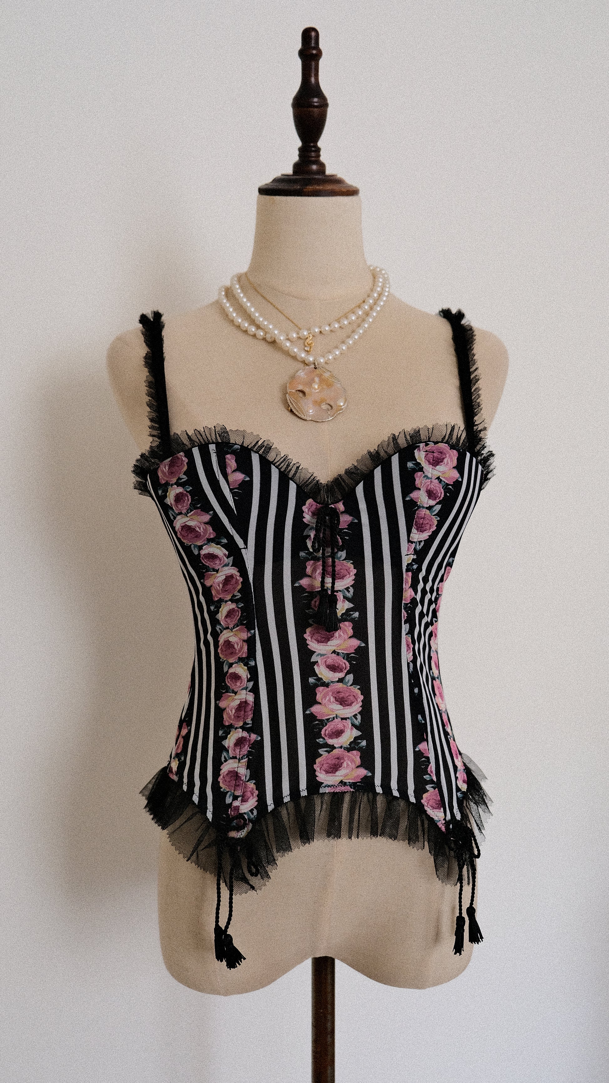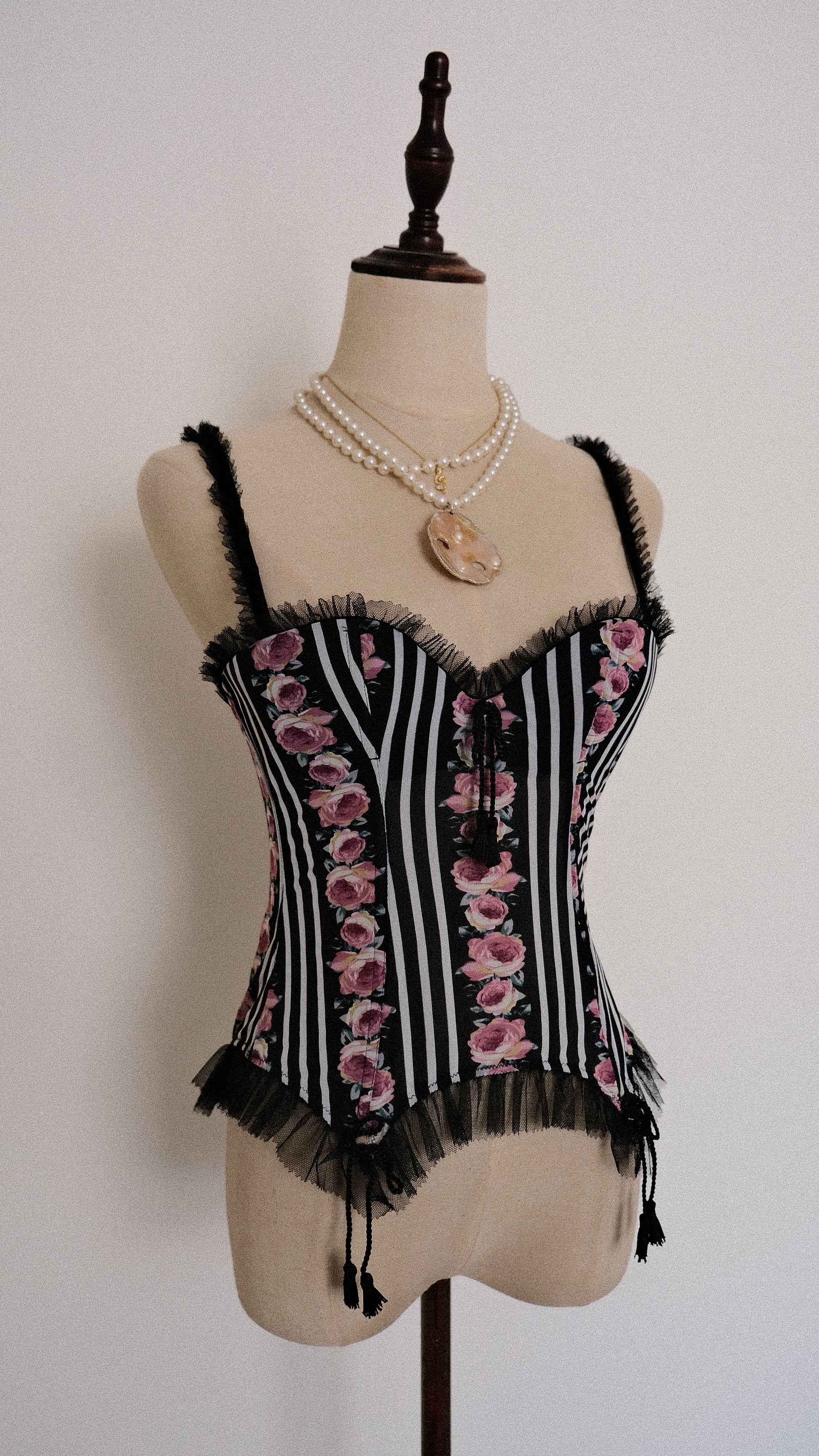 A rare Chantal Thomass striped corset with ruffled edges and romantic floral patterns.