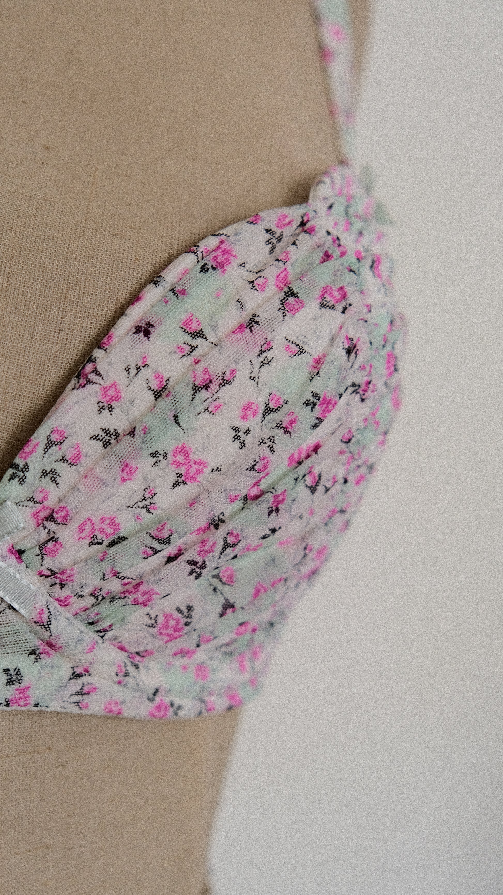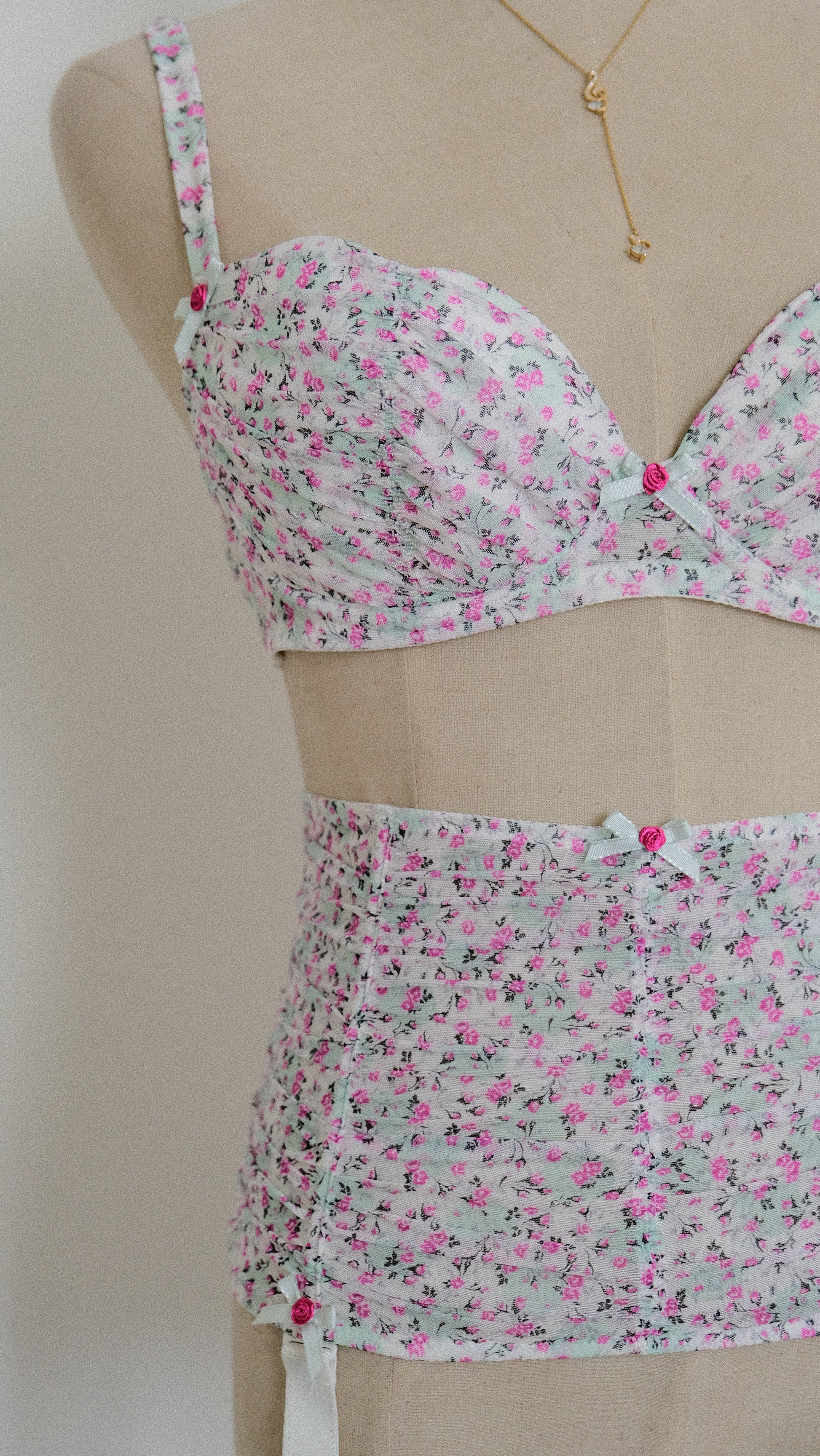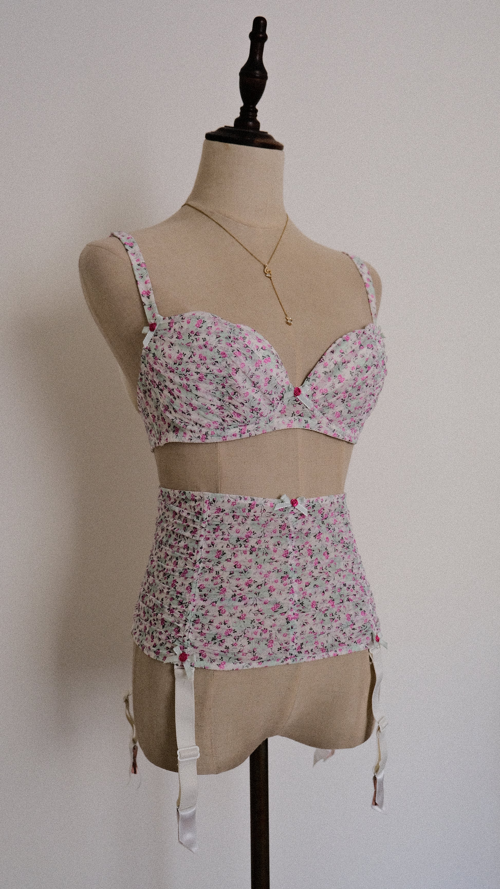 A rare vintage floral 2 piece set from the brand Chantal Thomass; A floral ruffled bra with a matching garter.
