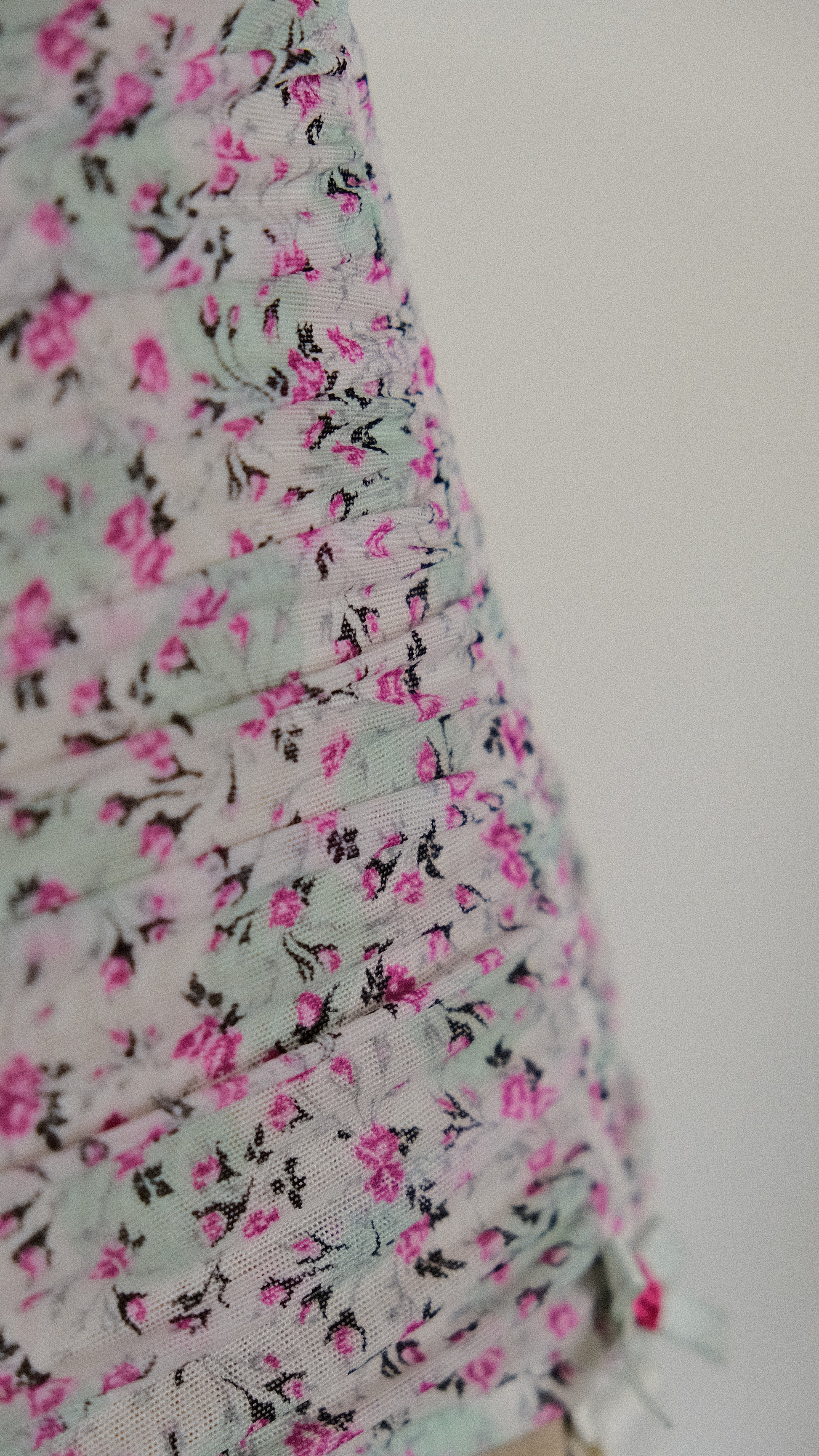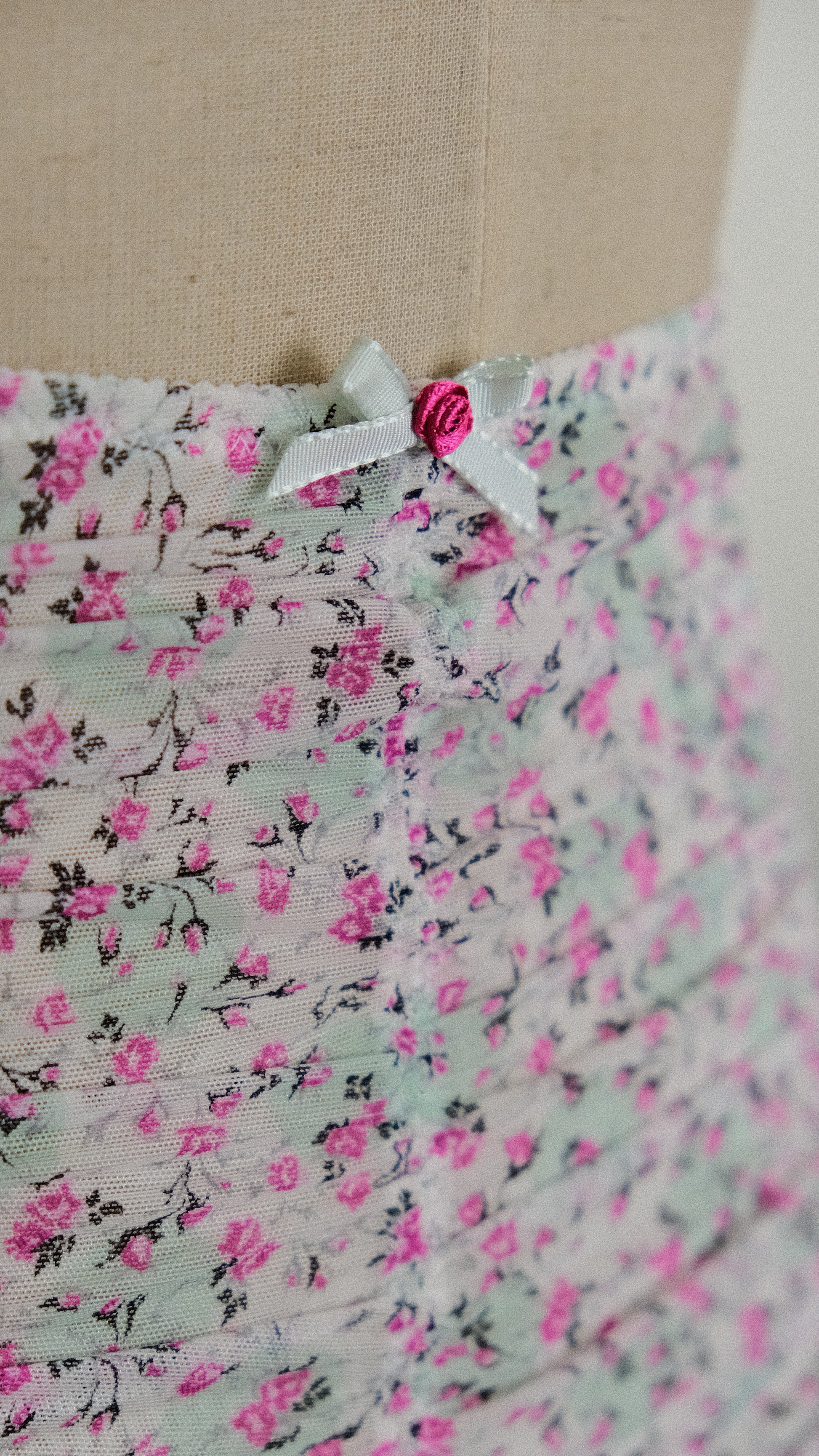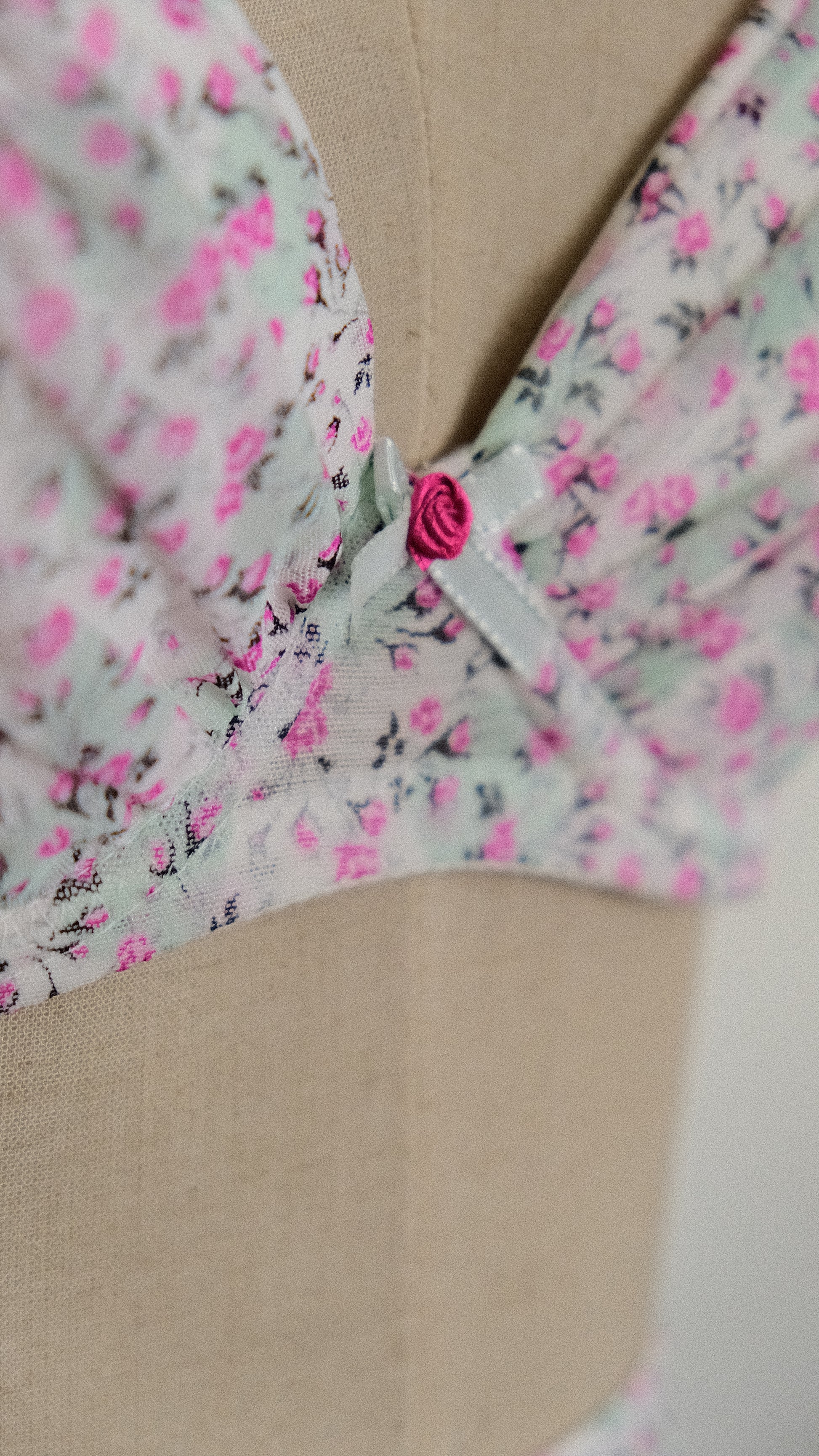A rare vintage floral 2 piece set from the brand Chantal Thomass; A floral ruffled bra with a matching garter.