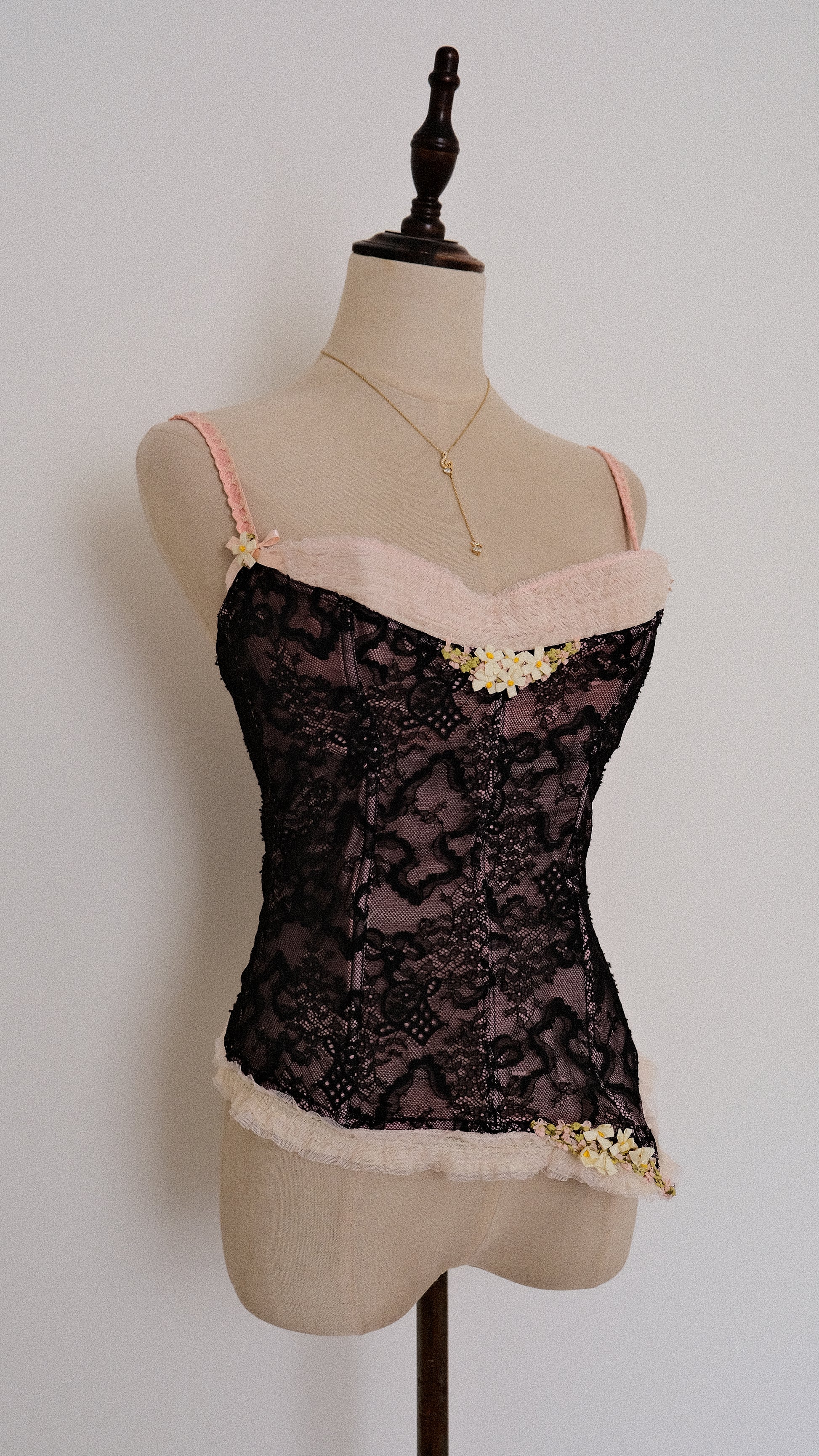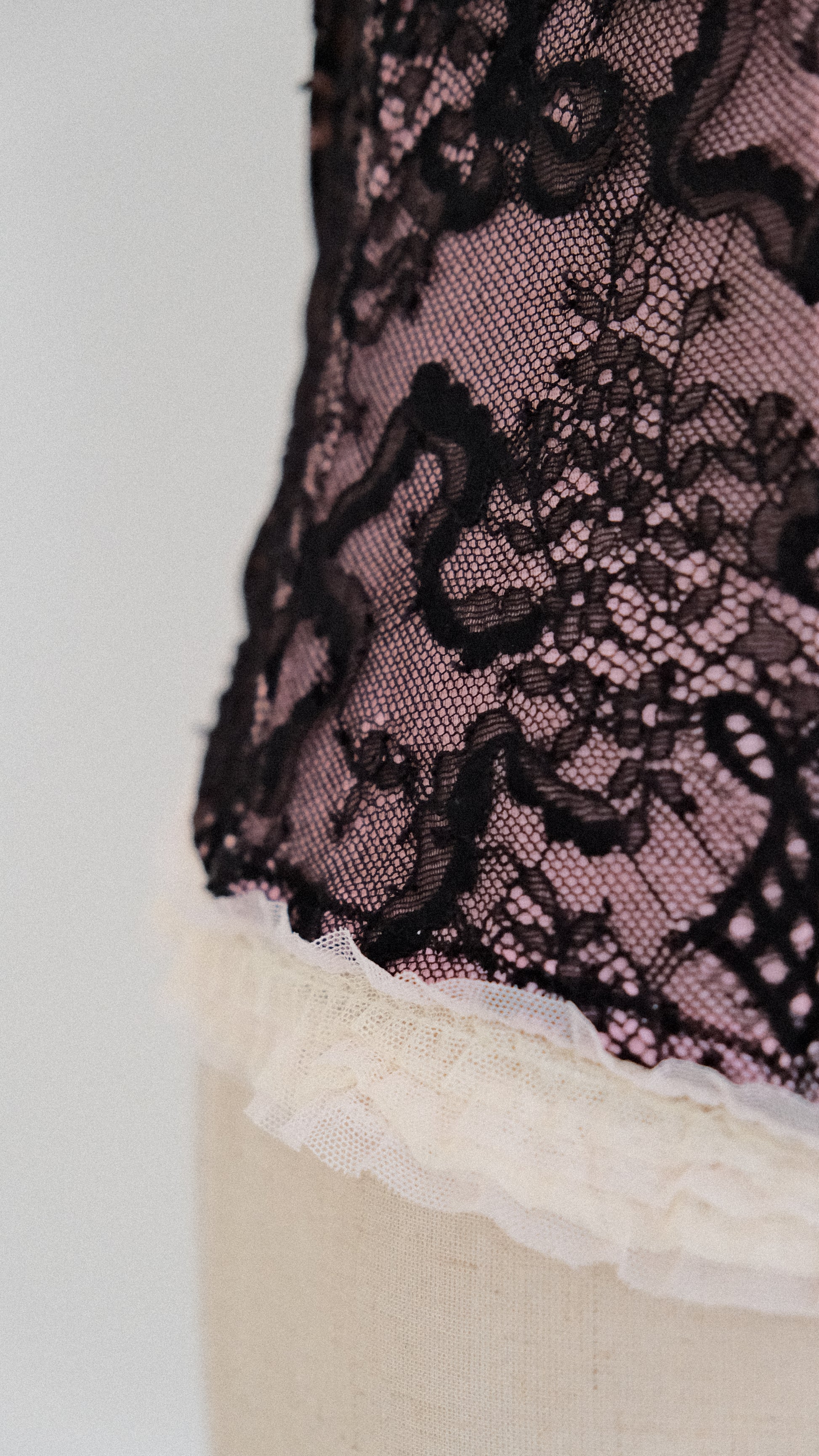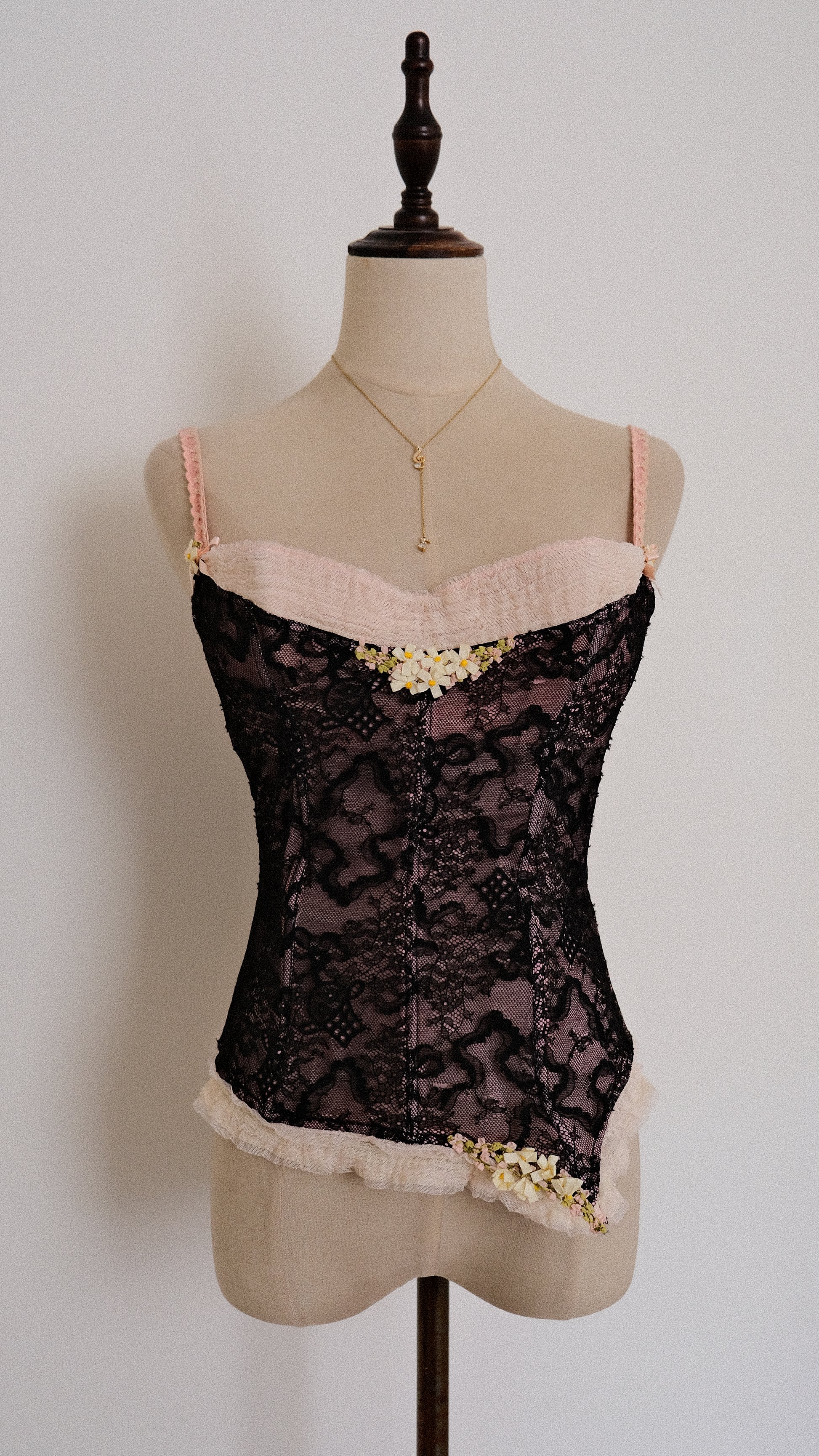 A rare vintage Chantal Thomass dark lace floral corset top with ruffled edges and mini floral details.
