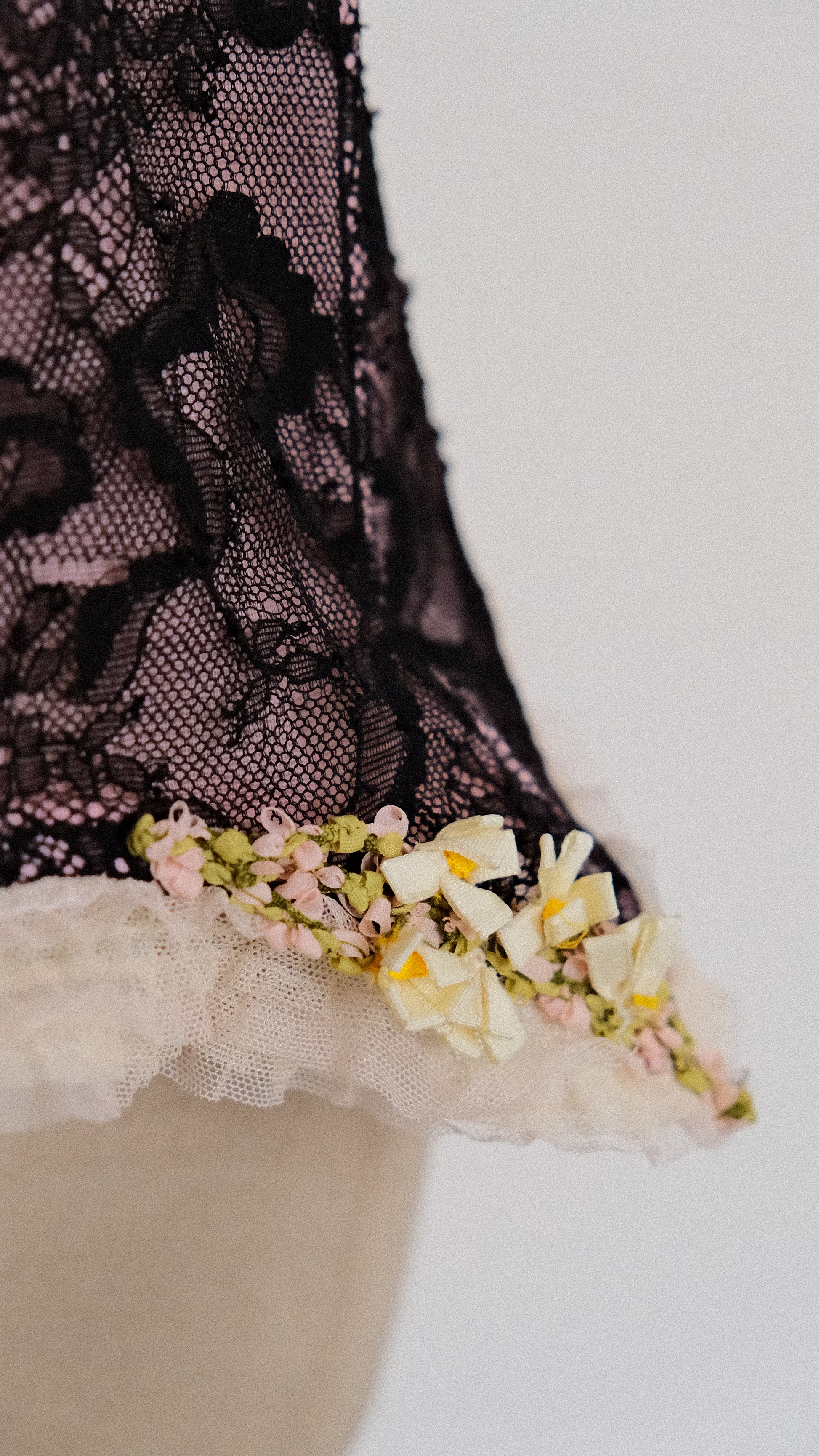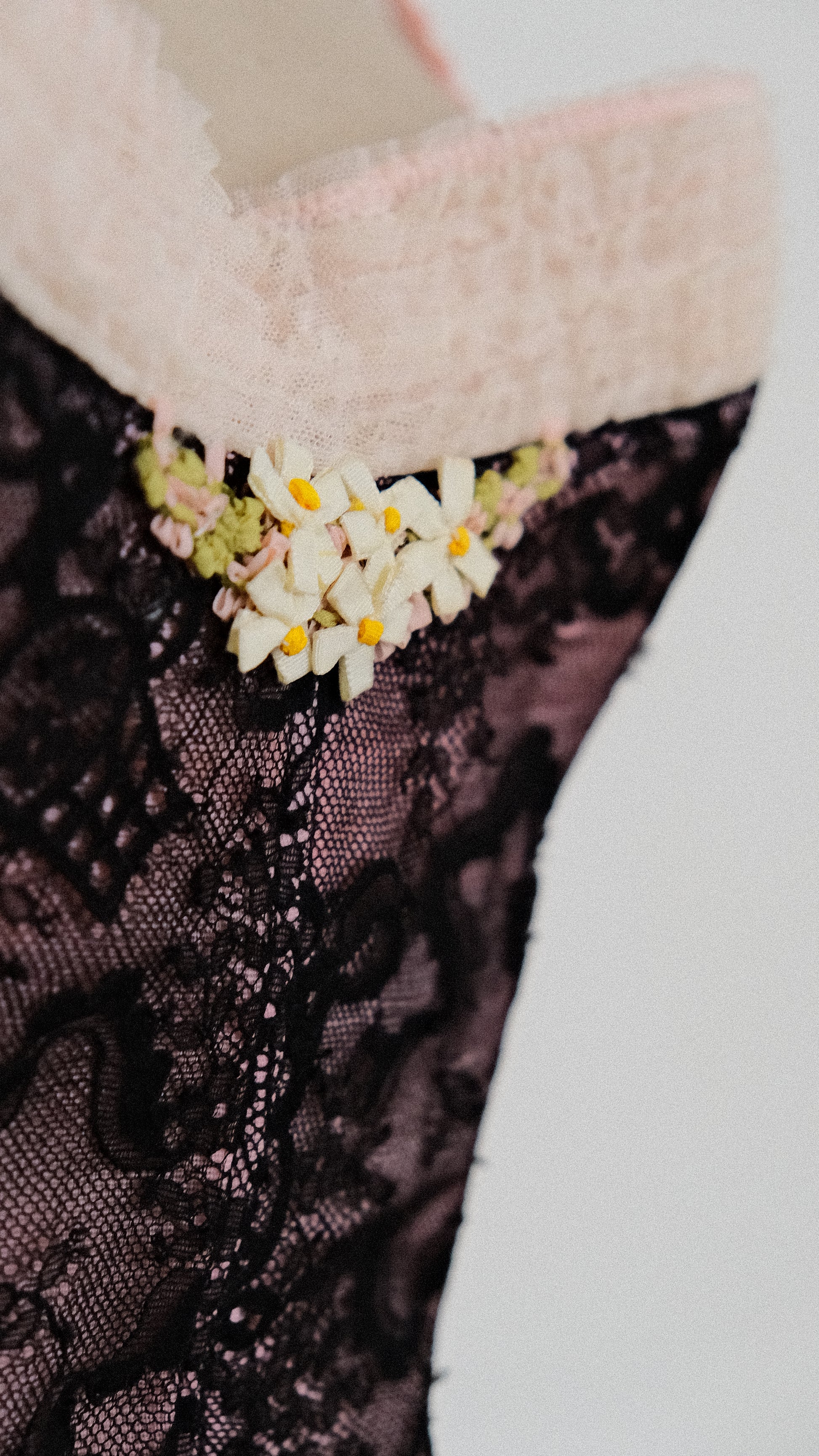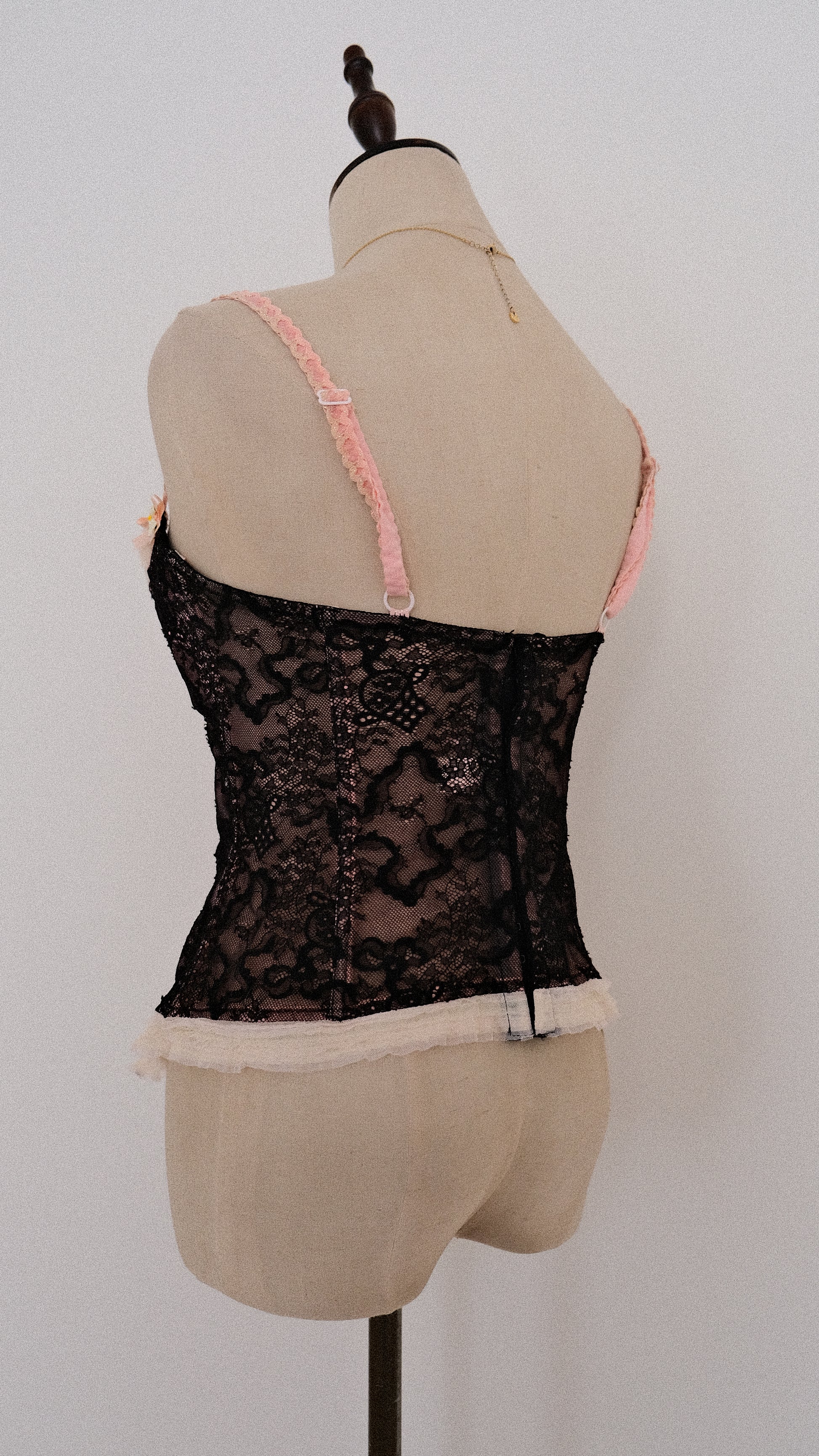 A rare vintage Chantal Thomass dark lace floral corset top with ruffled edges and mini floral details.