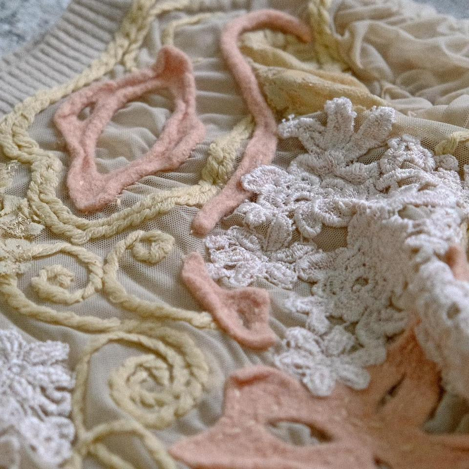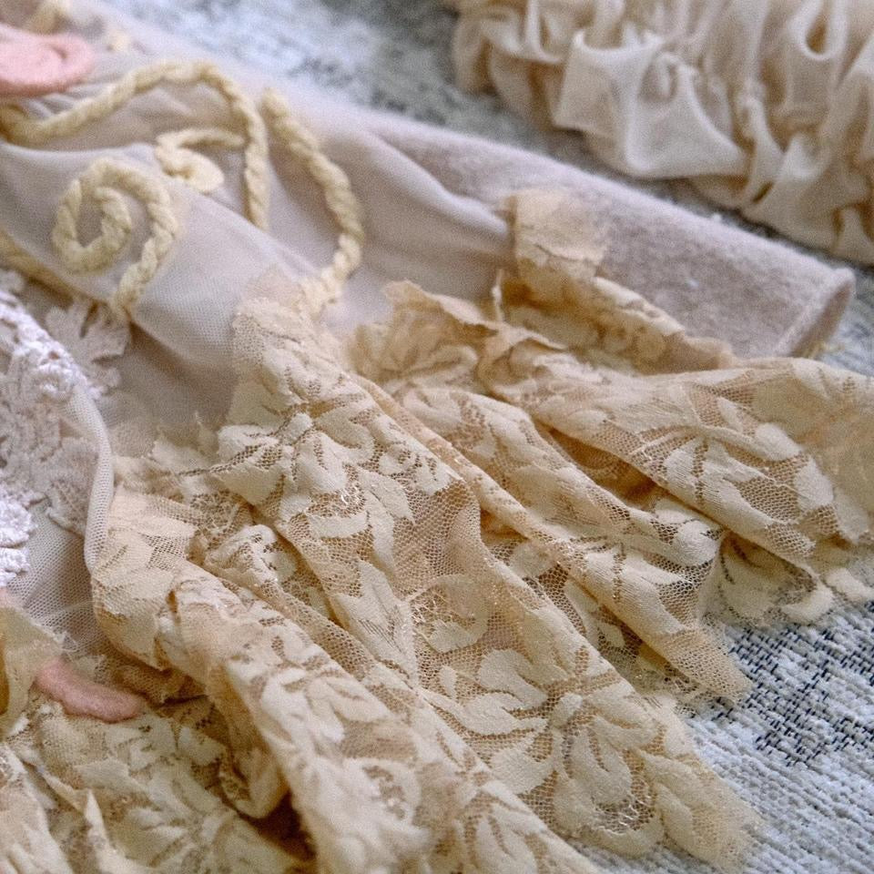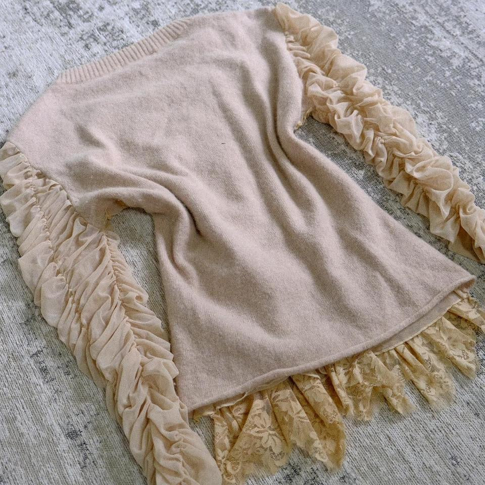 A rare vintage mermaid long sleeve top with mesh rippled sleeves. This top reminds me of coral reefs due to the detailed embroidery patterns.