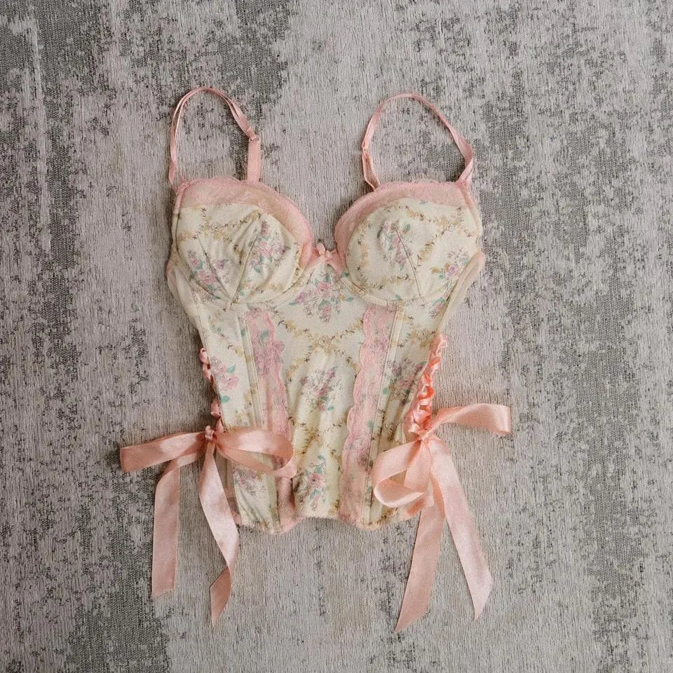 A dainty floral corset adorned with pastel blooms and satin like bows. A cottagecore pinterest dream.
