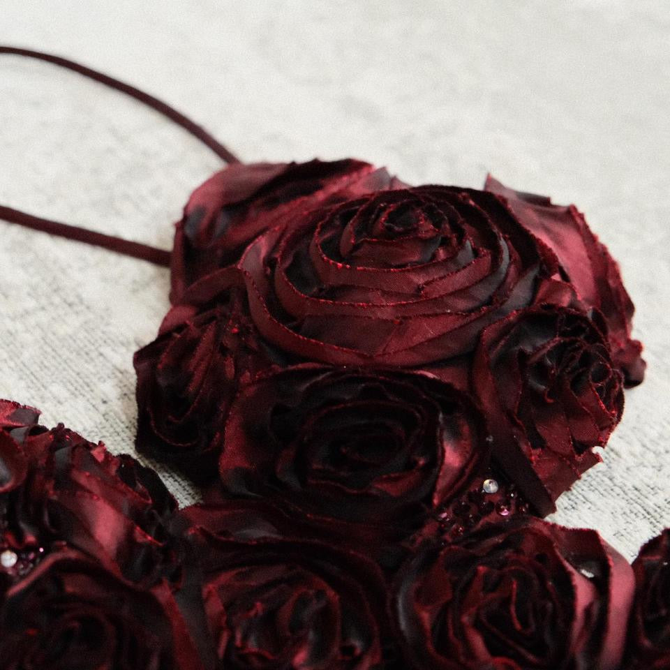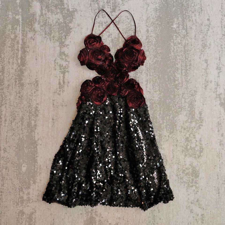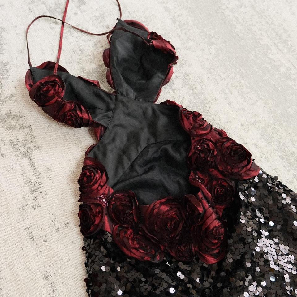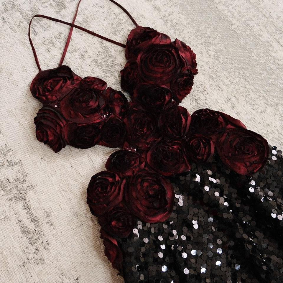 A midnight ball dress in a dark fairytale, rich with wine red roses and romantic spellbound sequins.