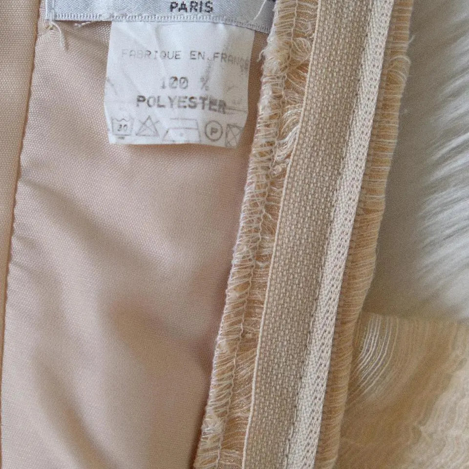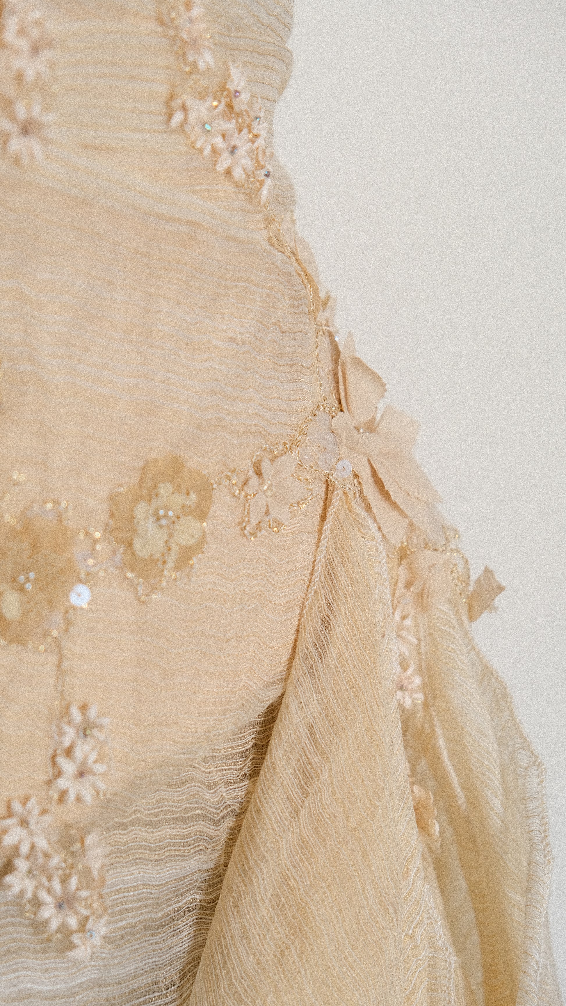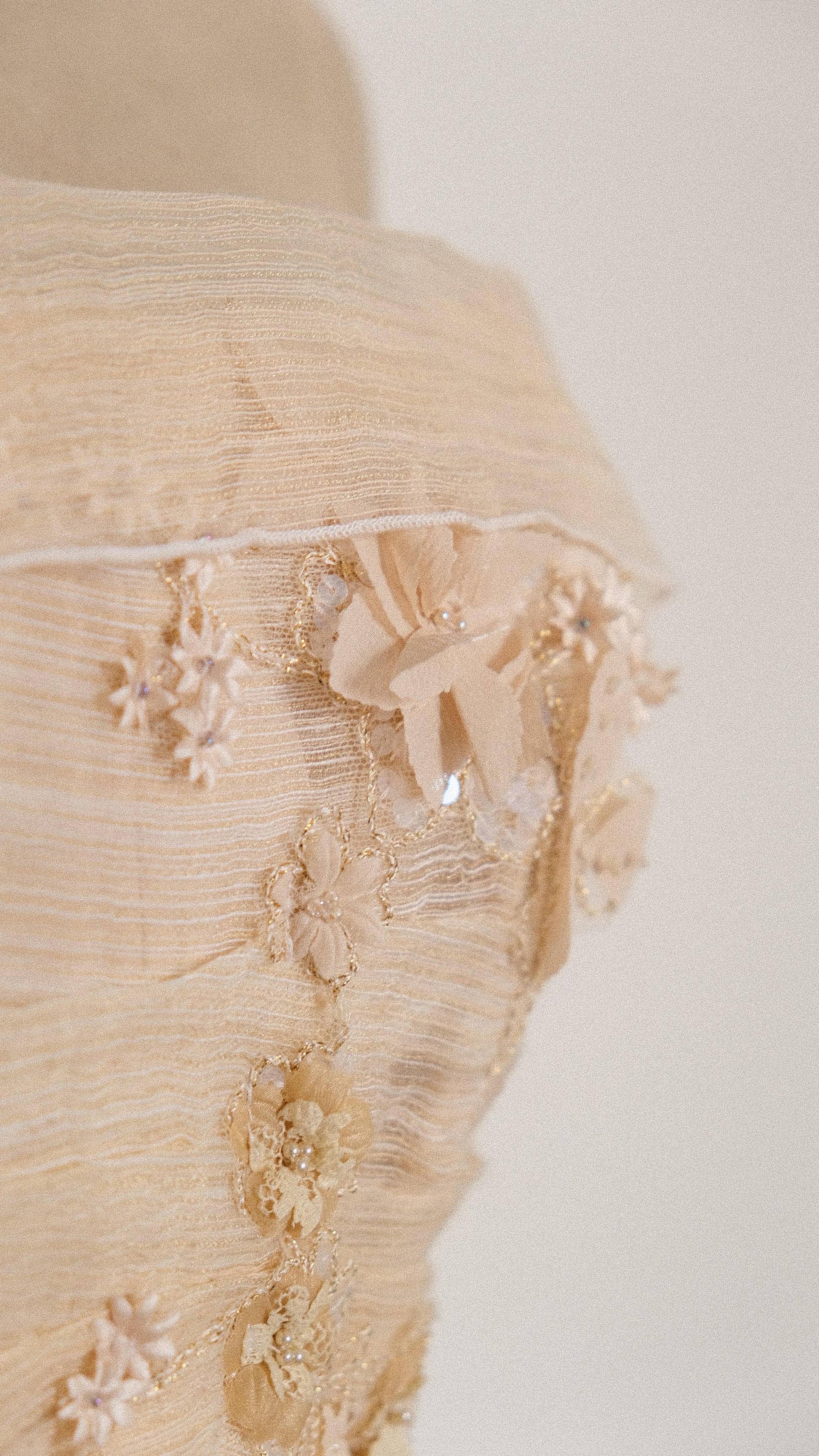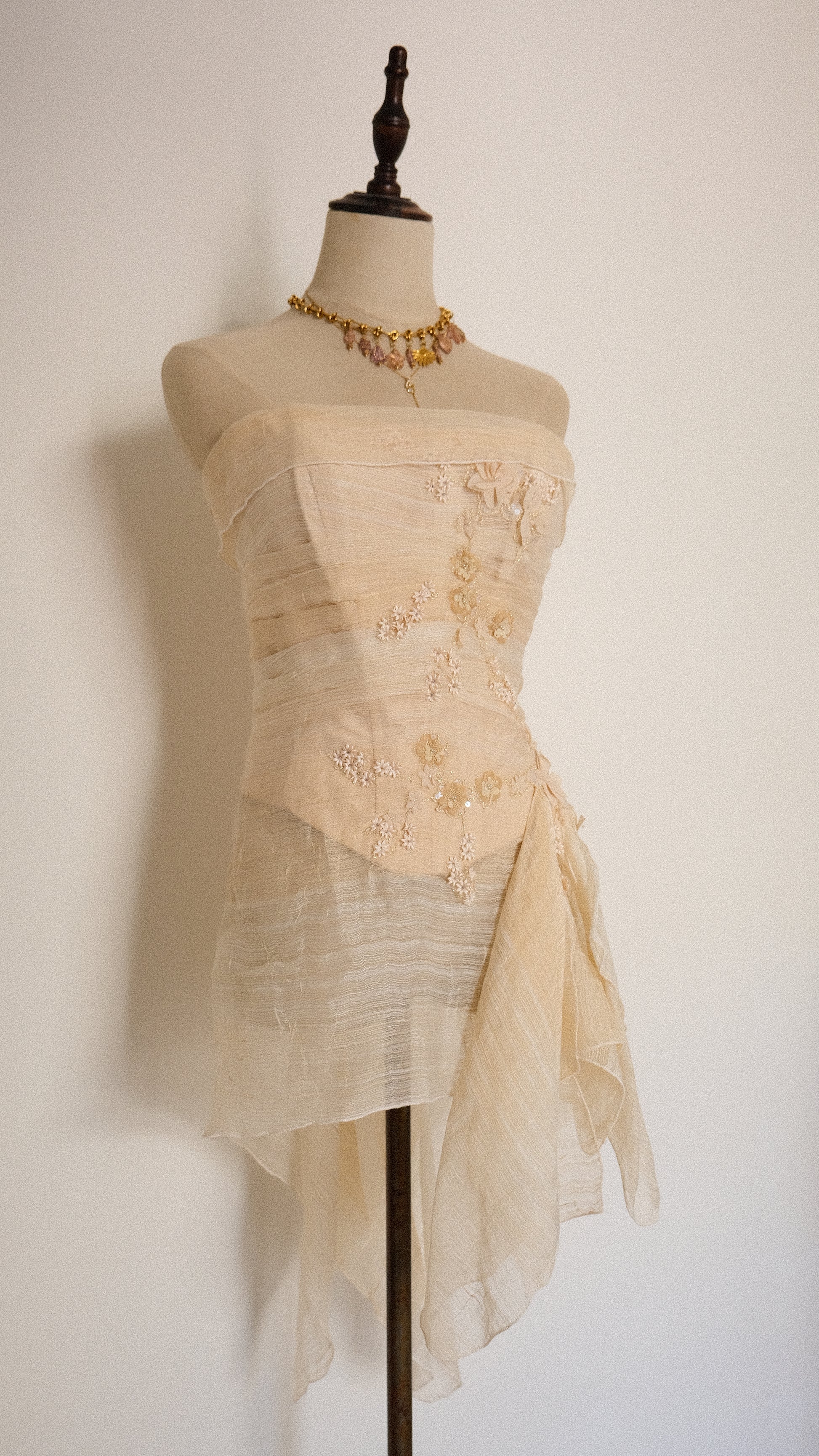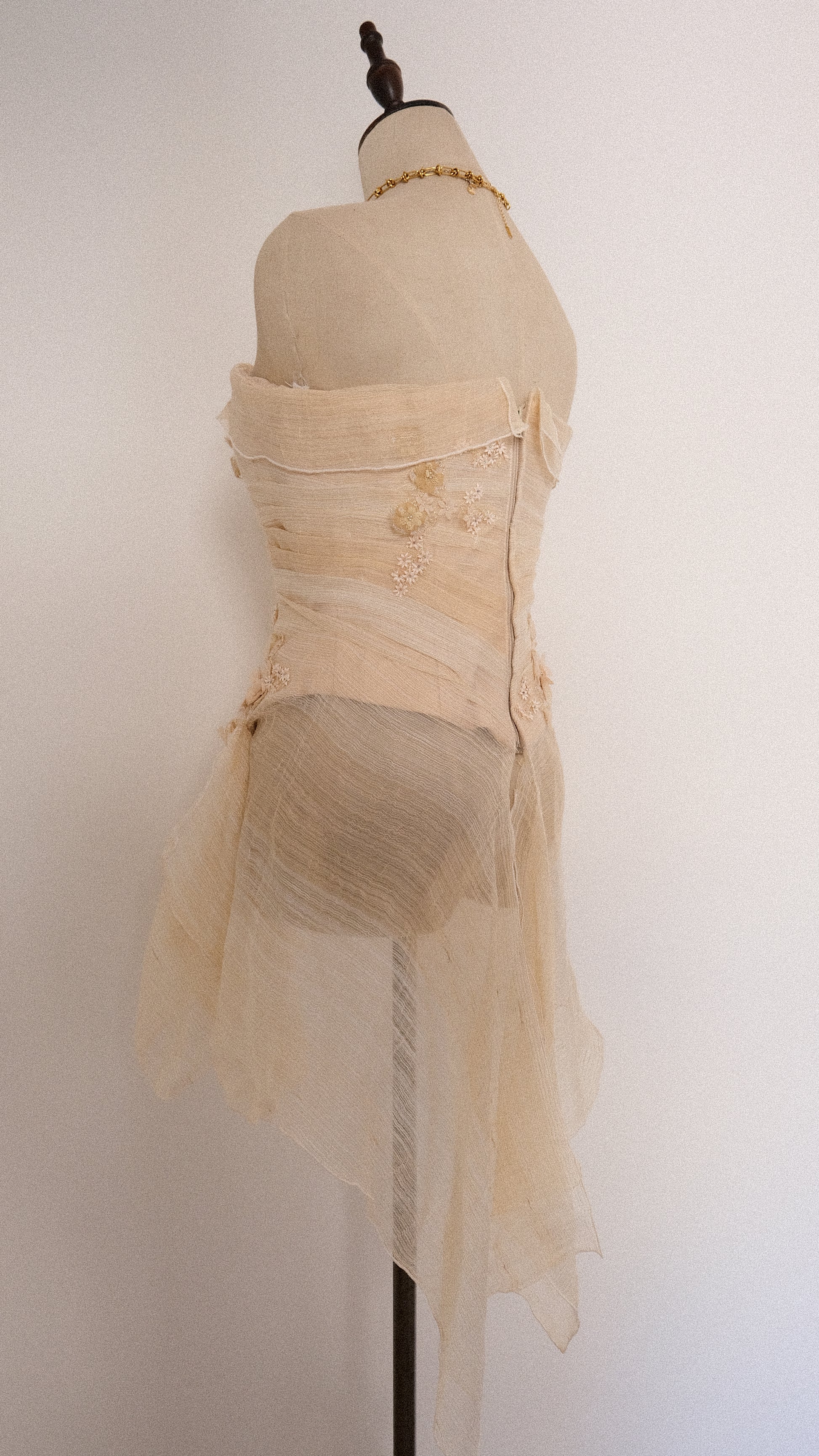 A romantic sand colored bustier top with fluttering material at the bottom and the most beautiful and enchanted flower details. The longer fabric is located at the back of the top, while the shorter fluttering fabrics are located at the front.