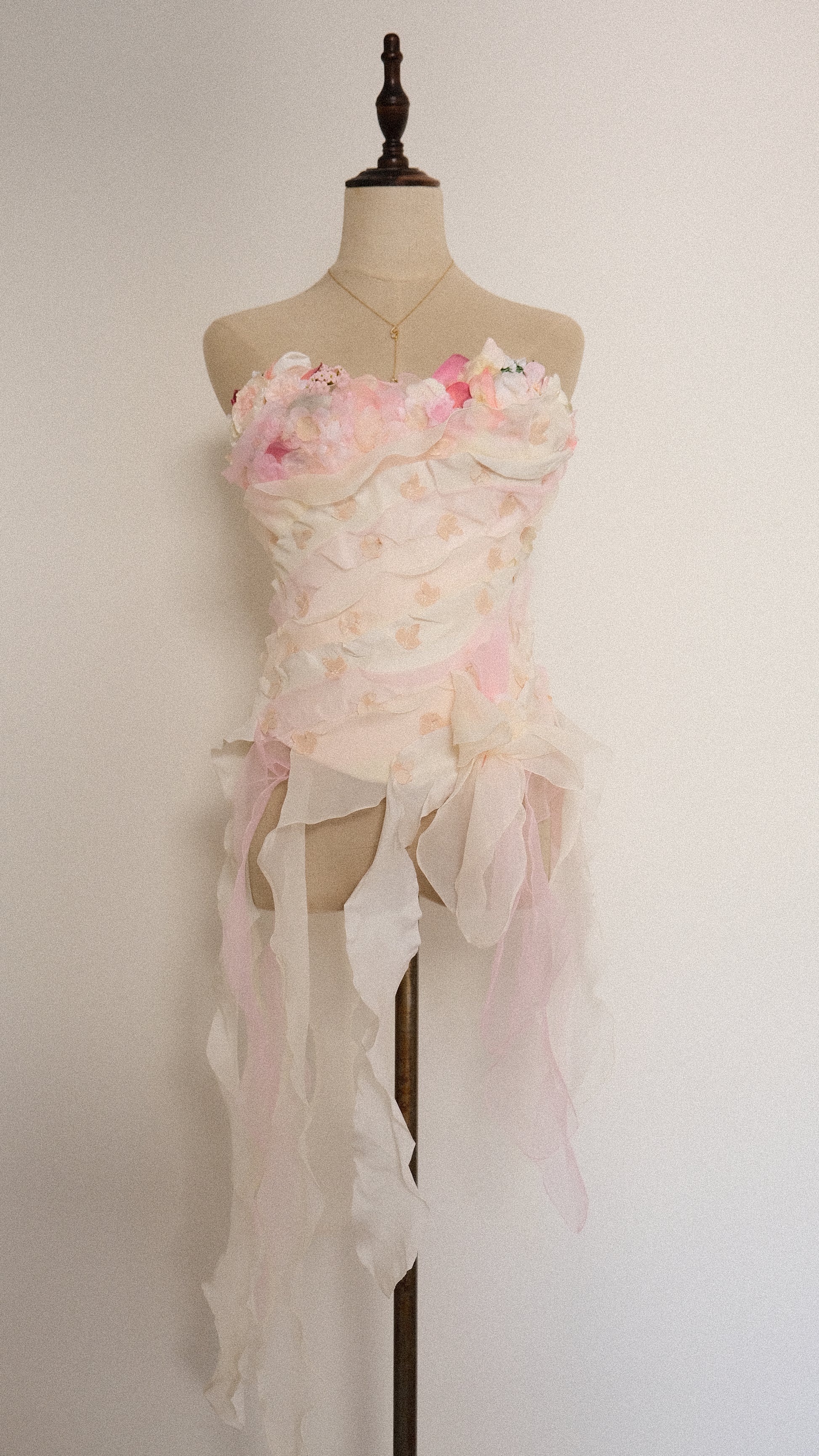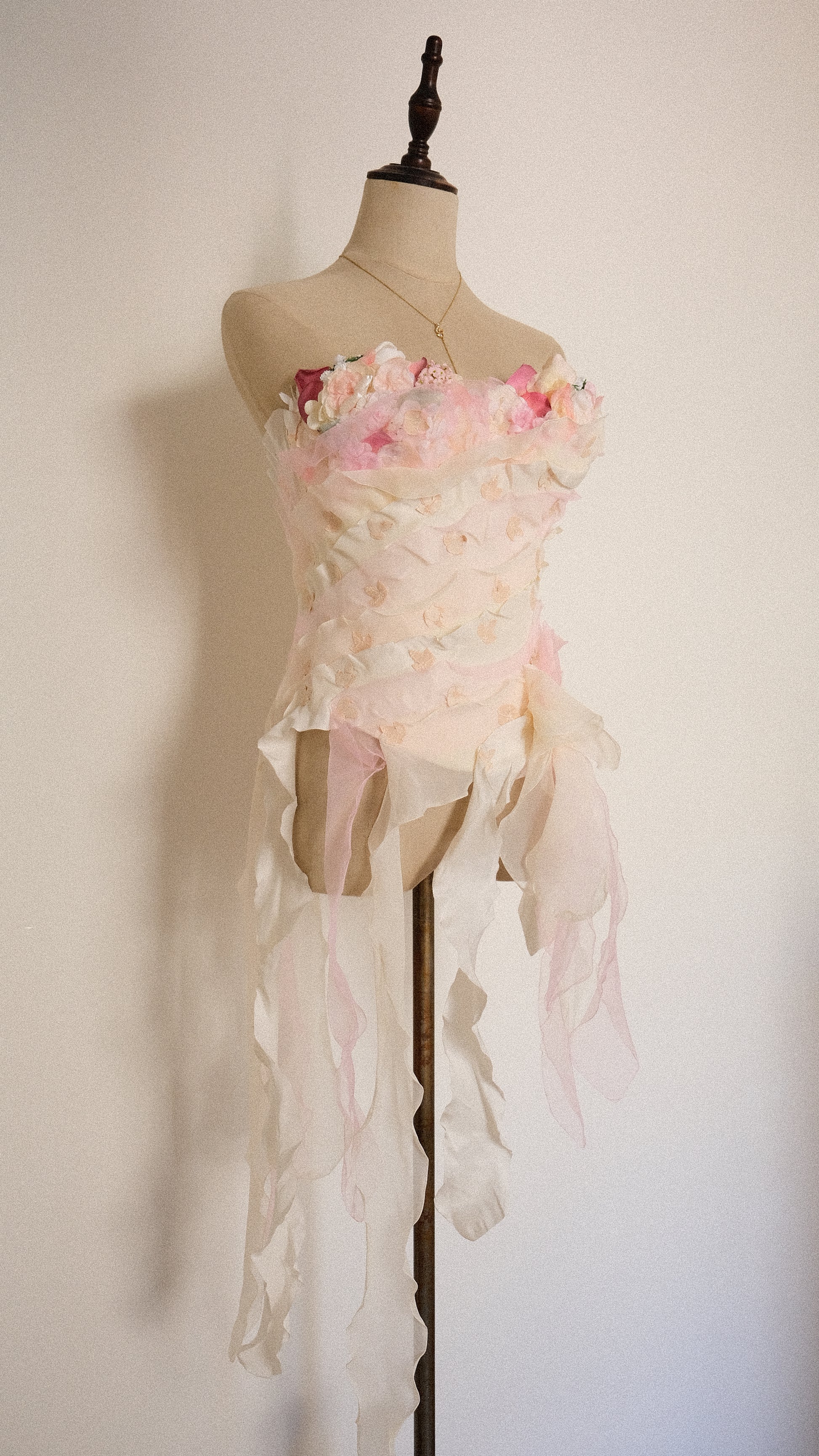 A romantic and enchanted floral corset top with flower detailing at the cups, petals around the waist and beautiful jellyfish strings at the bottom.