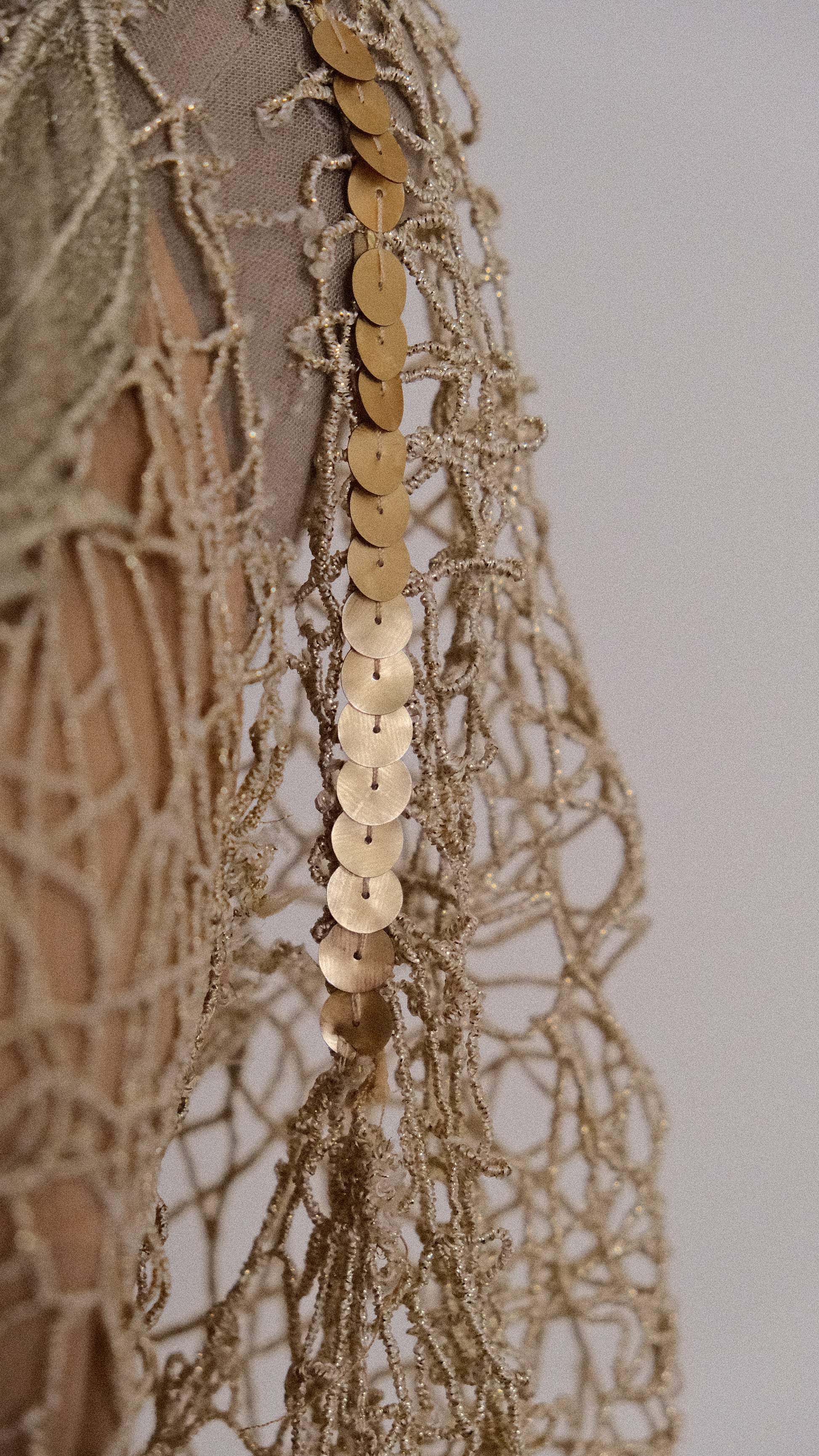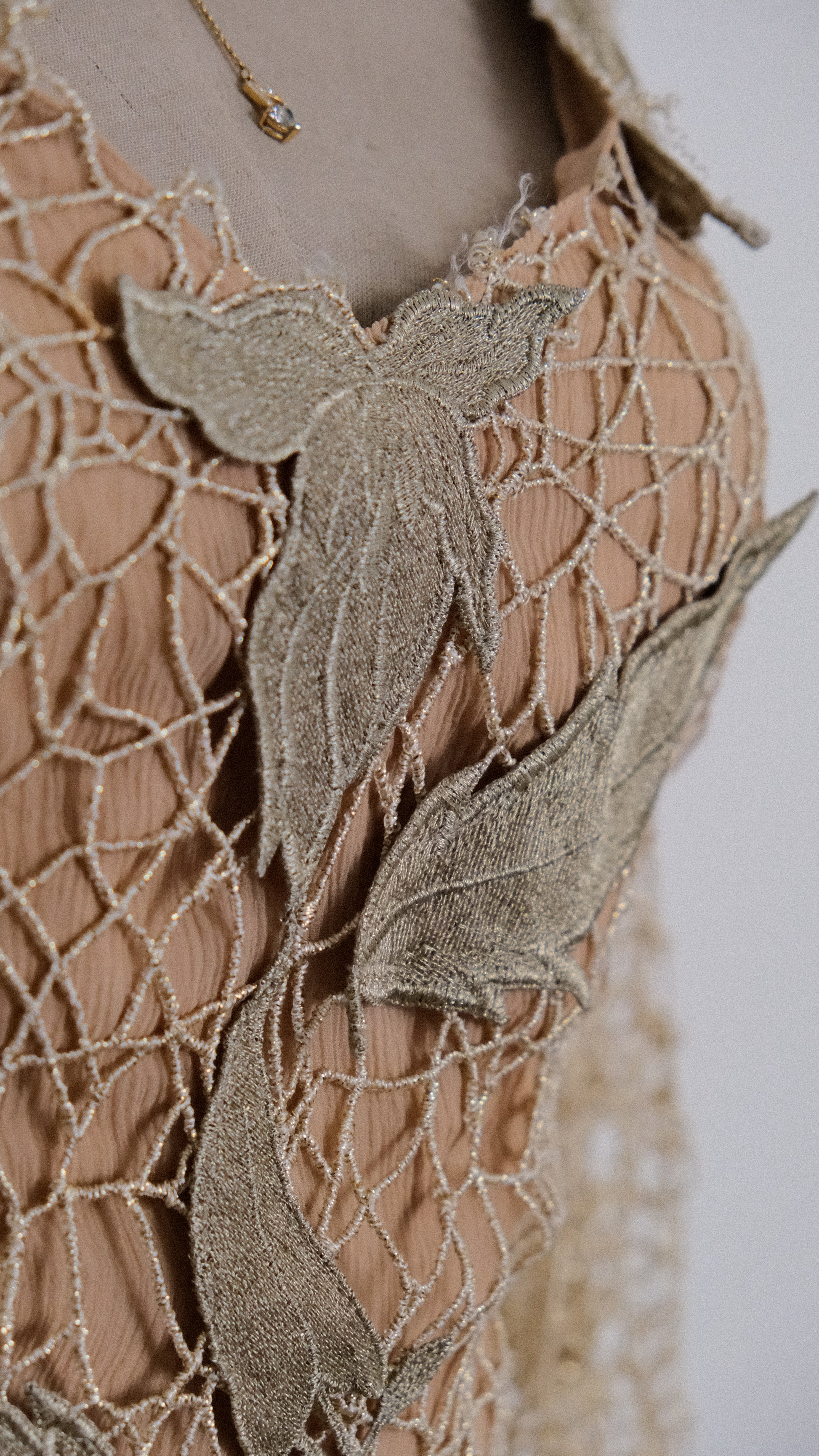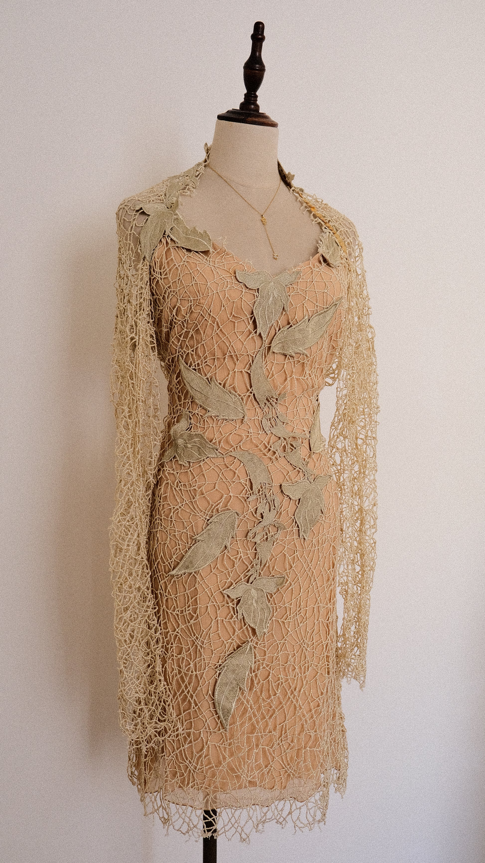 A rare and insane 2 piece set: a romantic fairycore dress with matching bolero, both draped in golden nets and leaf detailing.