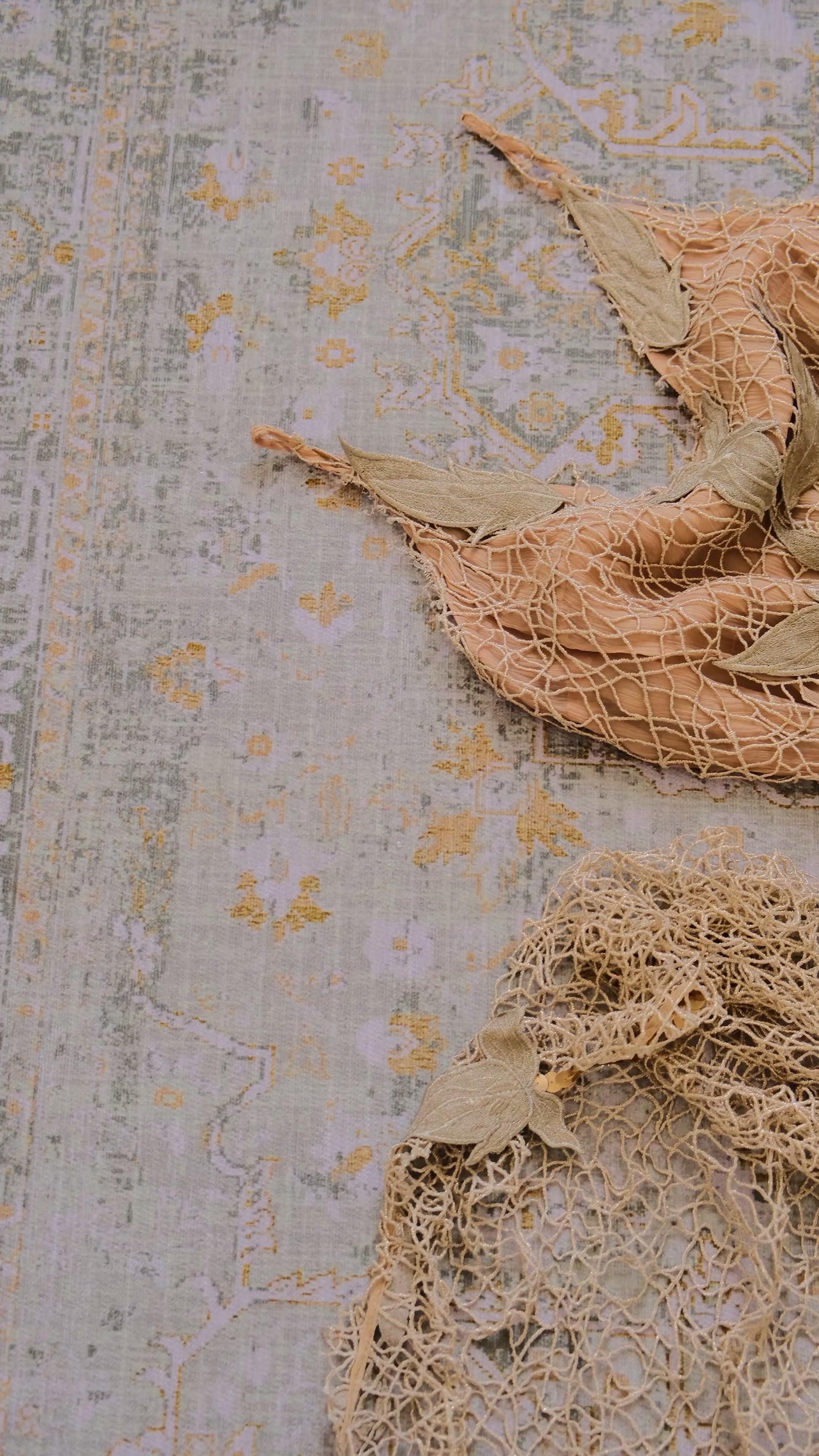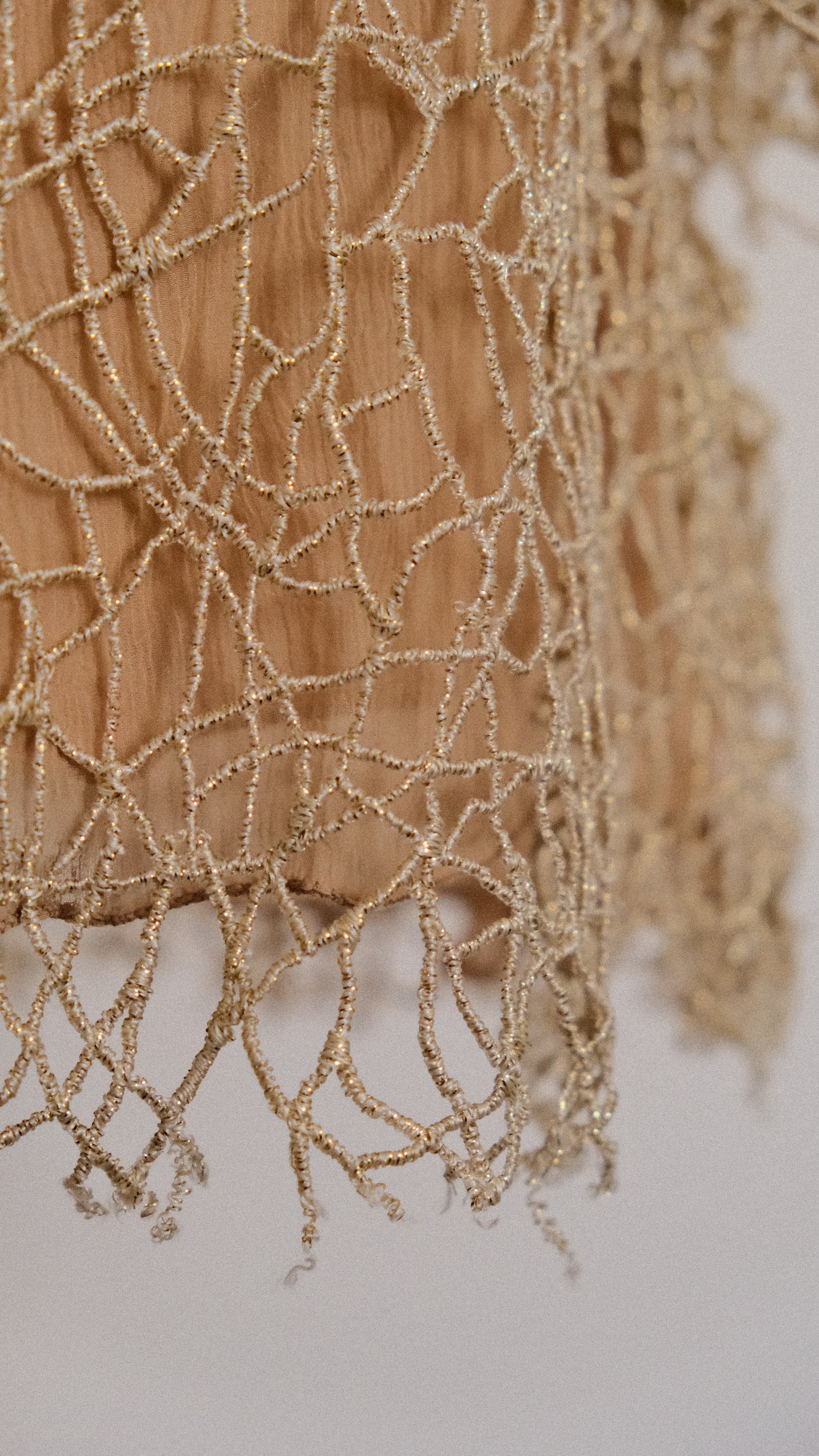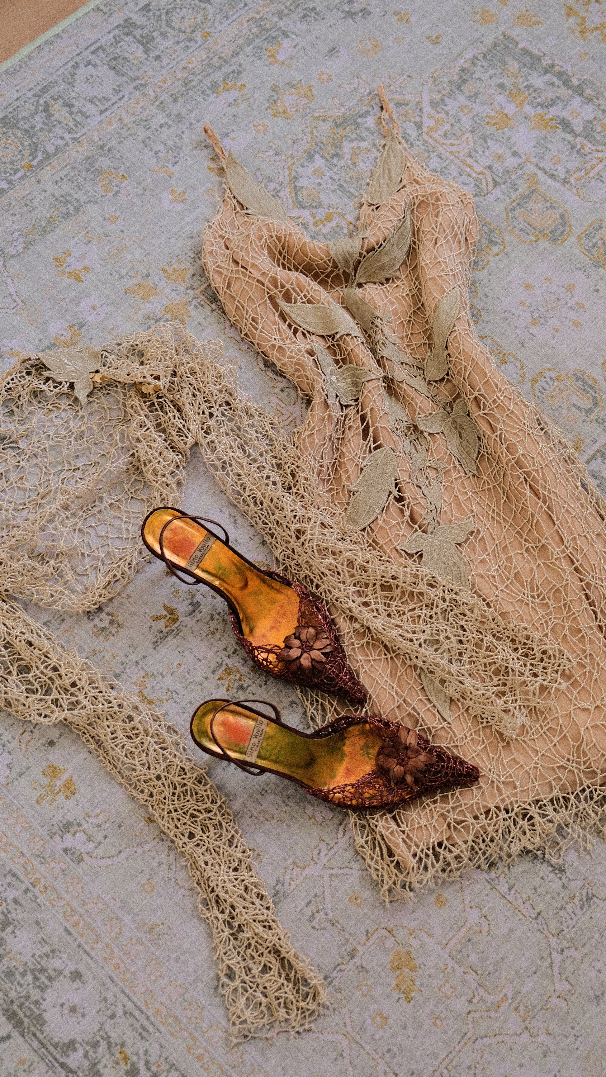 A rare and insane 2 piece set: a romantic fairycore dress with matching bolero, both draped in golden nets and leaf detailing.