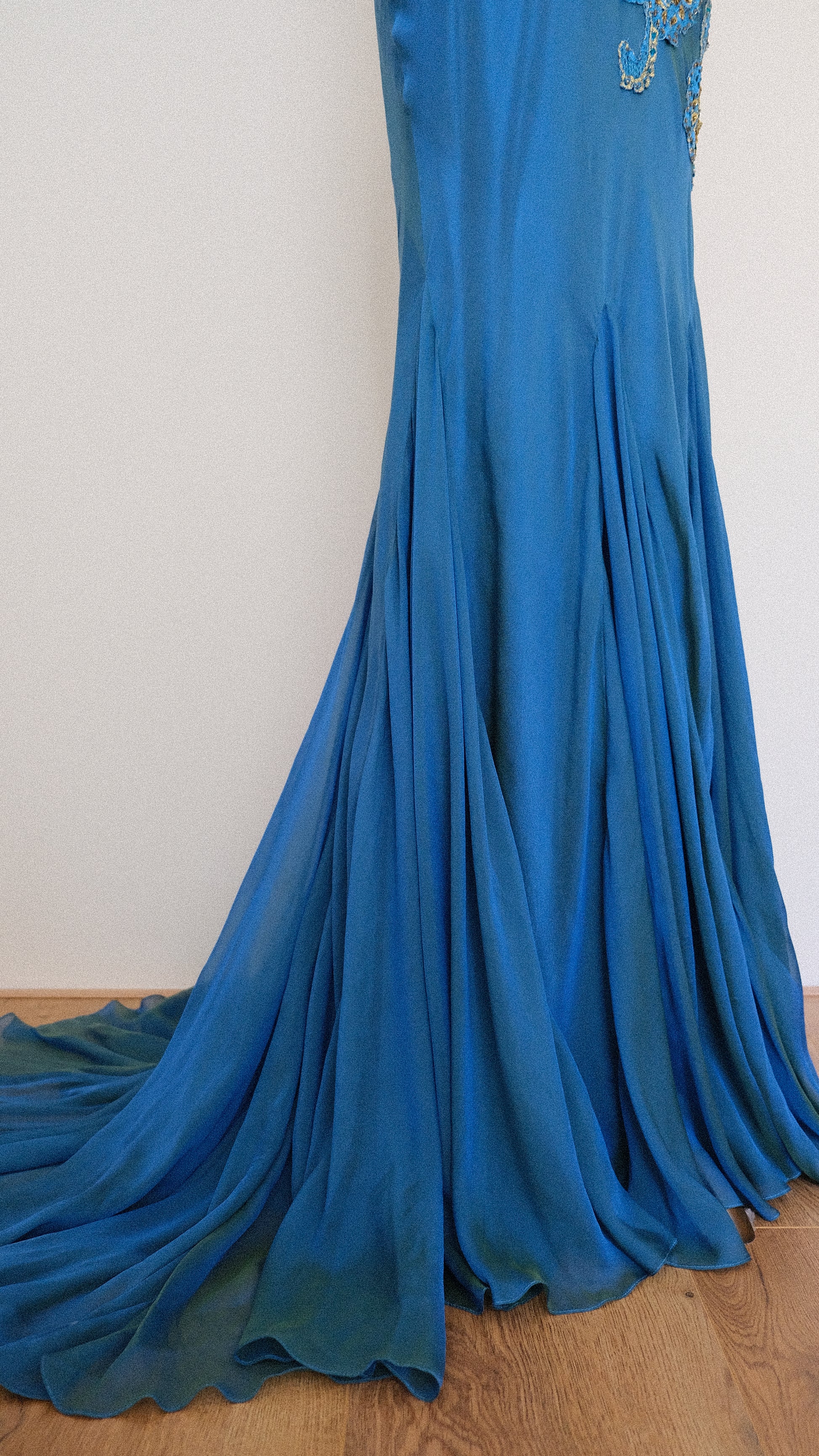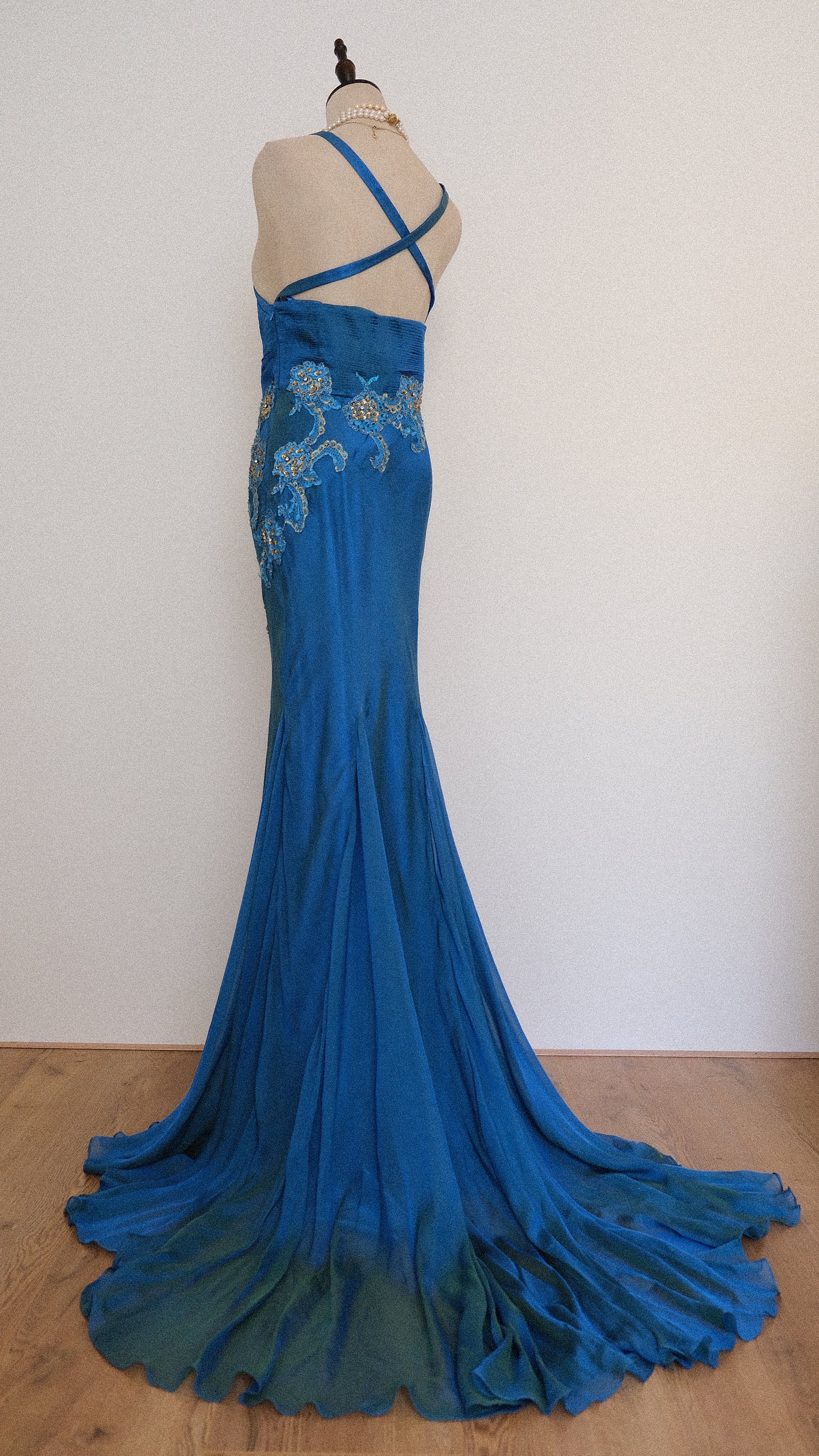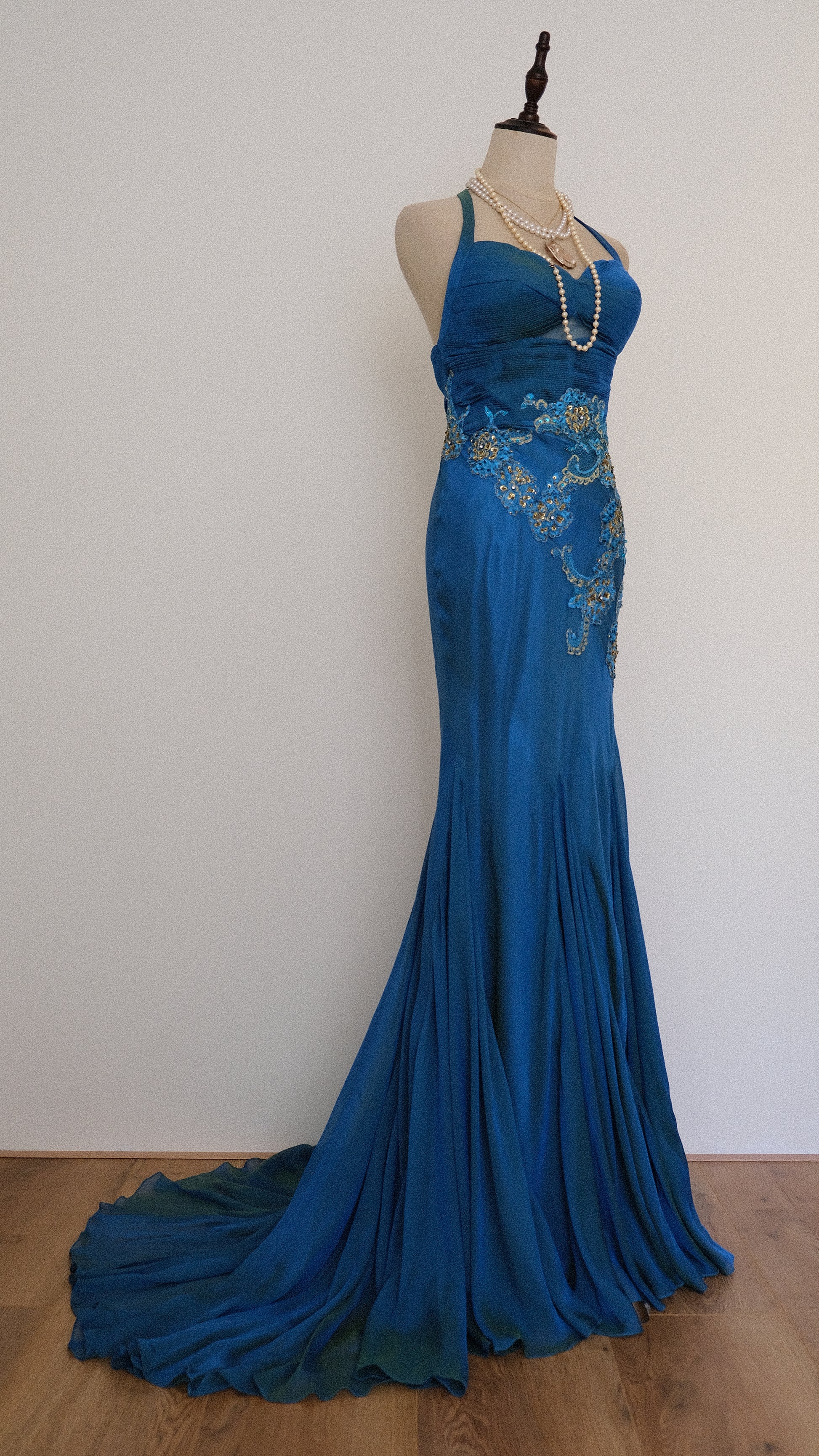 A rare ultimate 100% silk mermaid evening gown with romantic oceanic detailing around the waist and pleated cups.