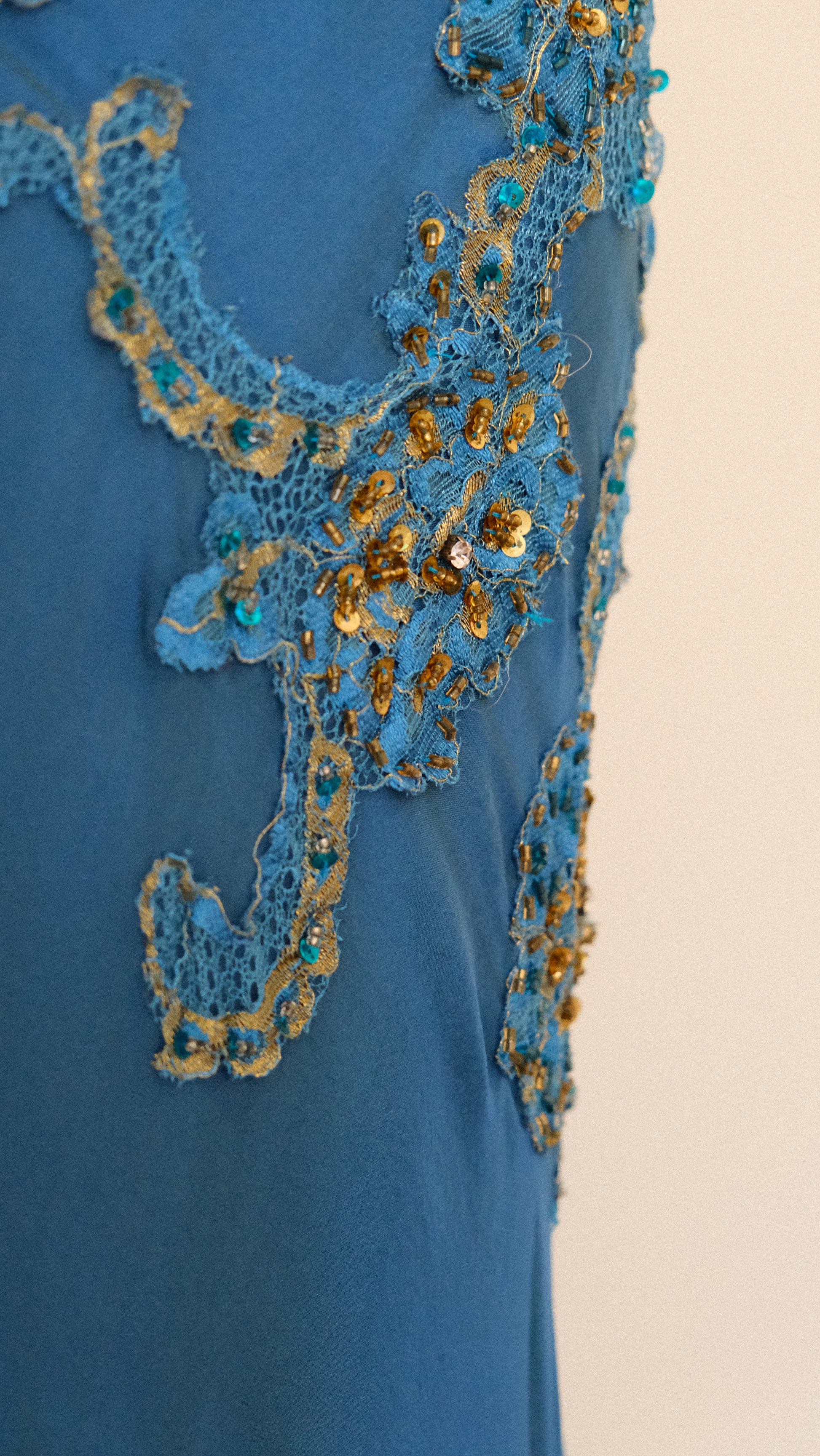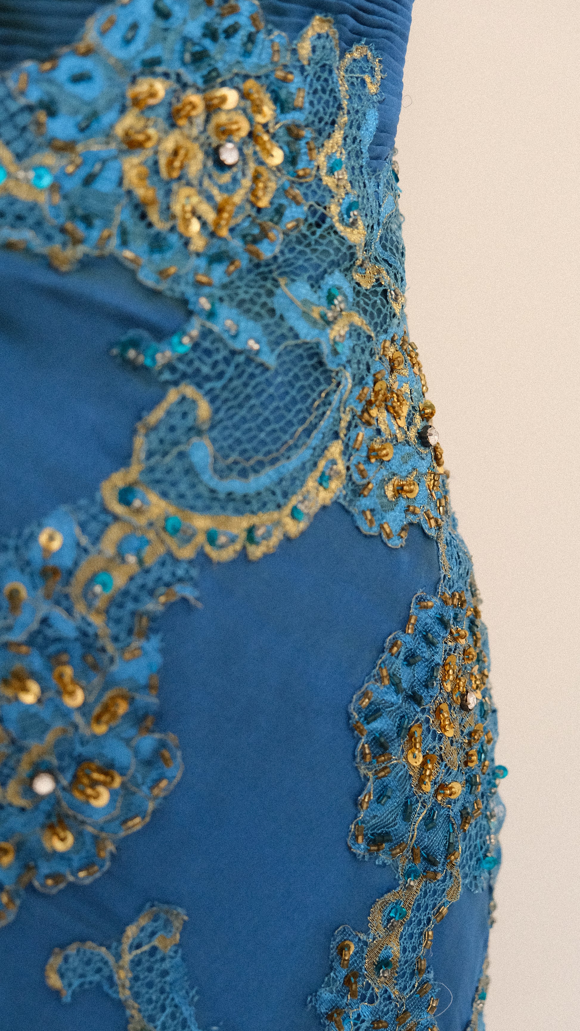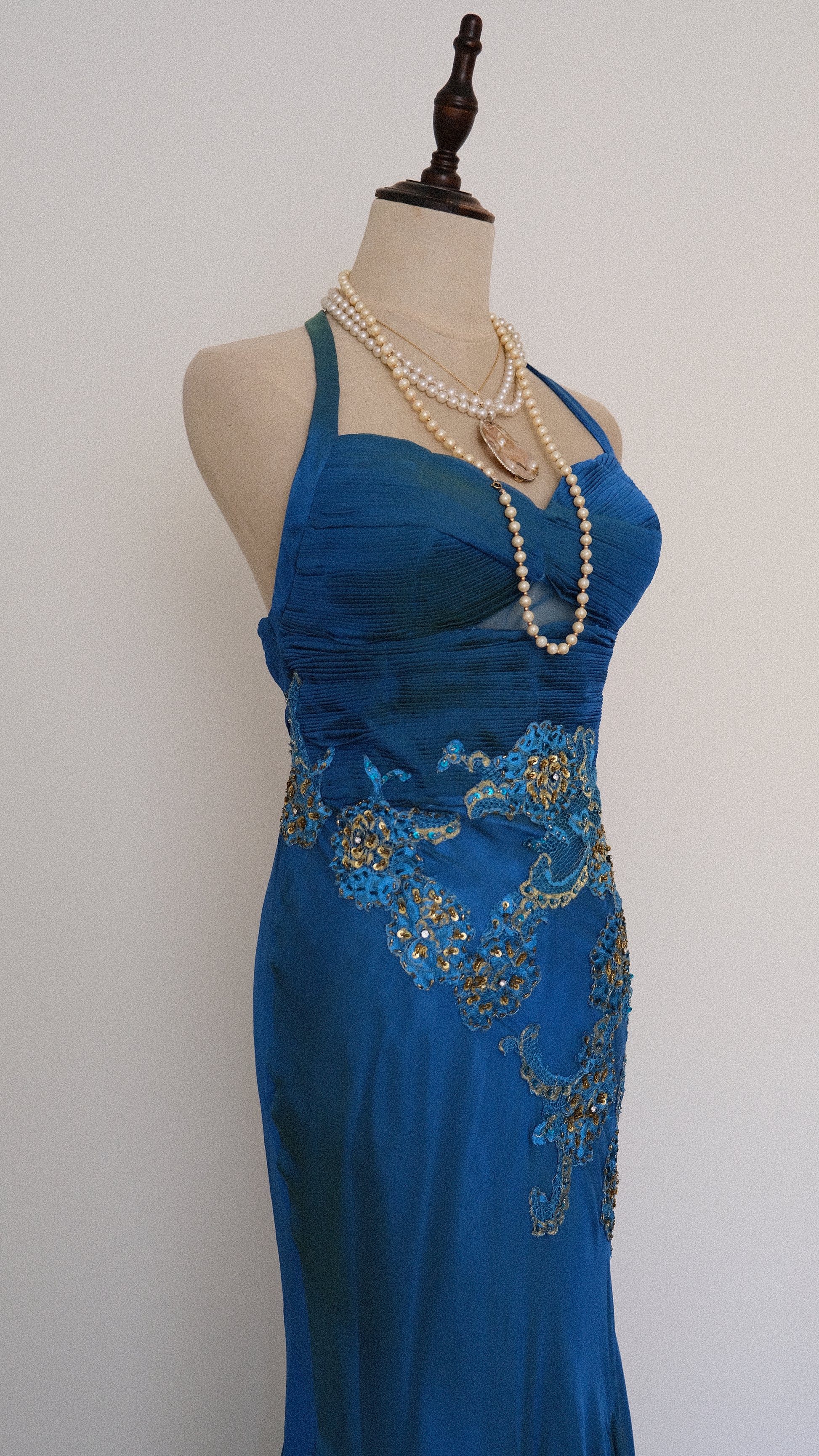 A rare ultimate 100% silk mermaid evening gown with romantic oceanic detailing around the waist and pleated cups.