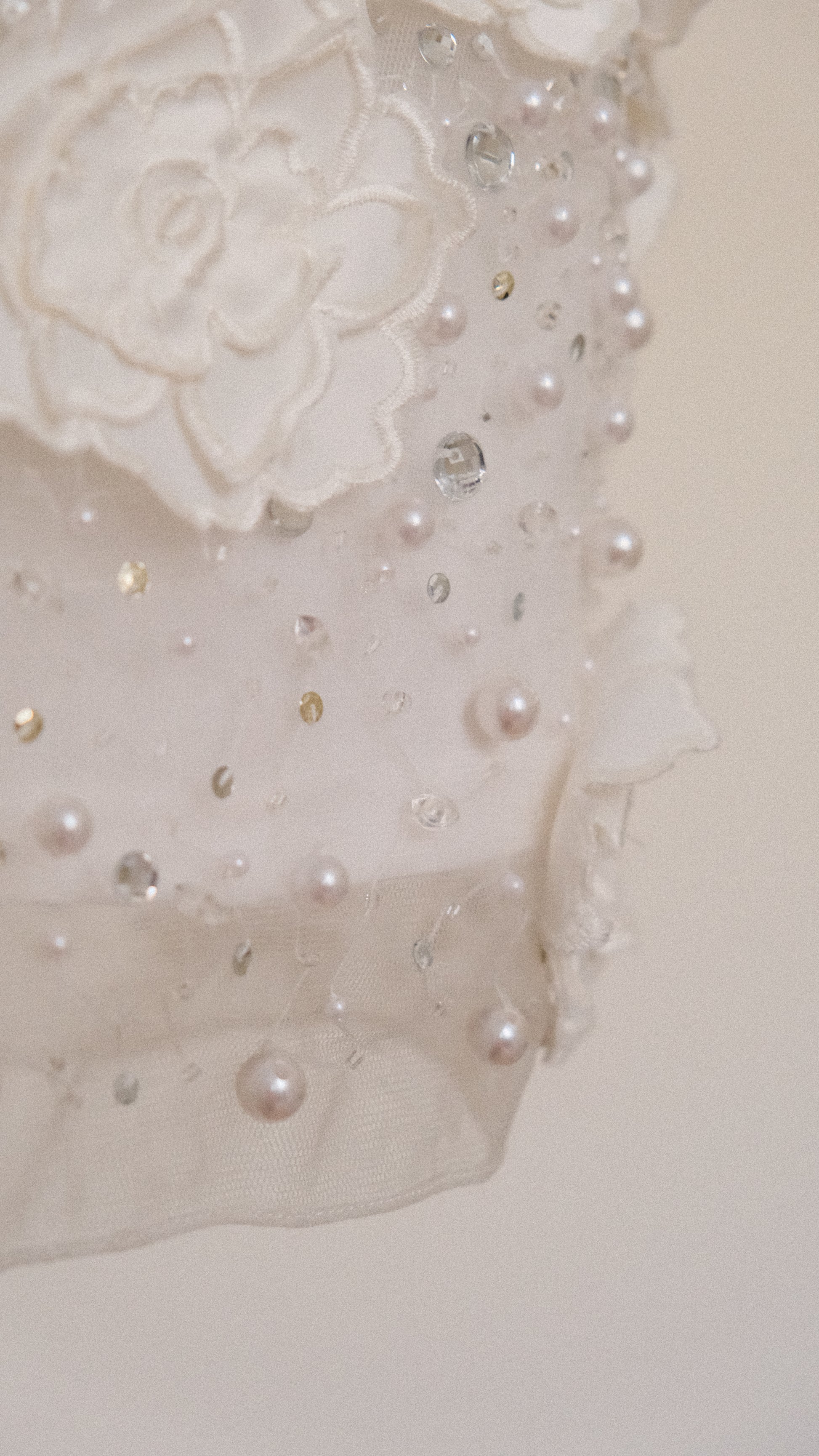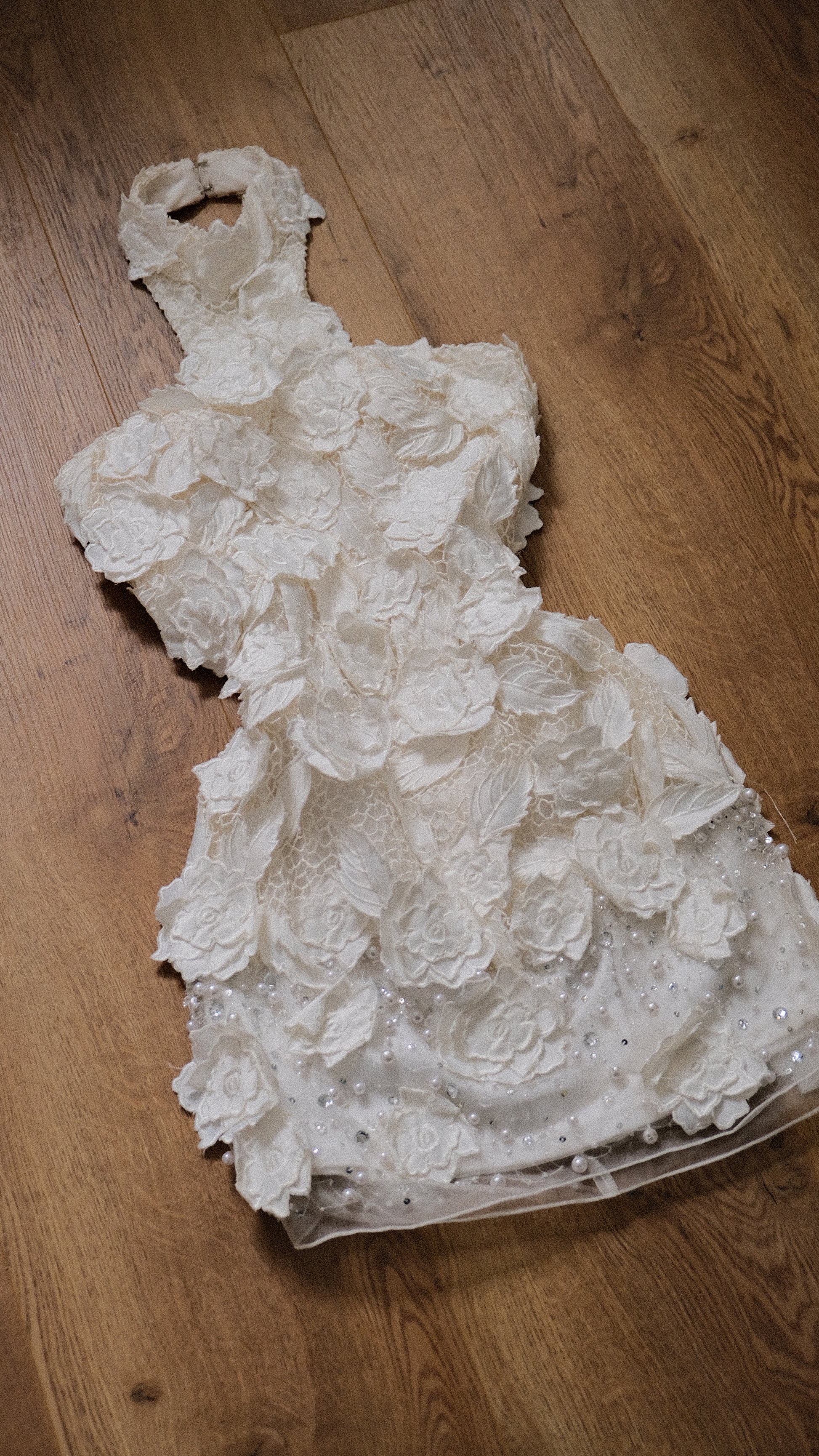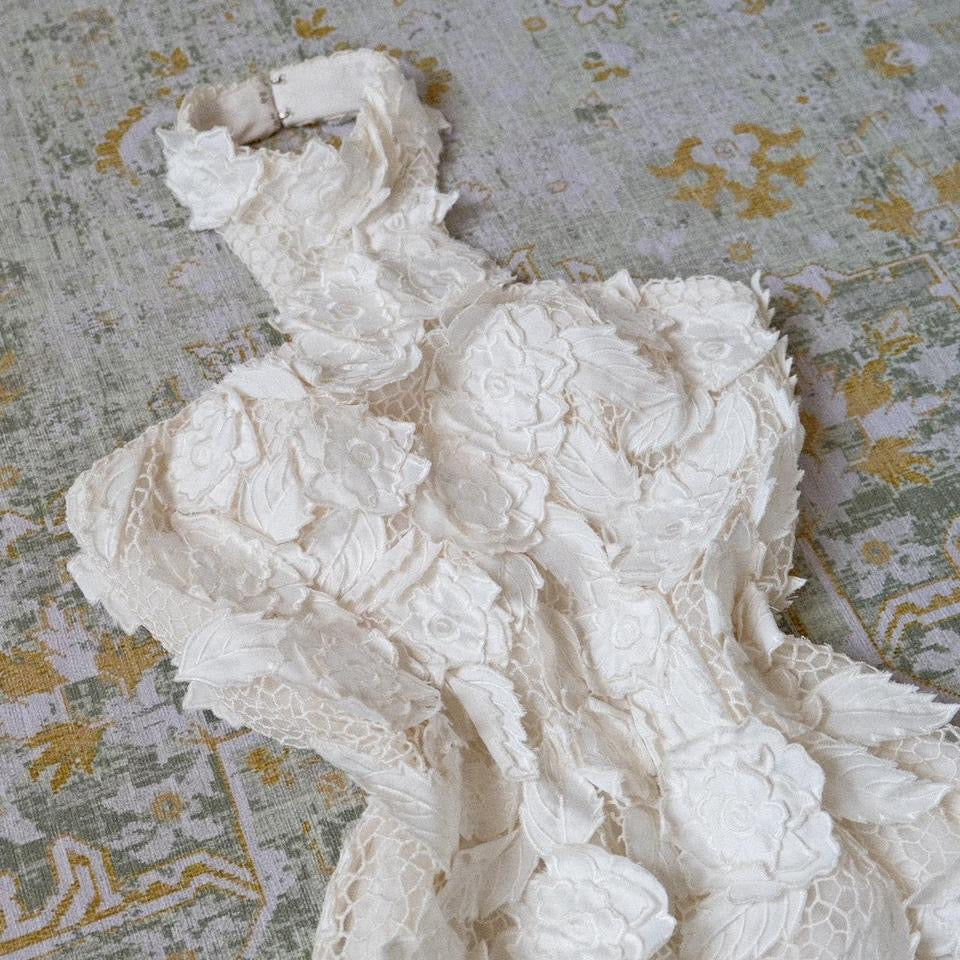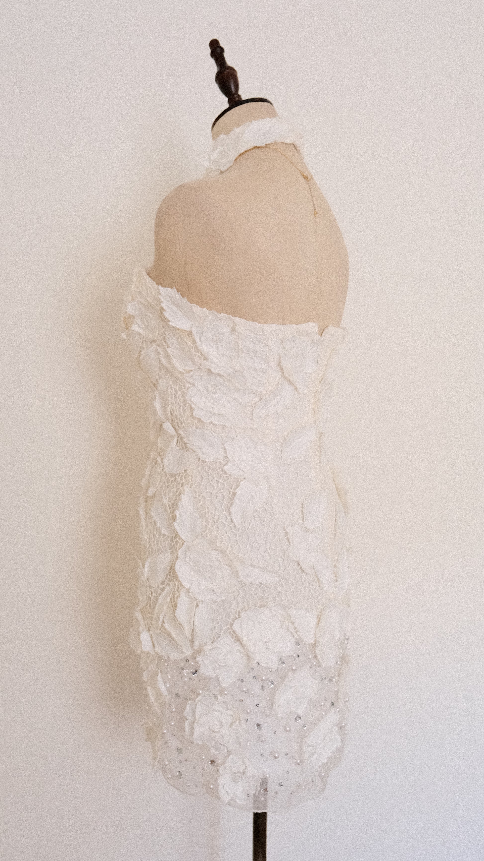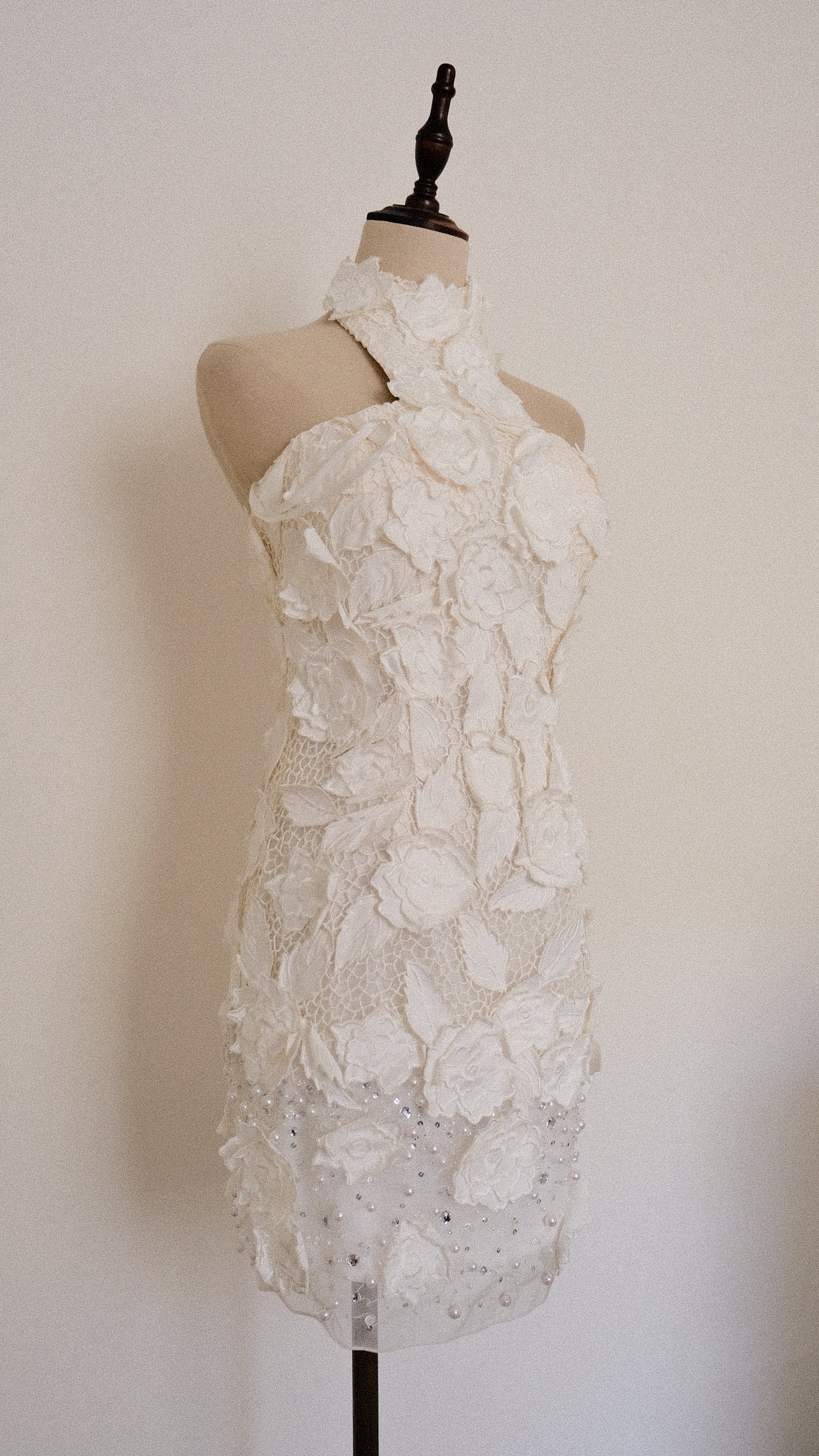 A rare and highly detailed fairycore bridal mini halterdress with the most insane floral, nets, mesh and embellished detailing.