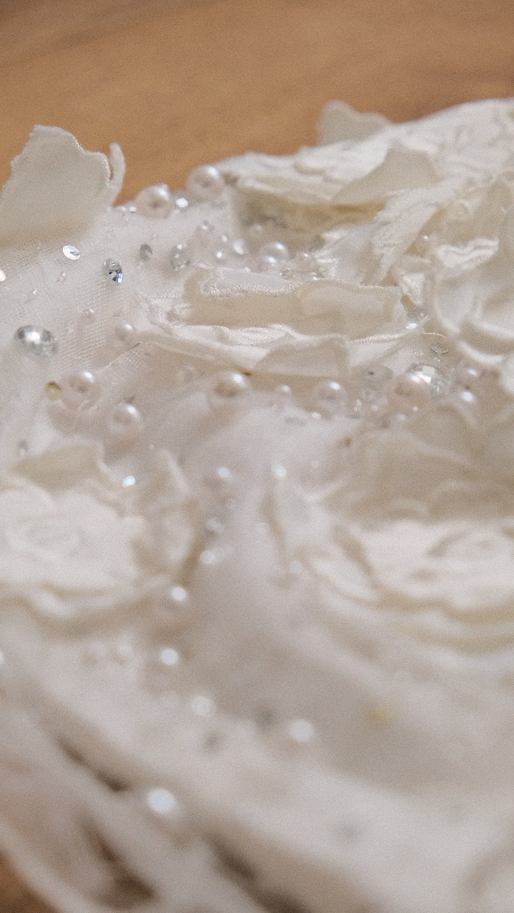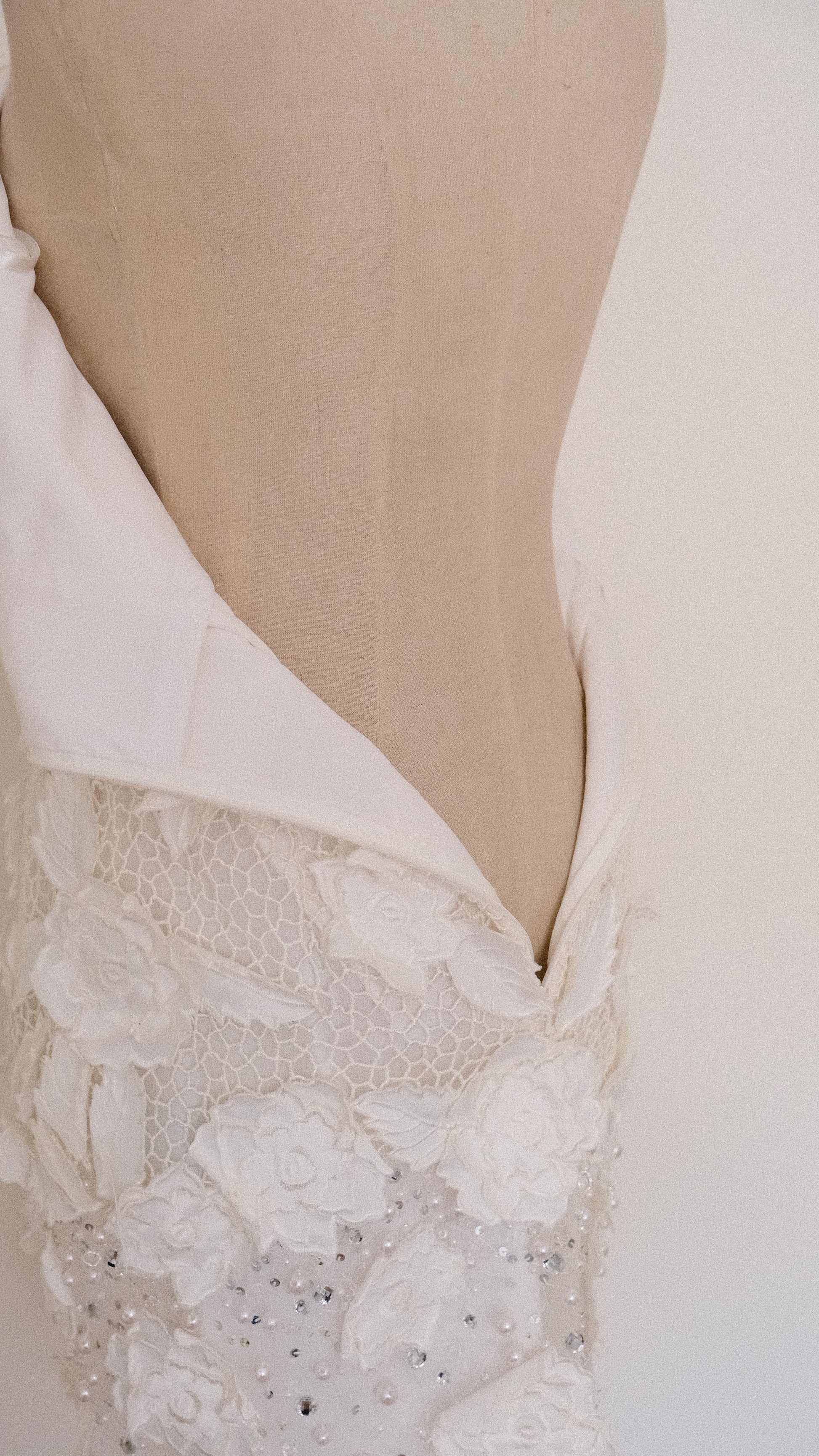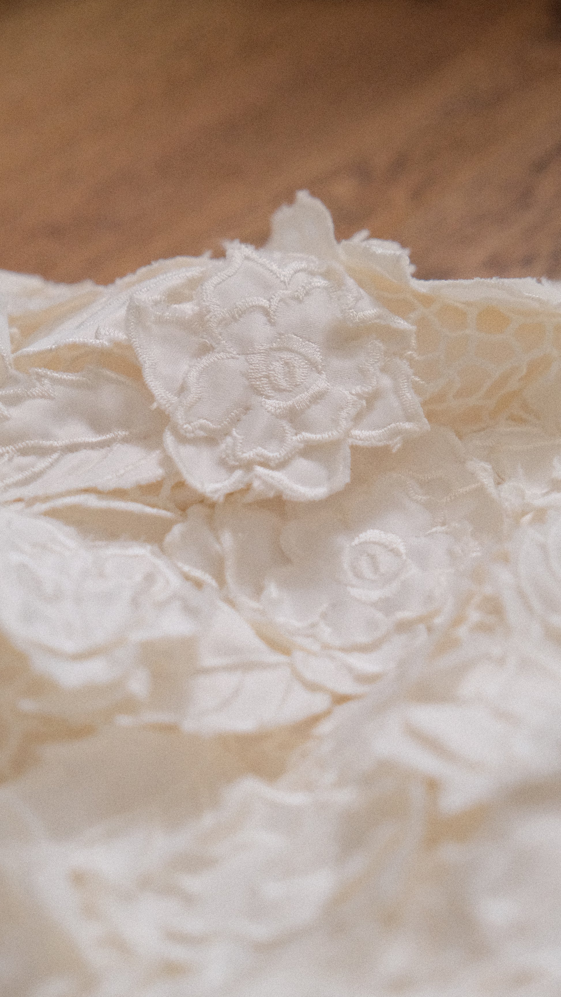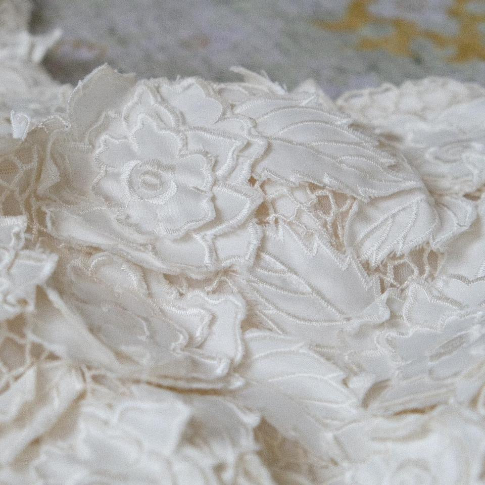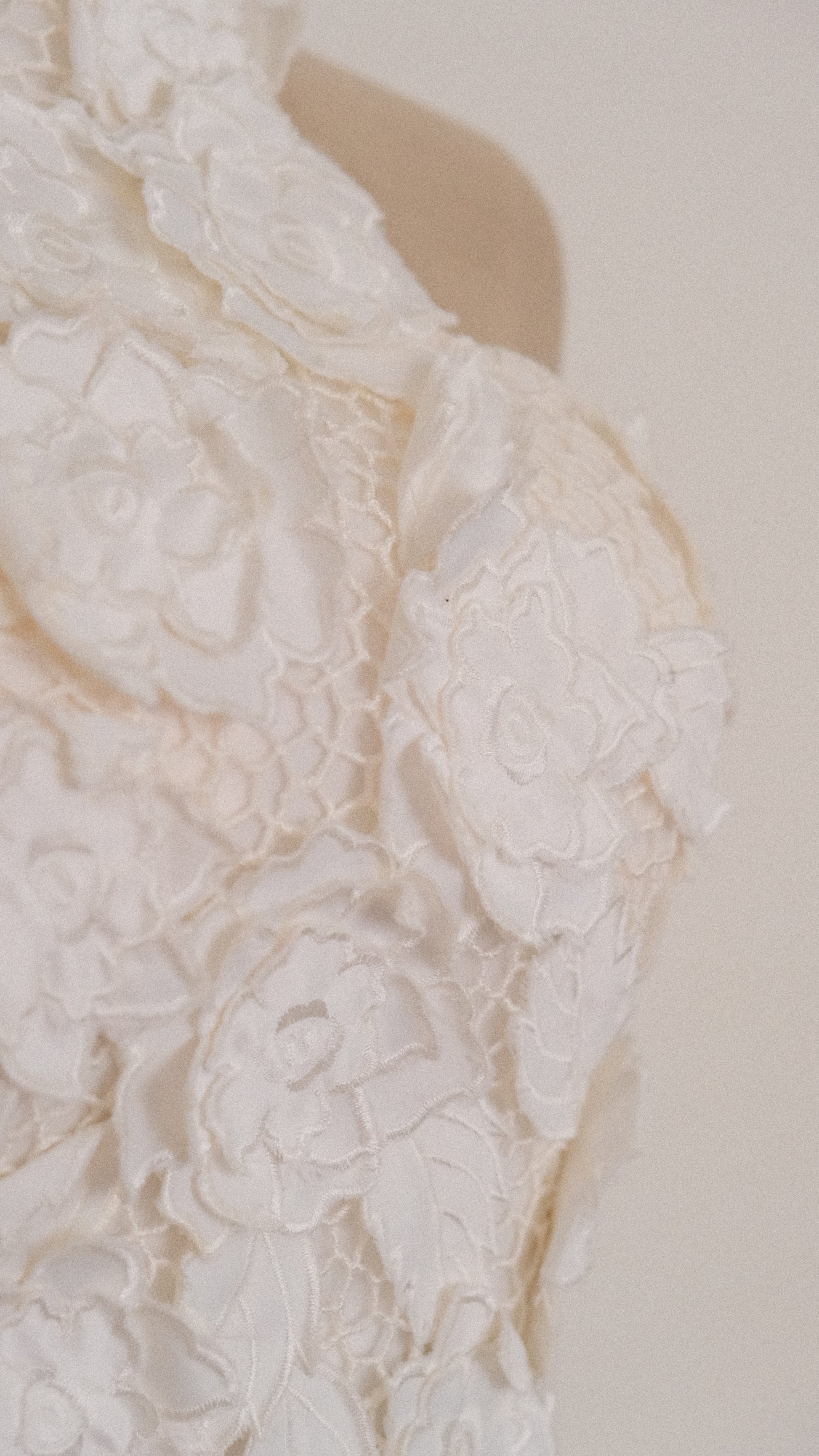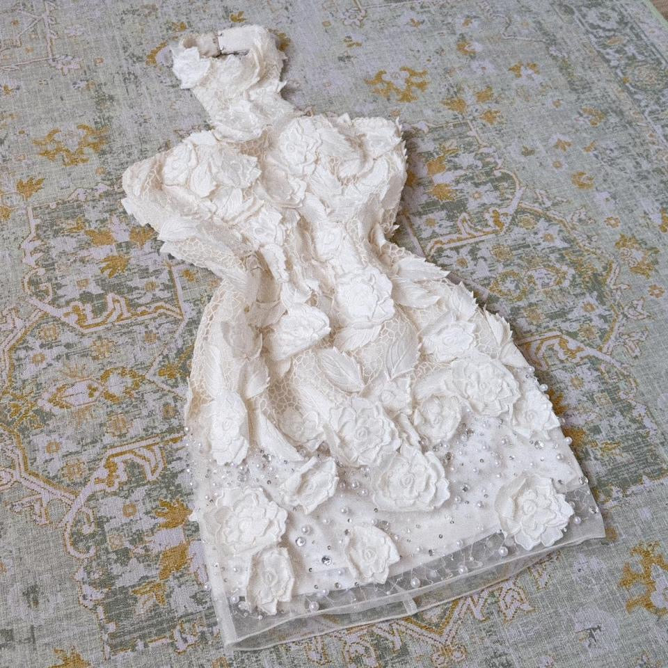 A rare and highly detailed fairycore bridal mini halterdress with the most insane floral, nets, mesh and embellished detailing.