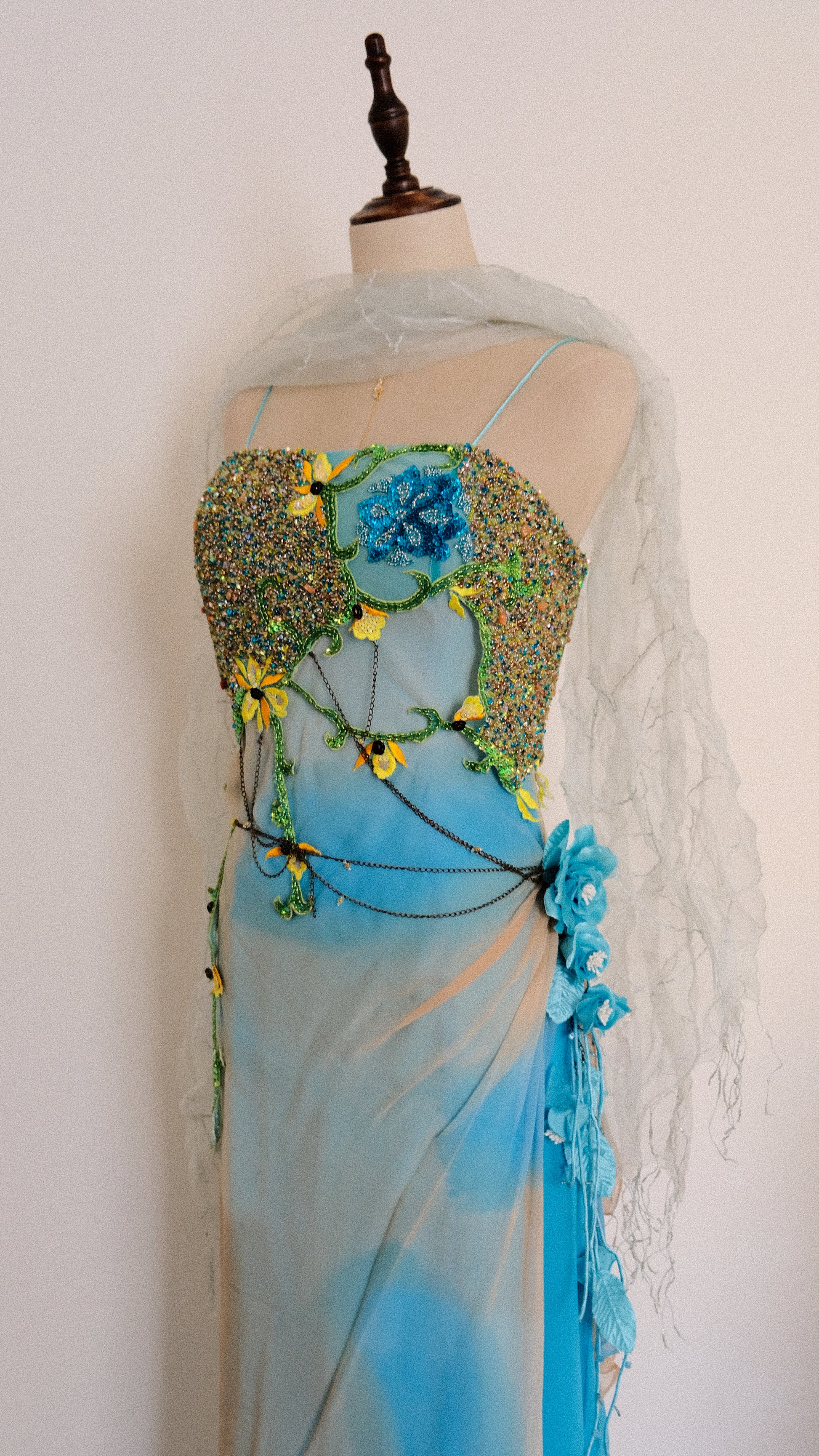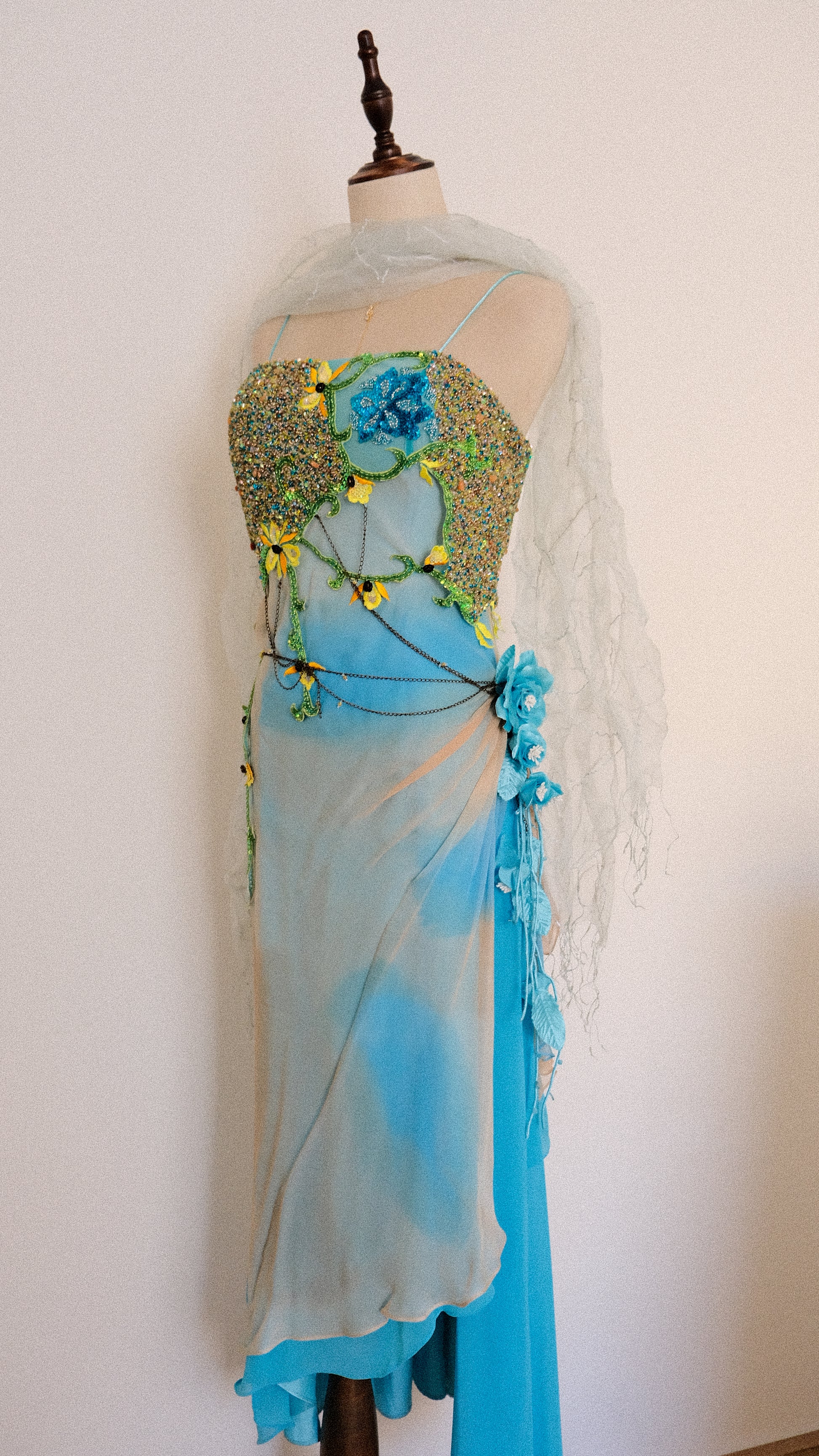 A whimsical fairycore dress with embellishments, mini chains and the most beautiful floral detailing.