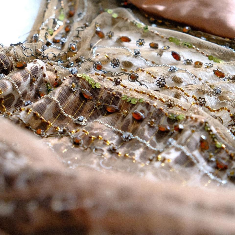 A beautiful animal print bustier dress with mesh waist and stunning embellishment and tulle.