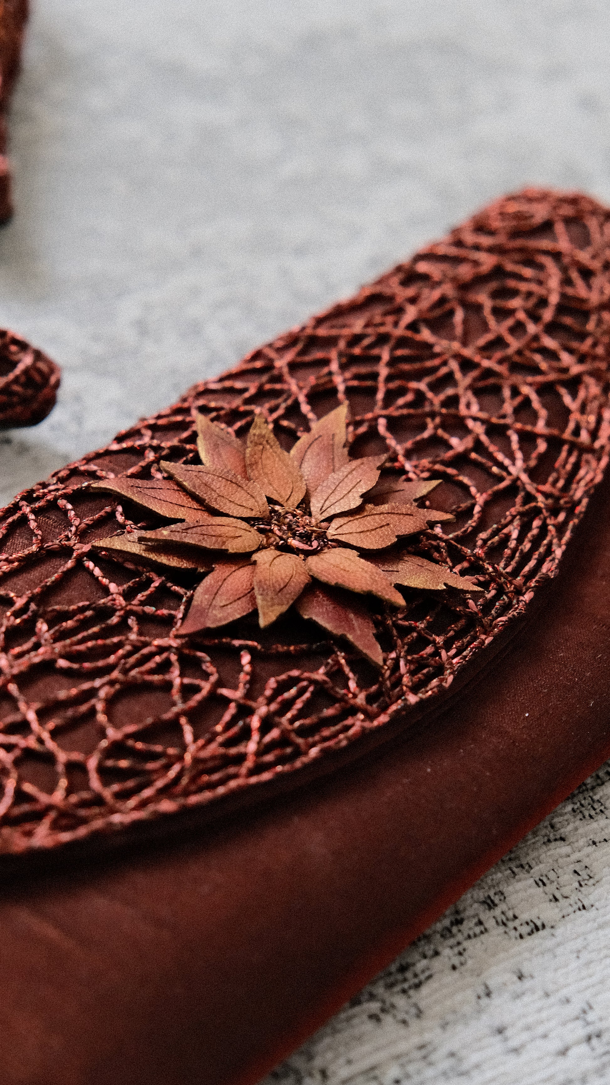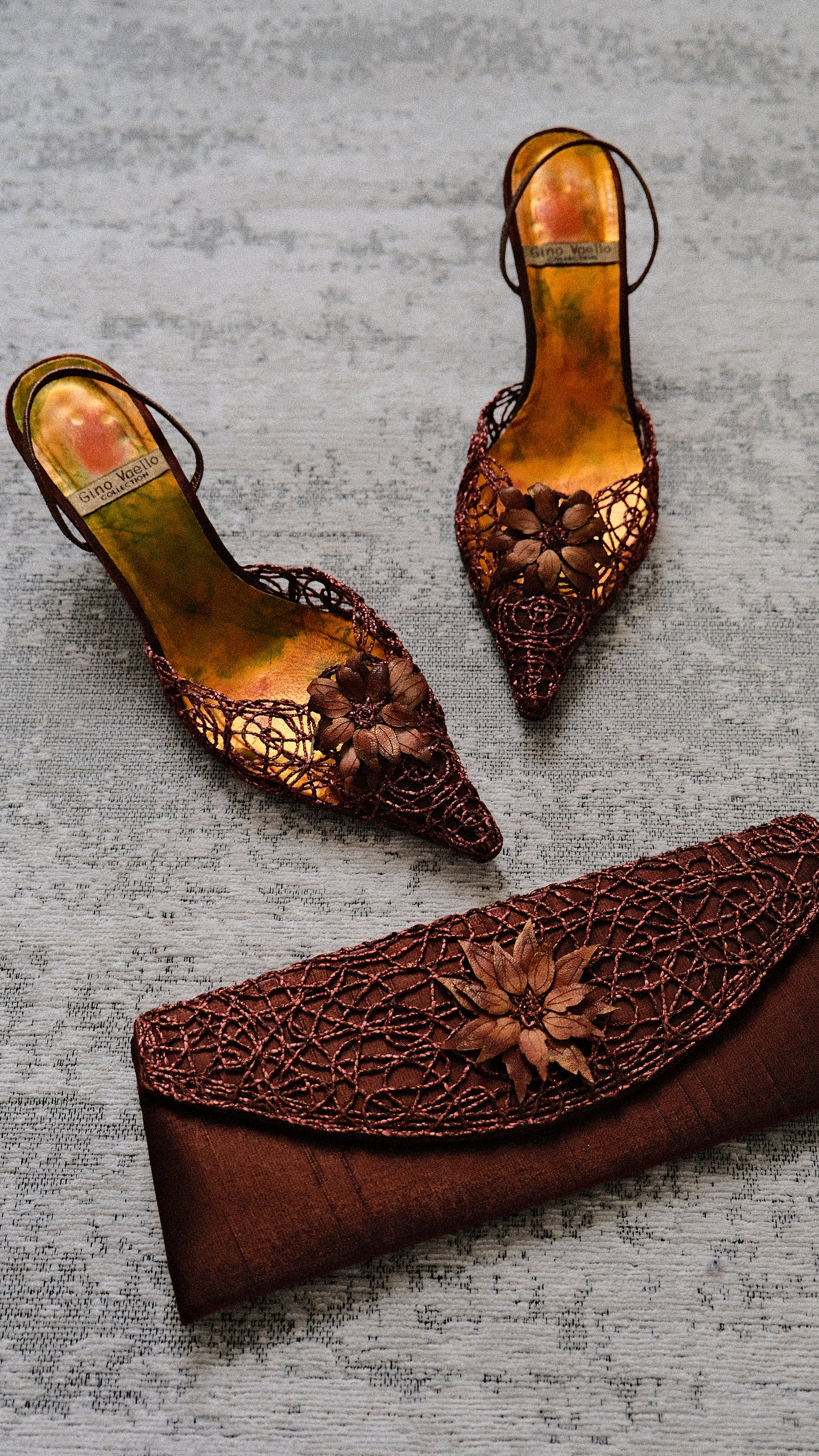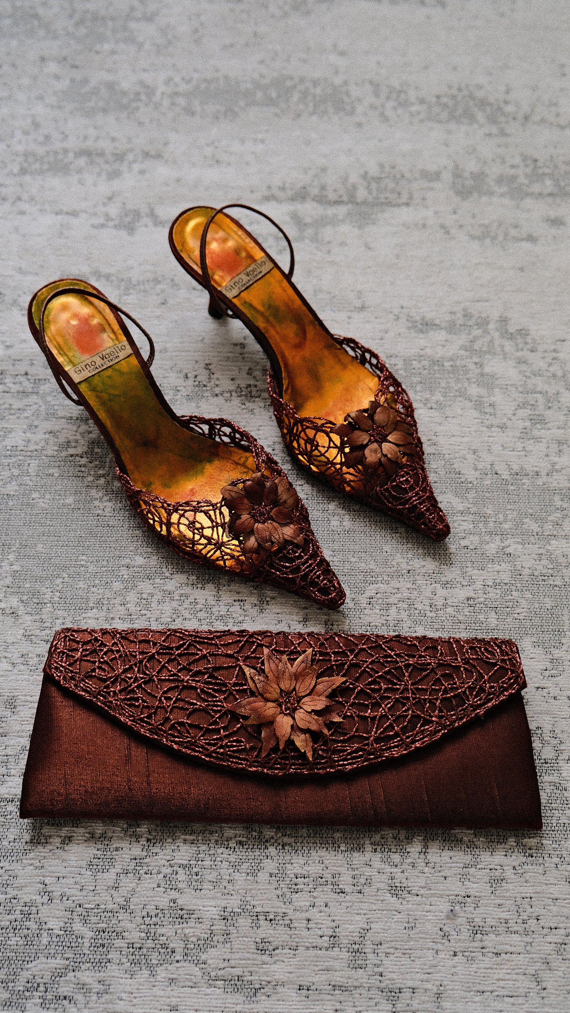 Vintage Gino Vaello set of bronze kitten heels with dark brown floral detailing and a dark brown matching floral clutch.