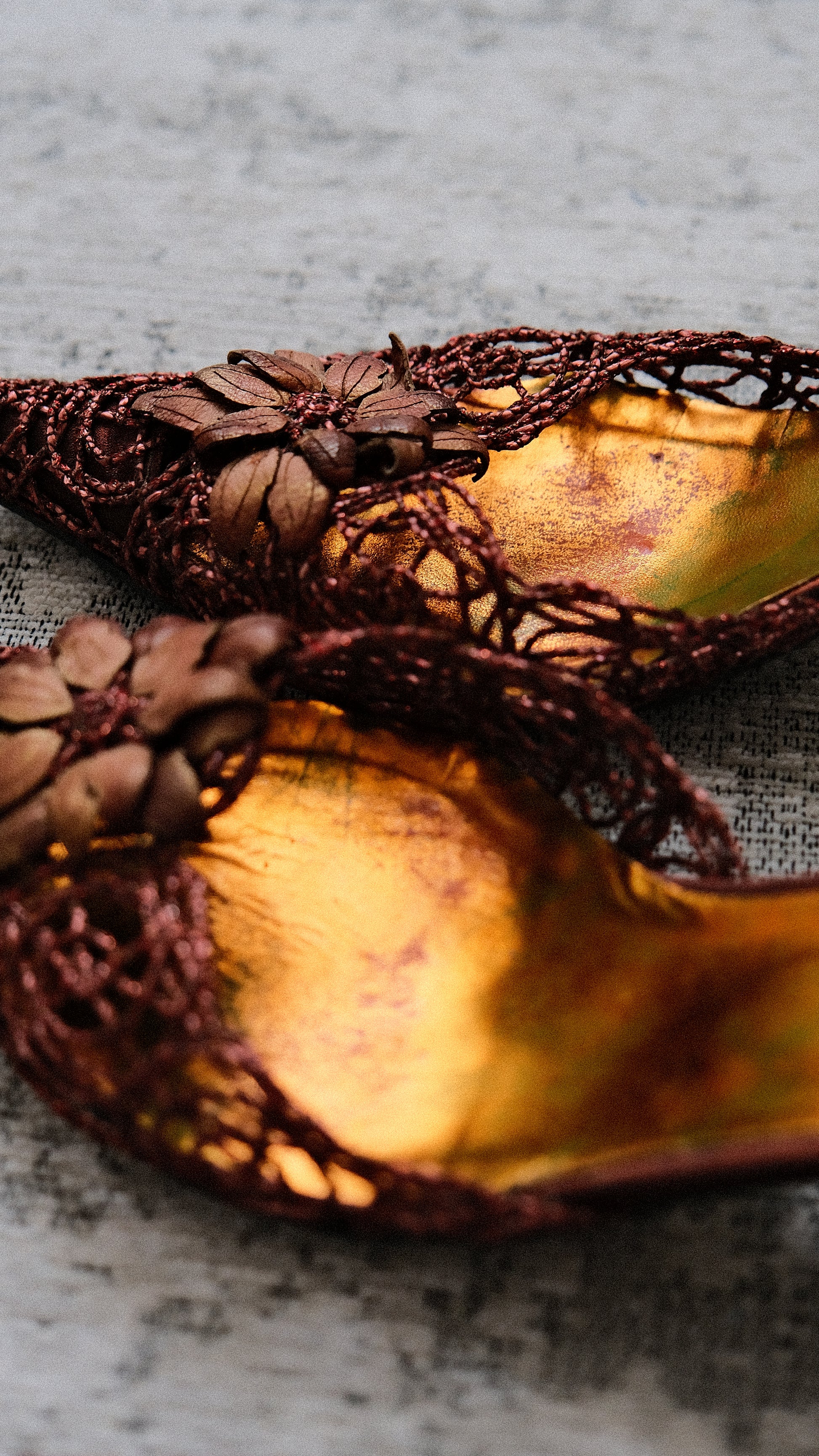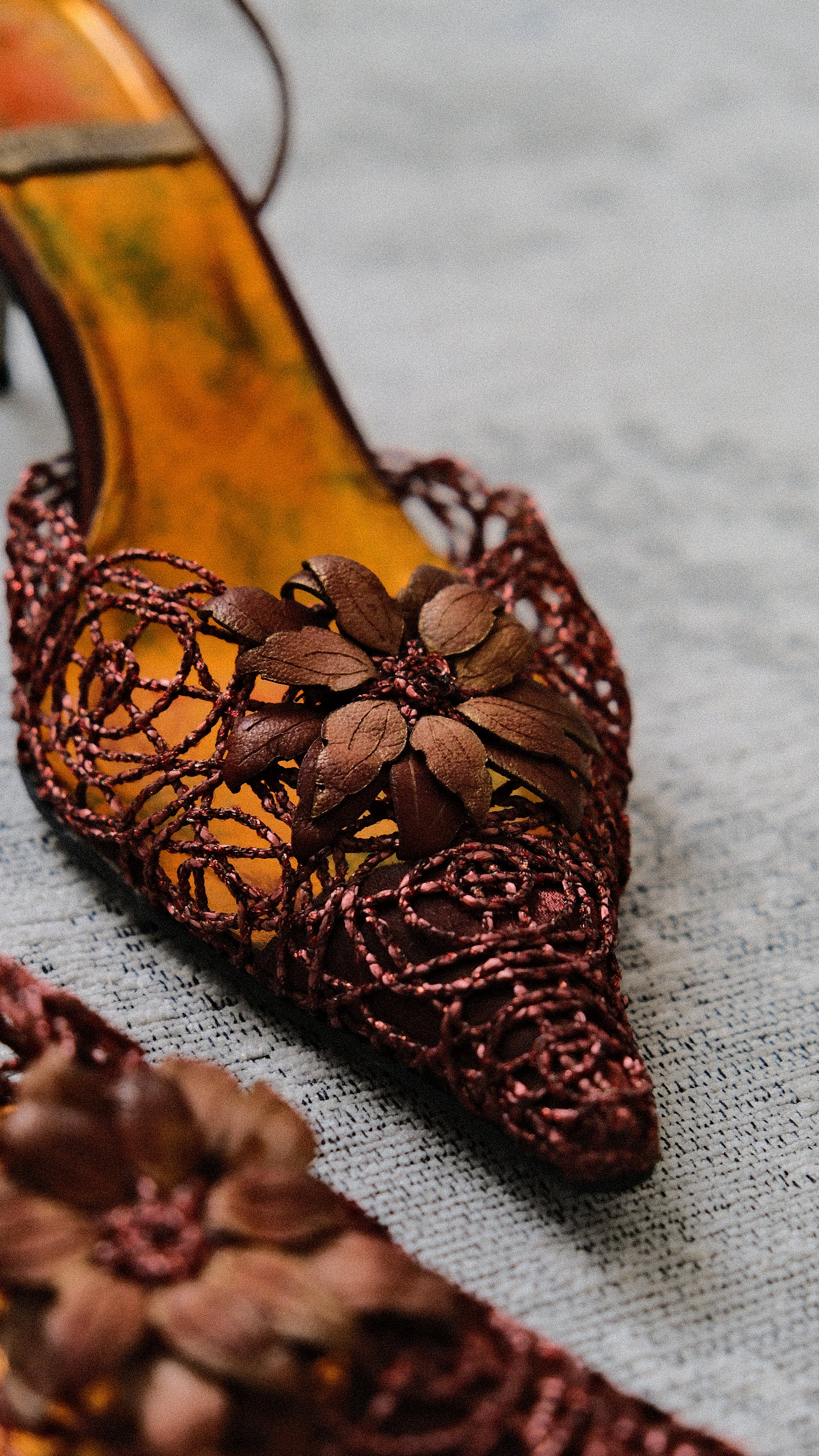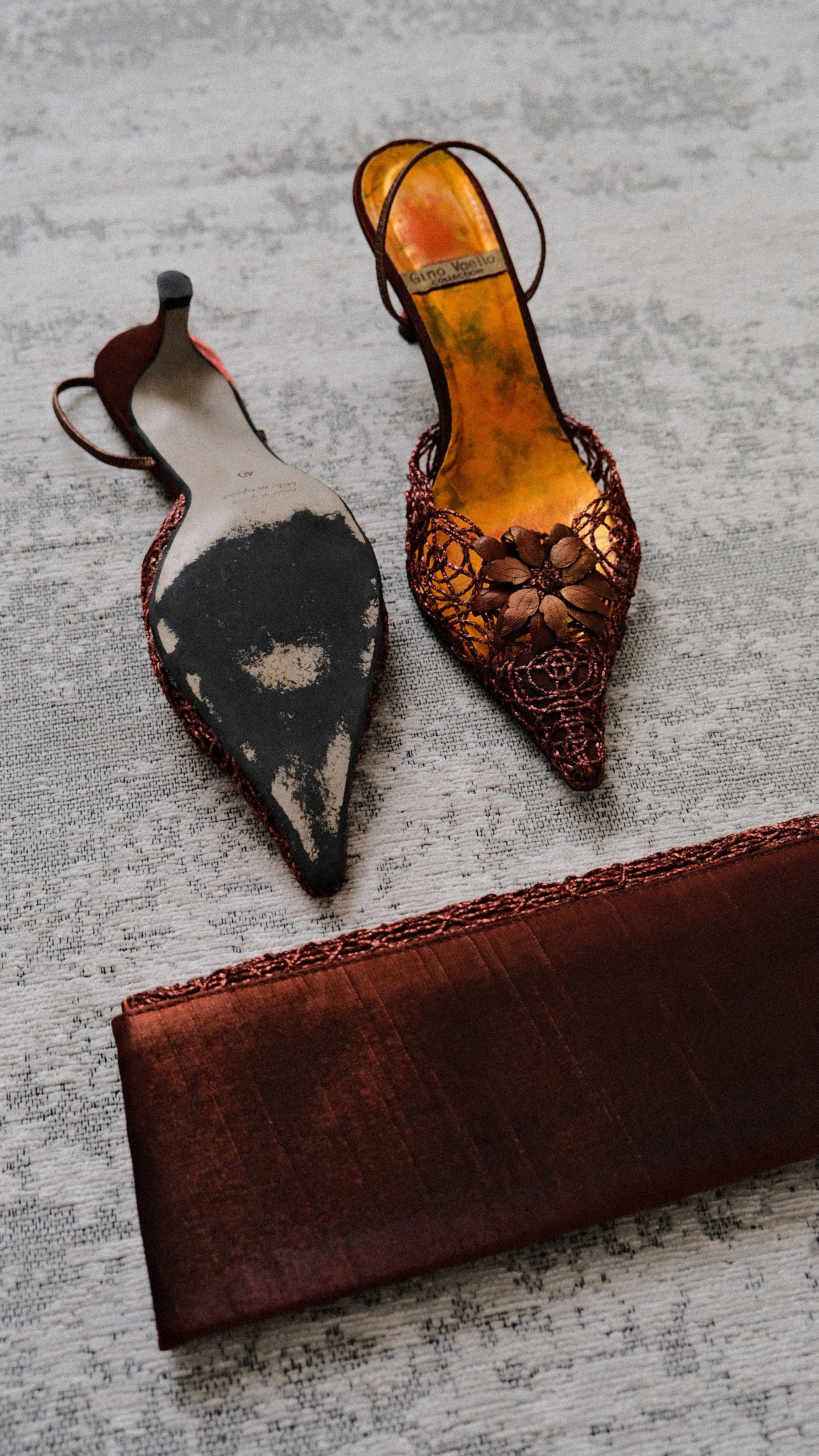 Vintage Gino Vaello set of bronze kitten heels with dark brown floral detailing and a dark brown matching floral clutch.
