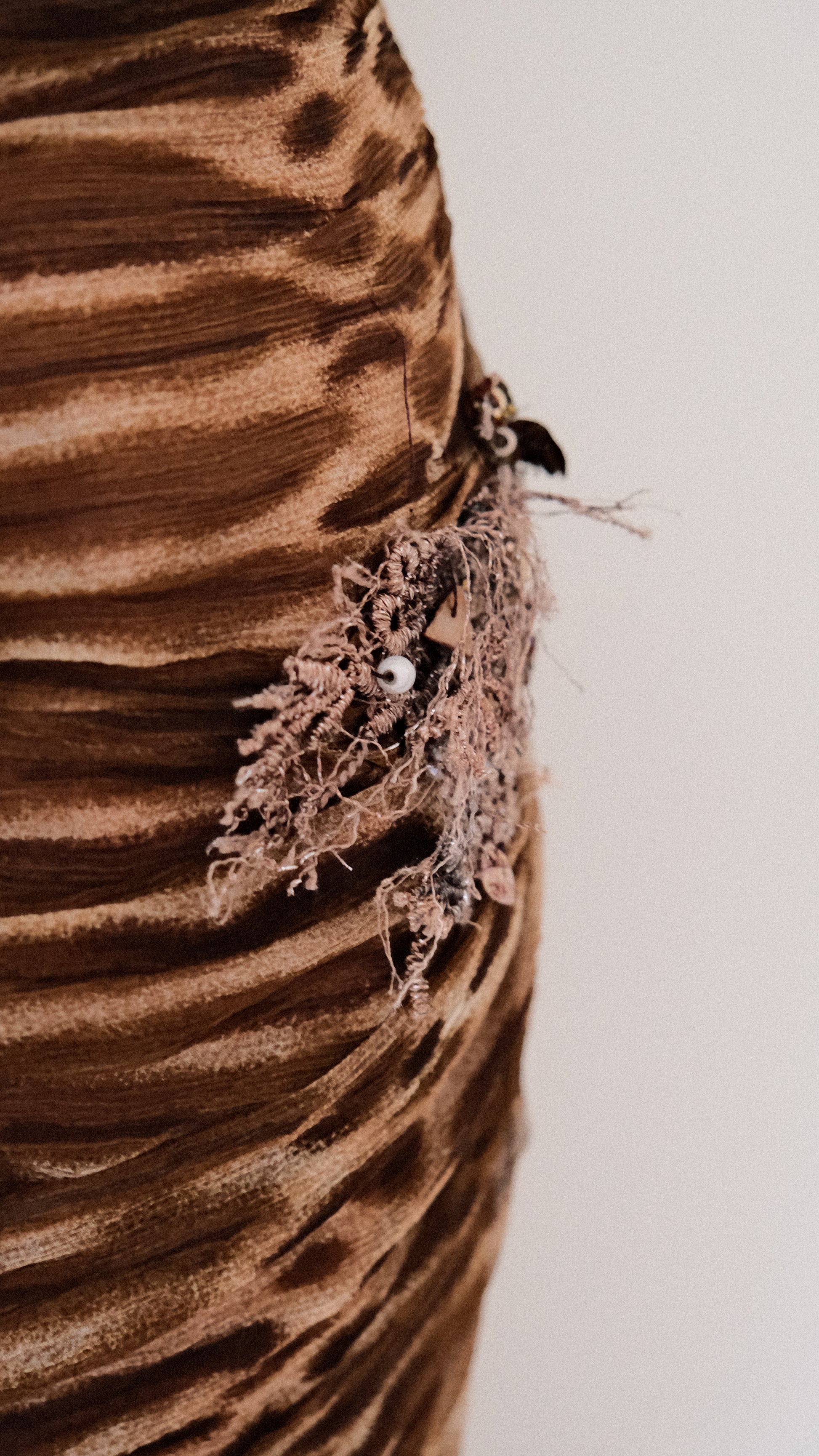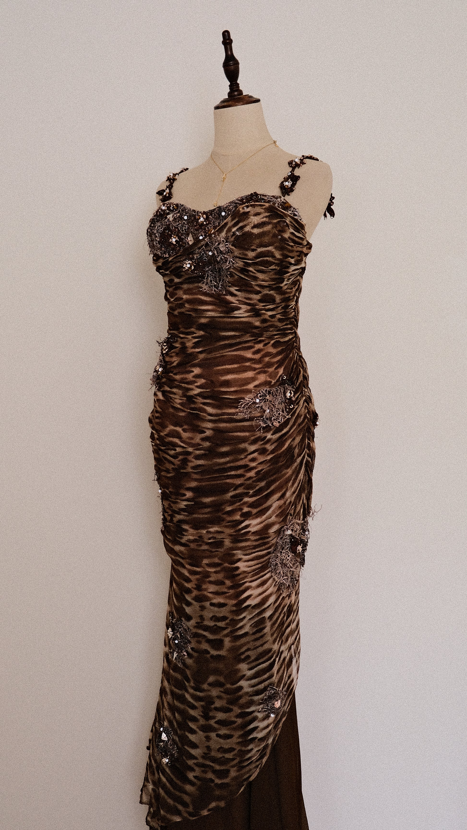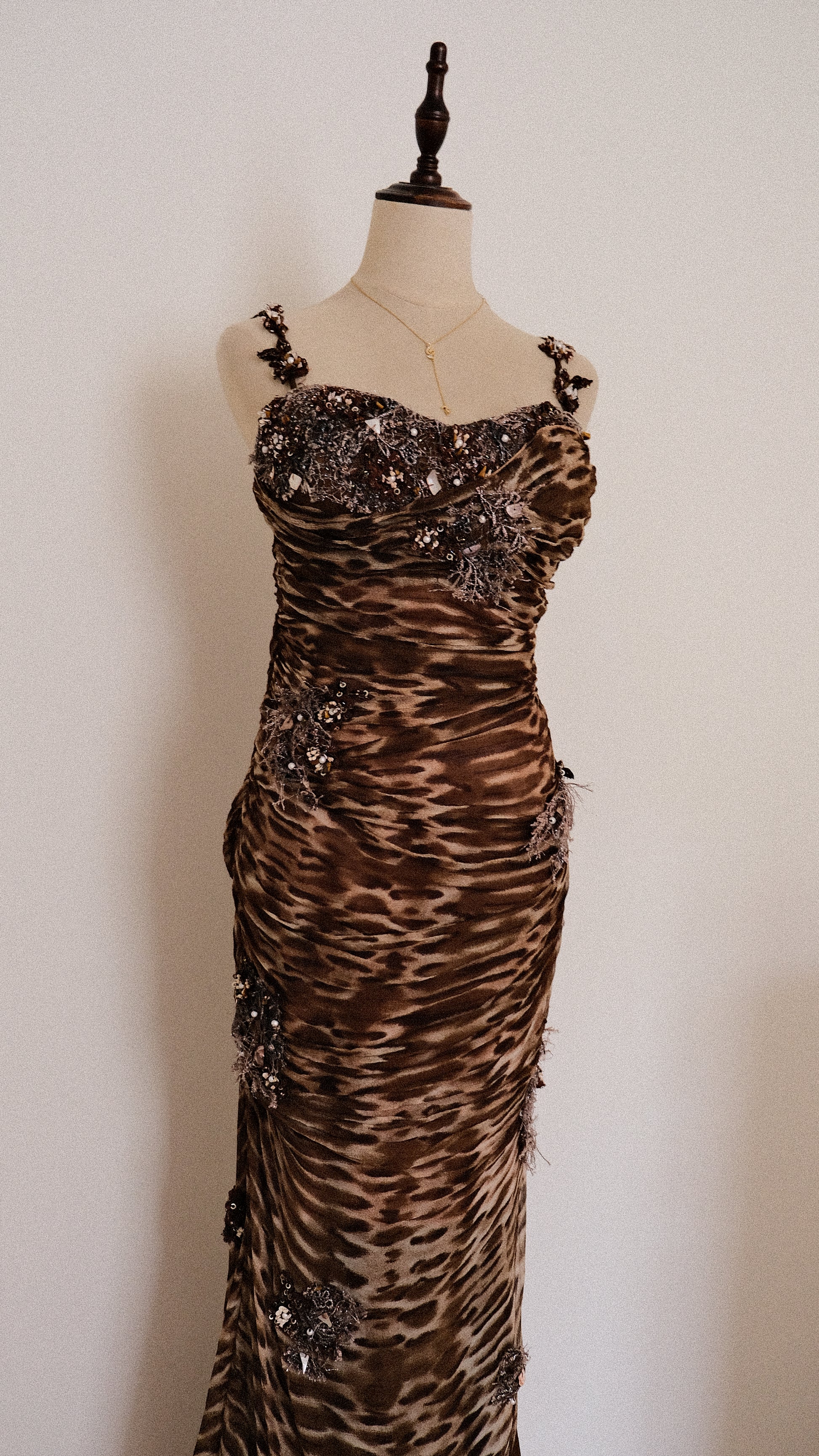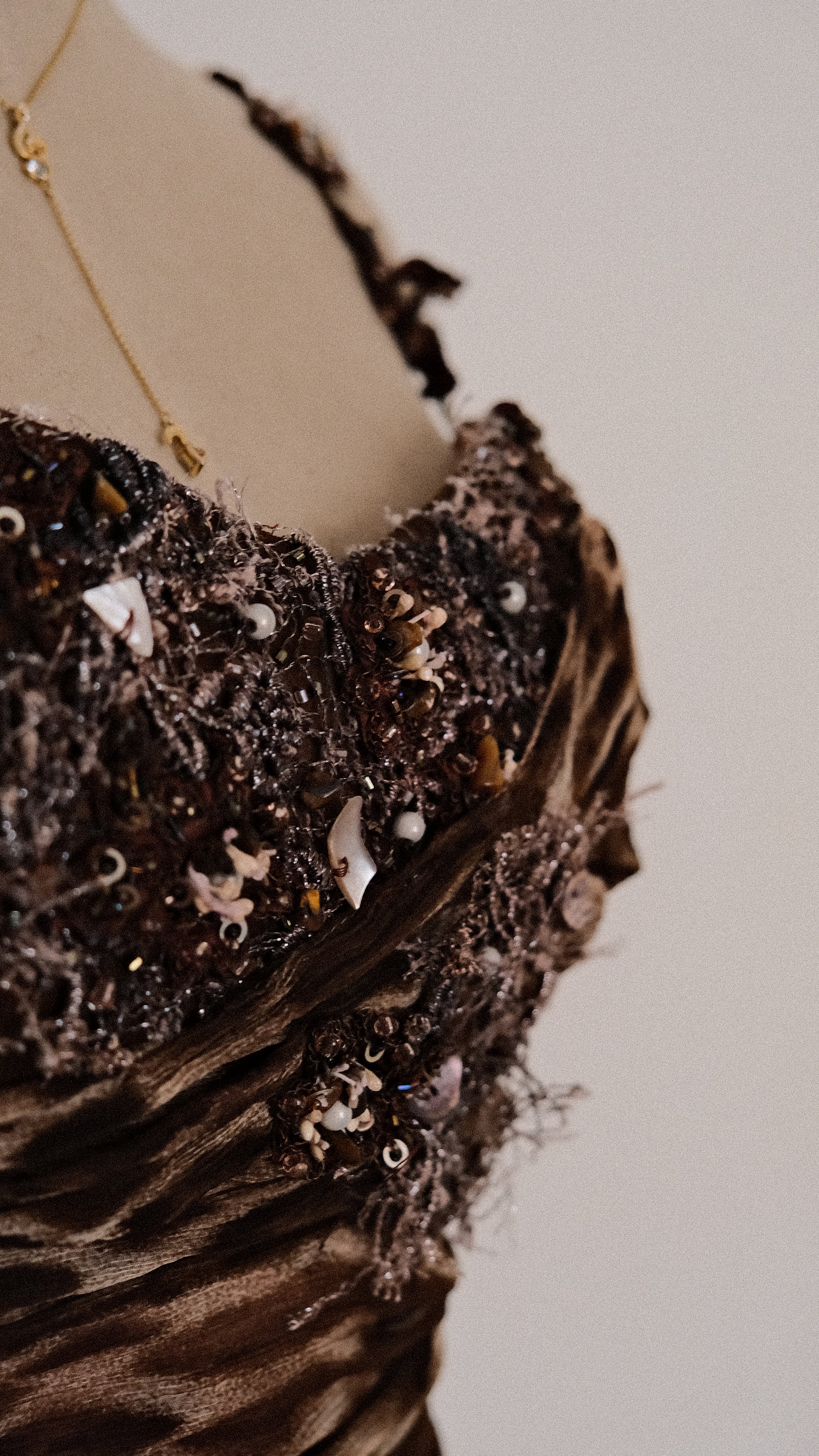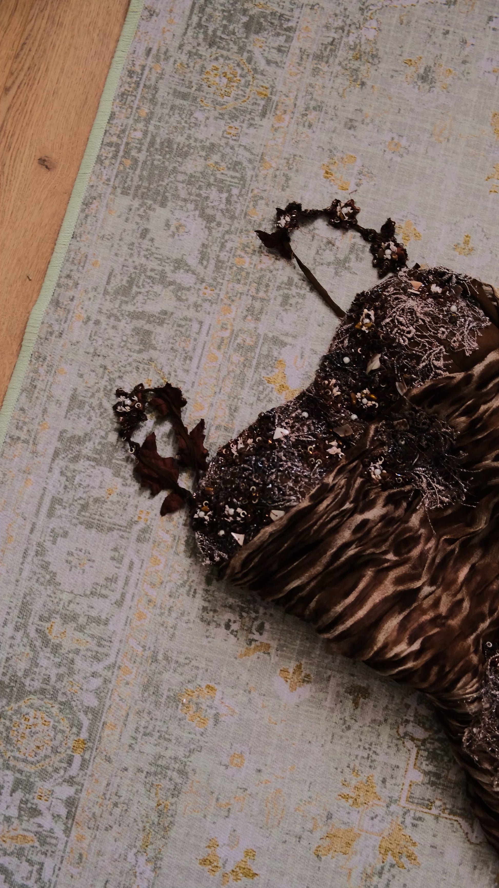A warm toned autumn aesthetic fairytale dress with a bustier covered in embellishments.