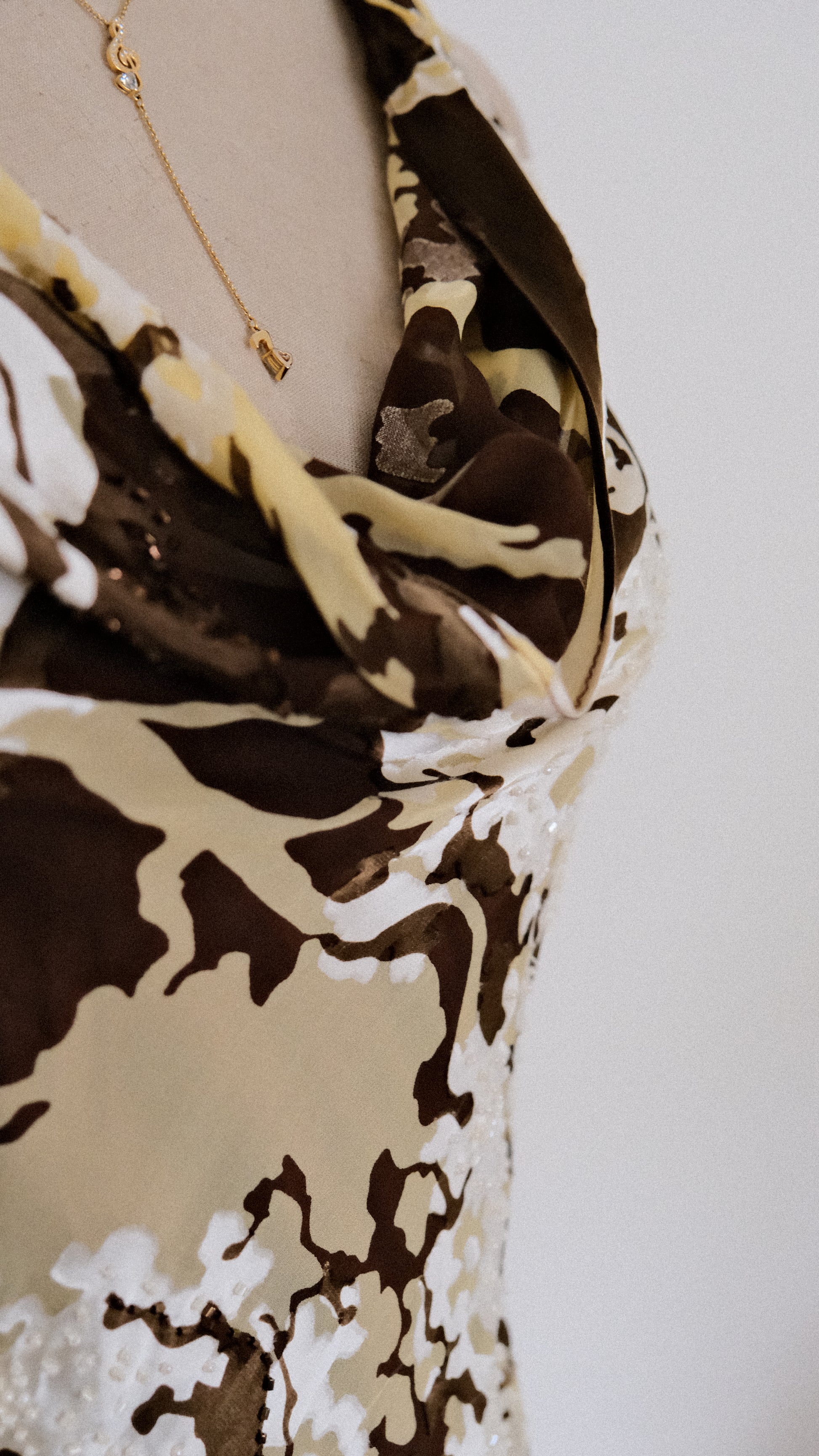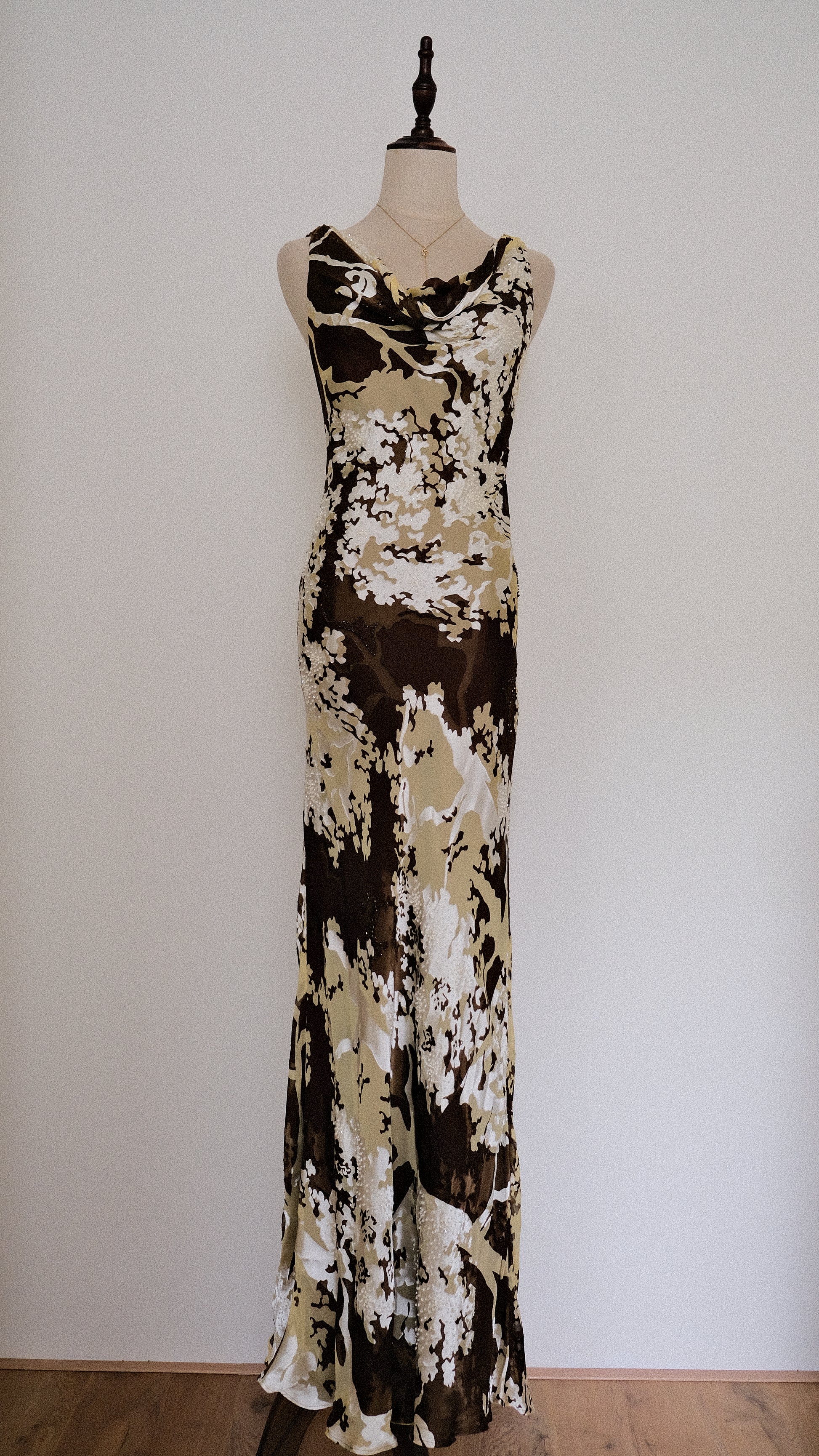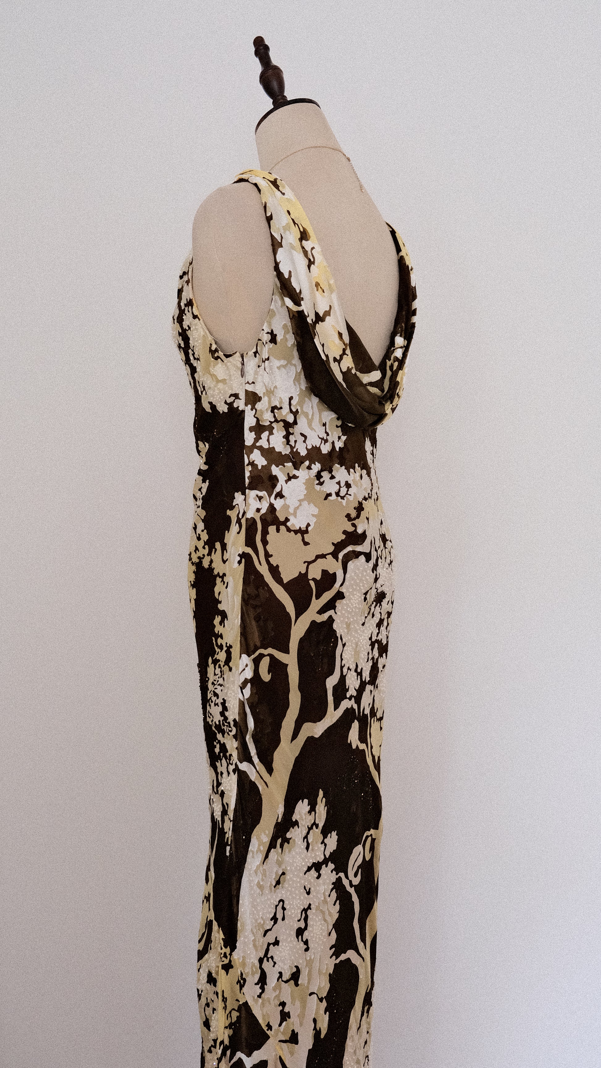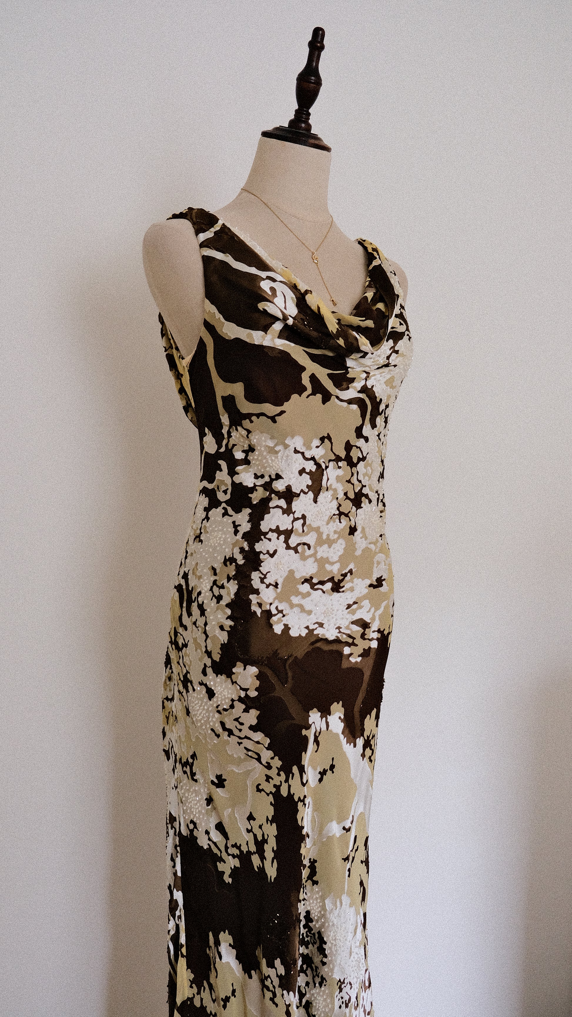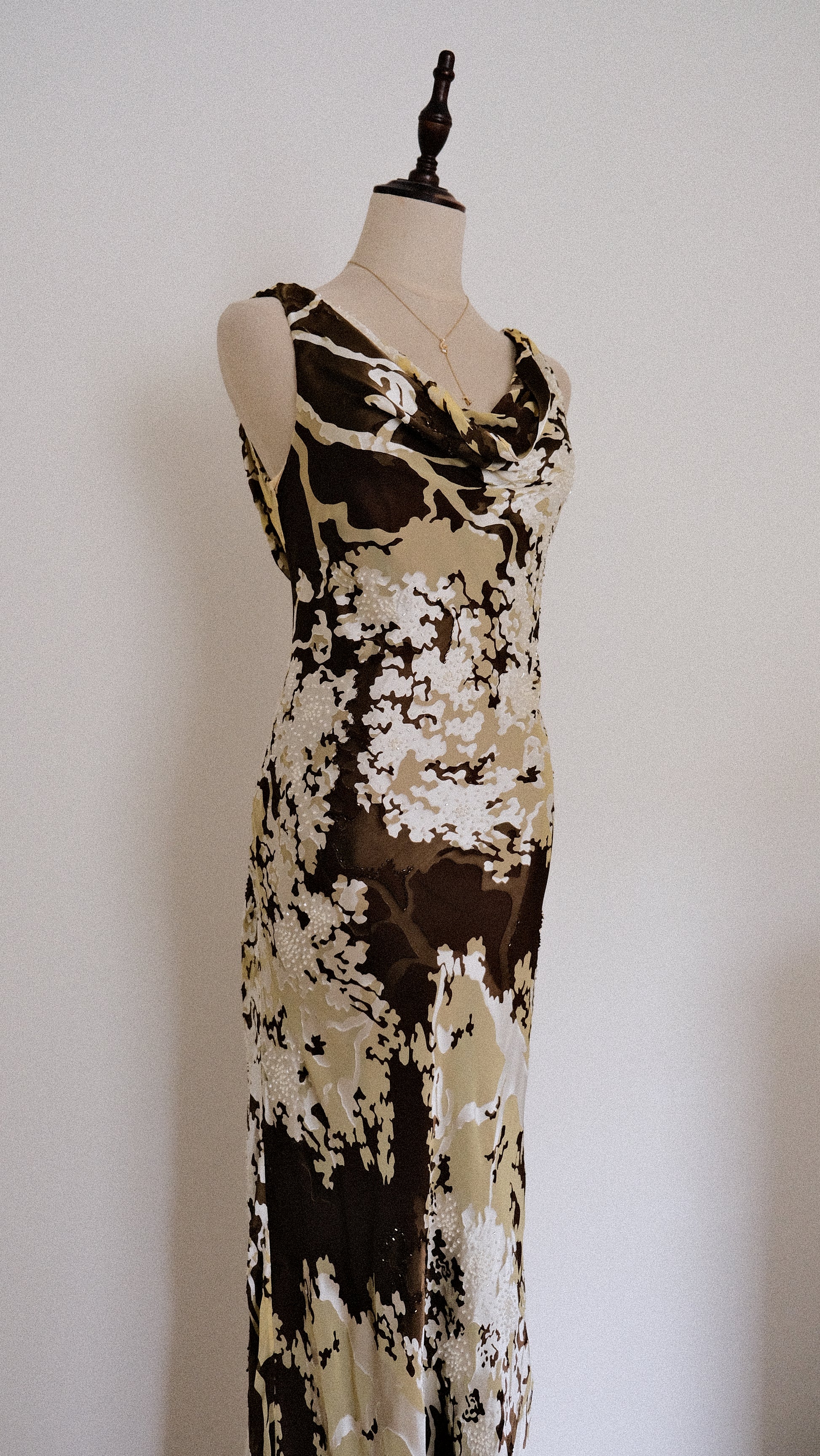 A beautiful fairycore forest symphony maxi dress with a draped material at the back for a flirty look.