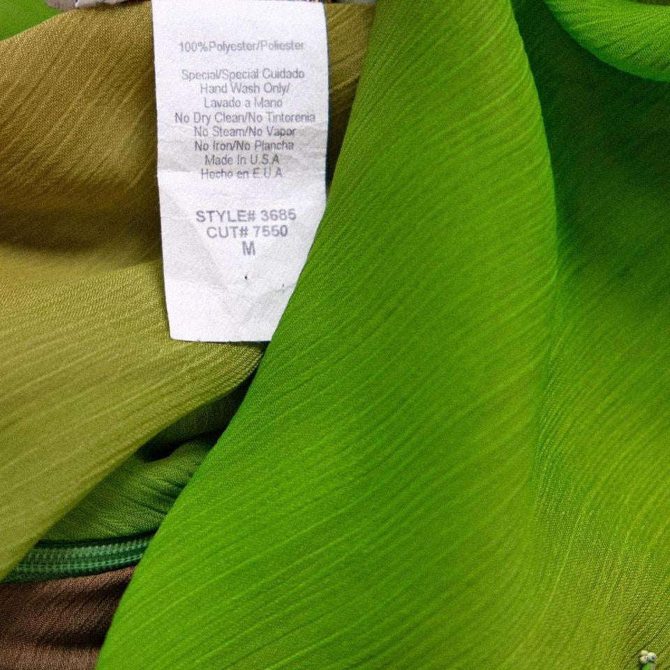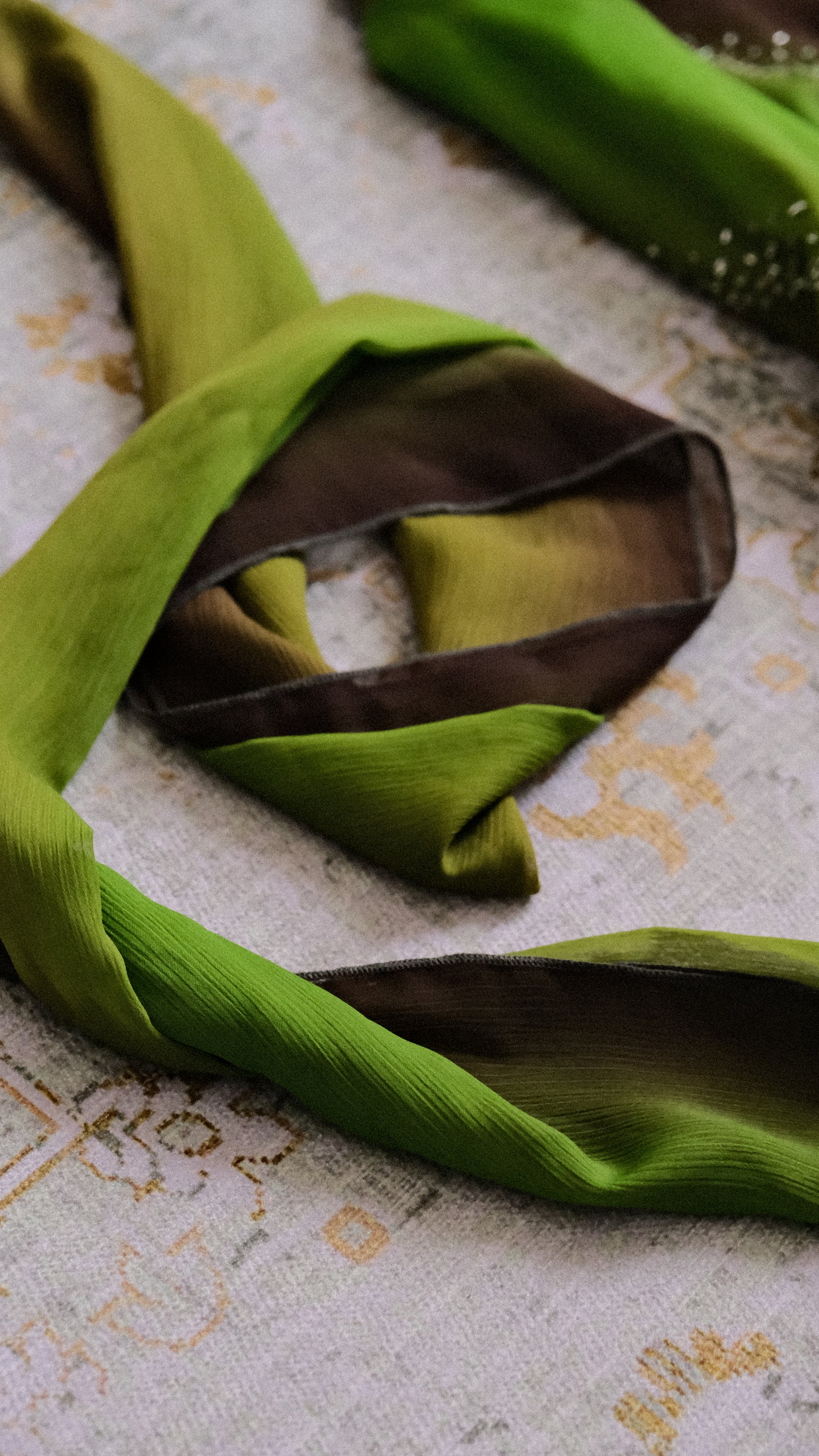 A fairycore enchanted dress in a brown and green color palette and embellished details. The dress has a matching scarf and fluttering effect at the bottom.