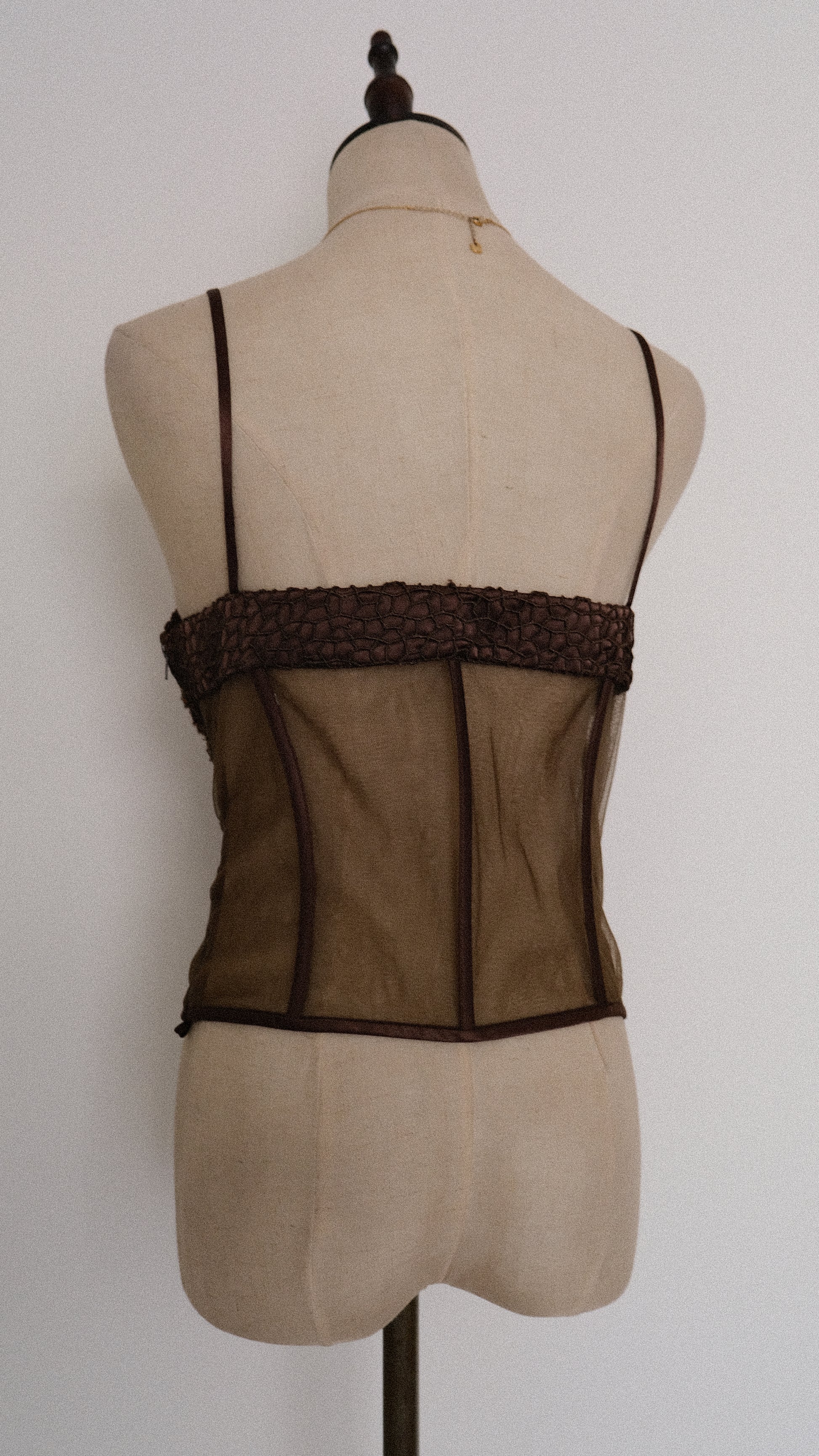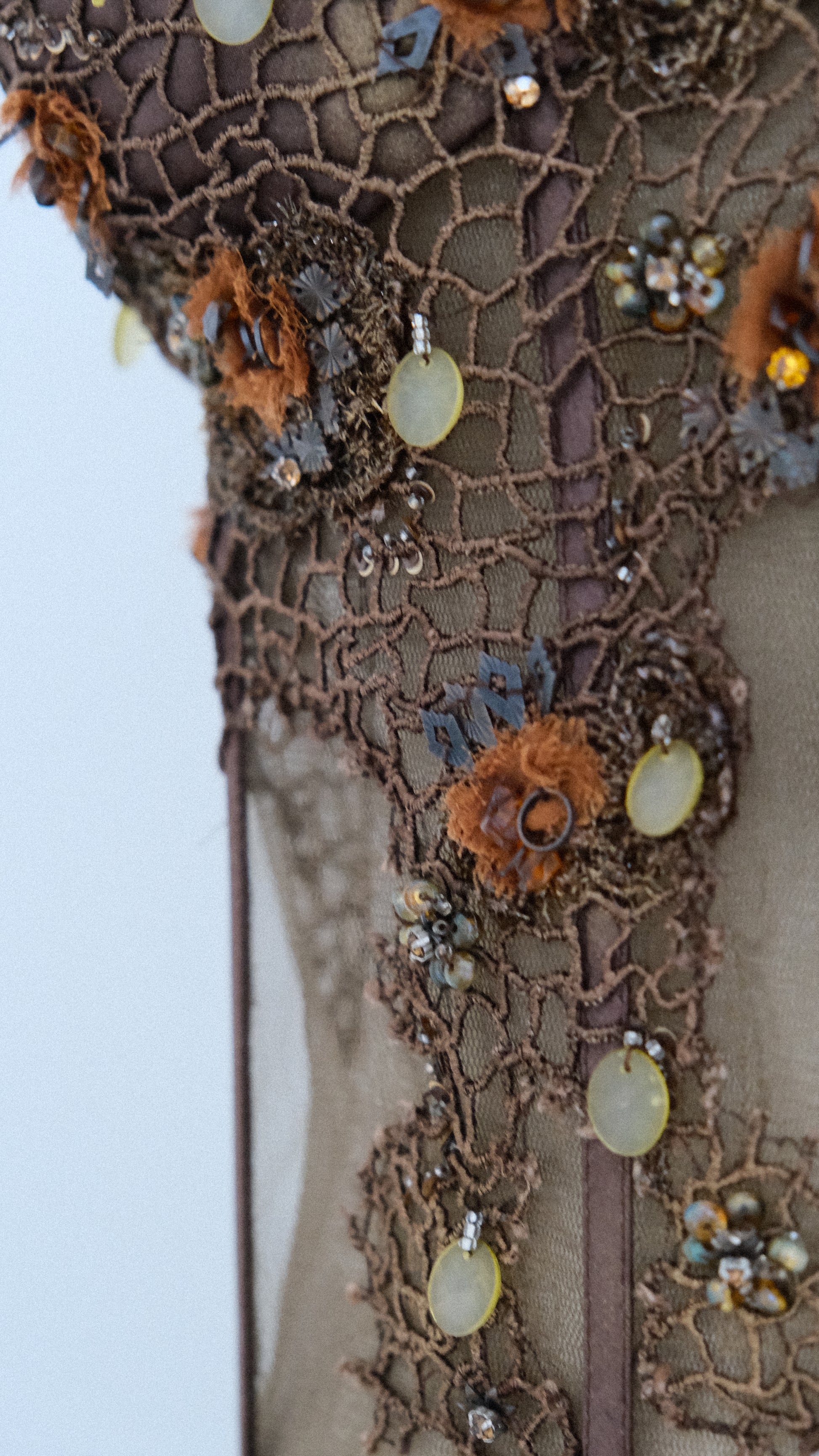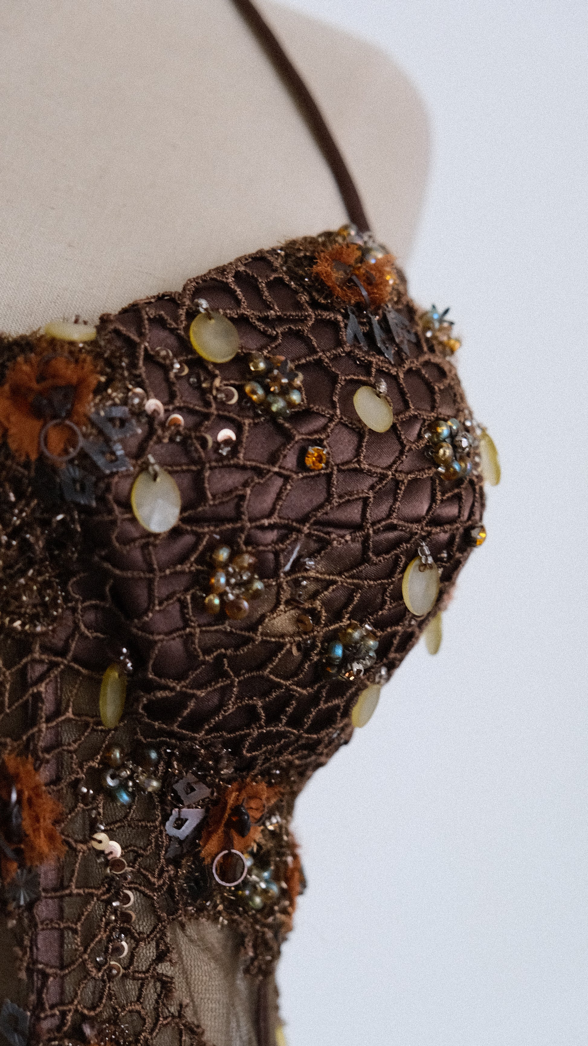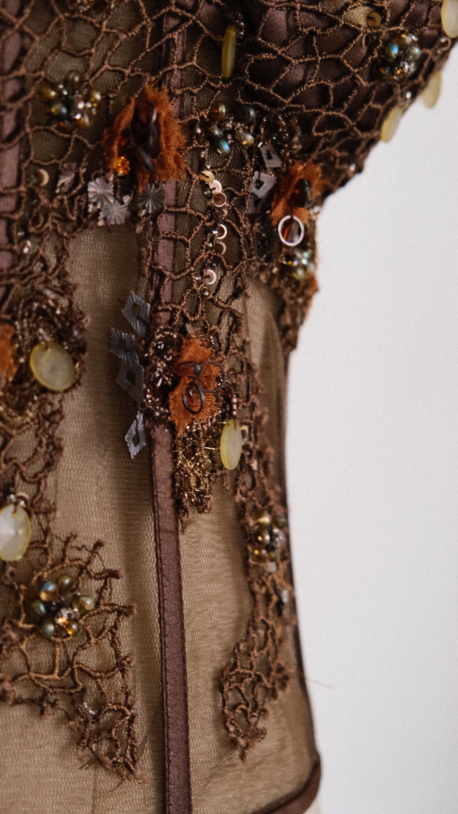 French dark brown deepsea bustier with highly detailed embroidery and embellished details.