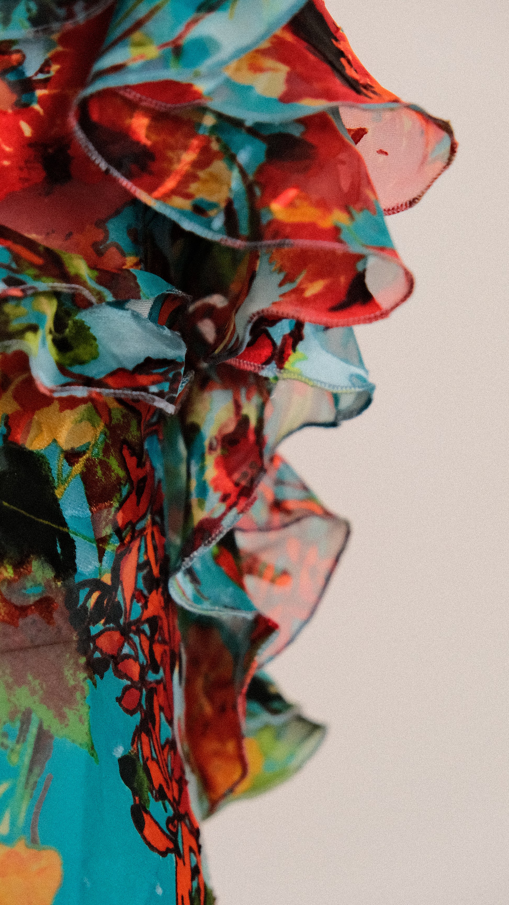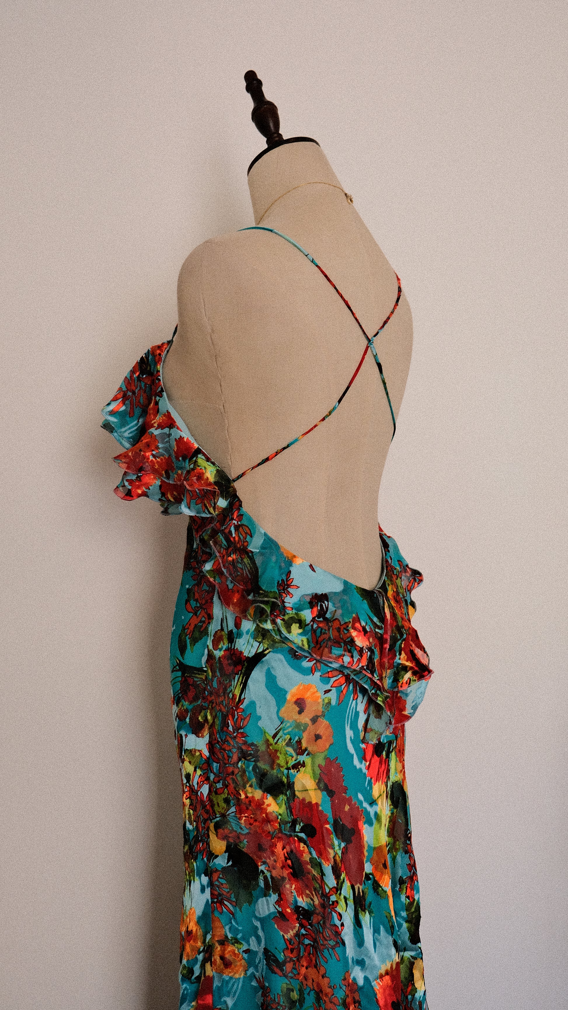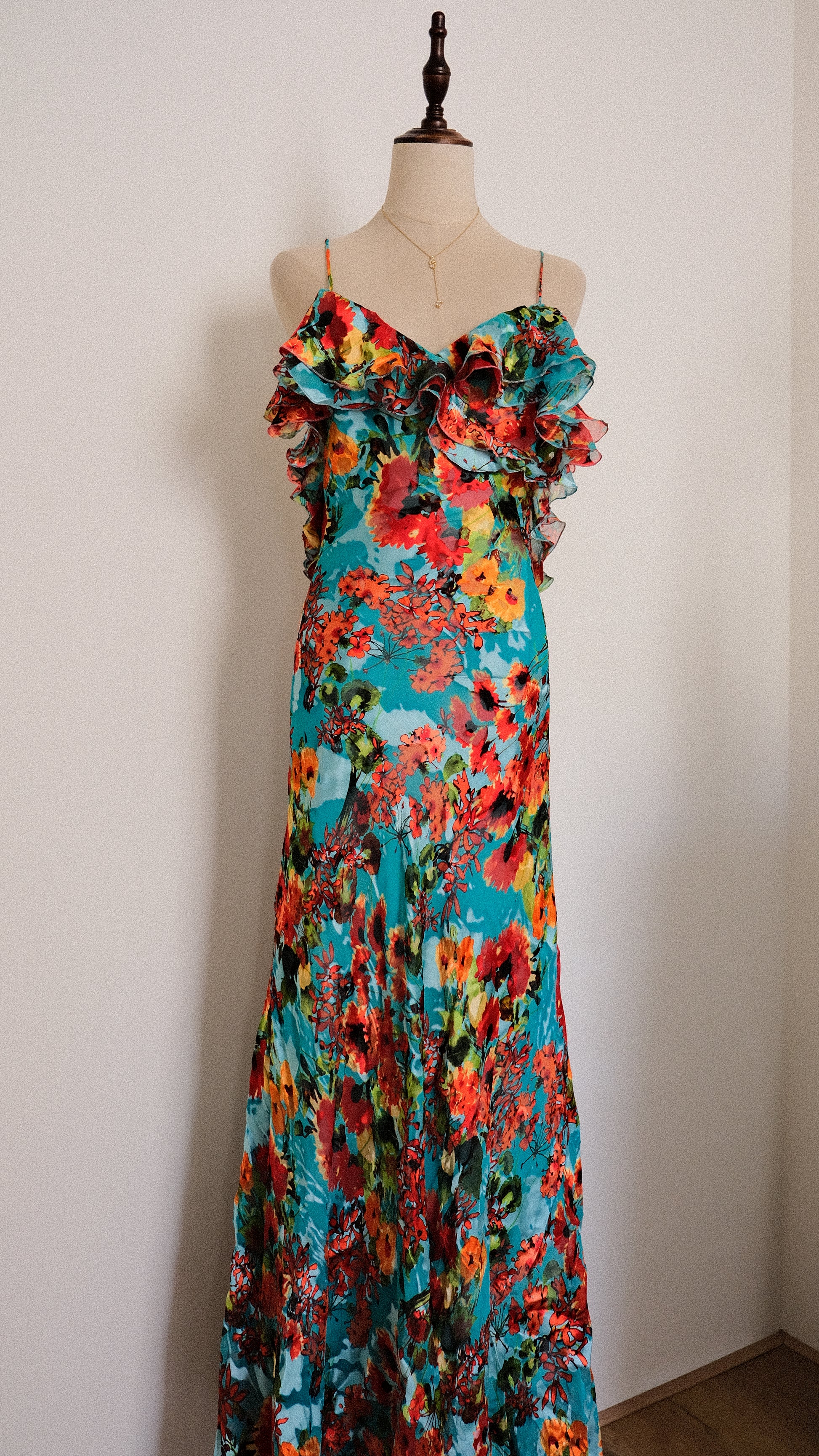 A romantic fairytale dress in a beautiful blue color with a highly detailed blossoming garden flower pattern. The dress has ruffled edges at the top and is super flowy creating a dreamy look.