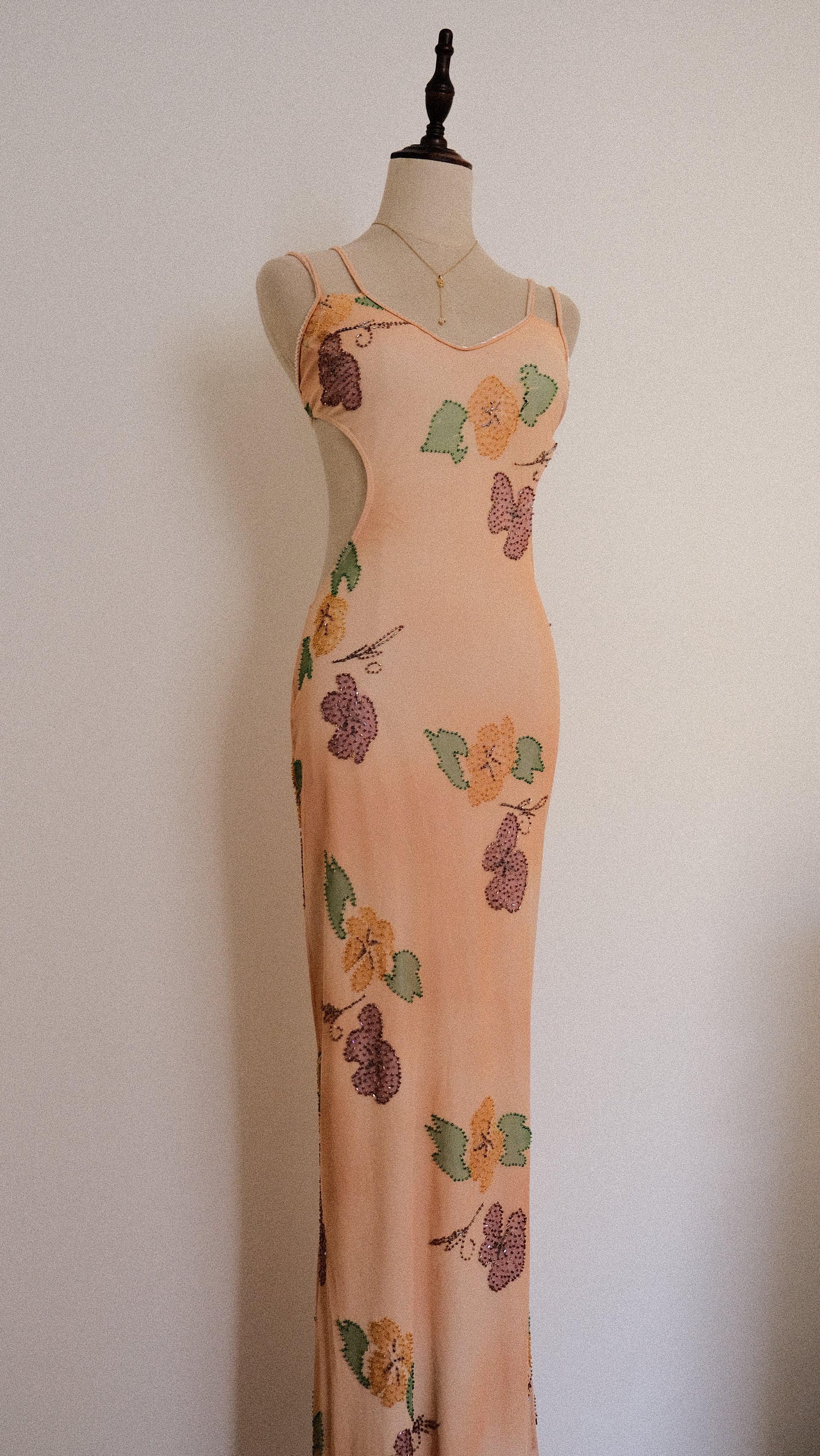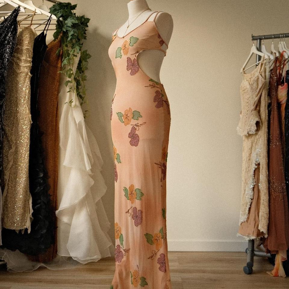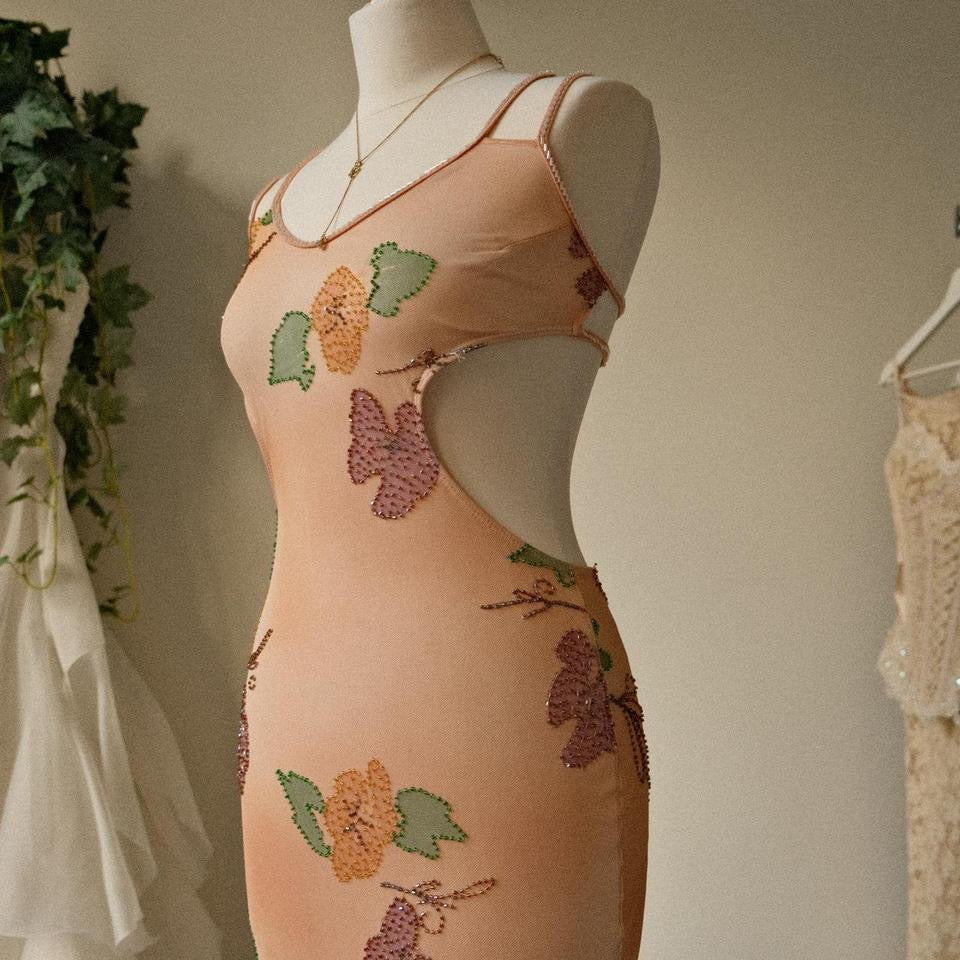 A romantic autumn aesthetic evening dress with cutout detail and embellished floral pattern.