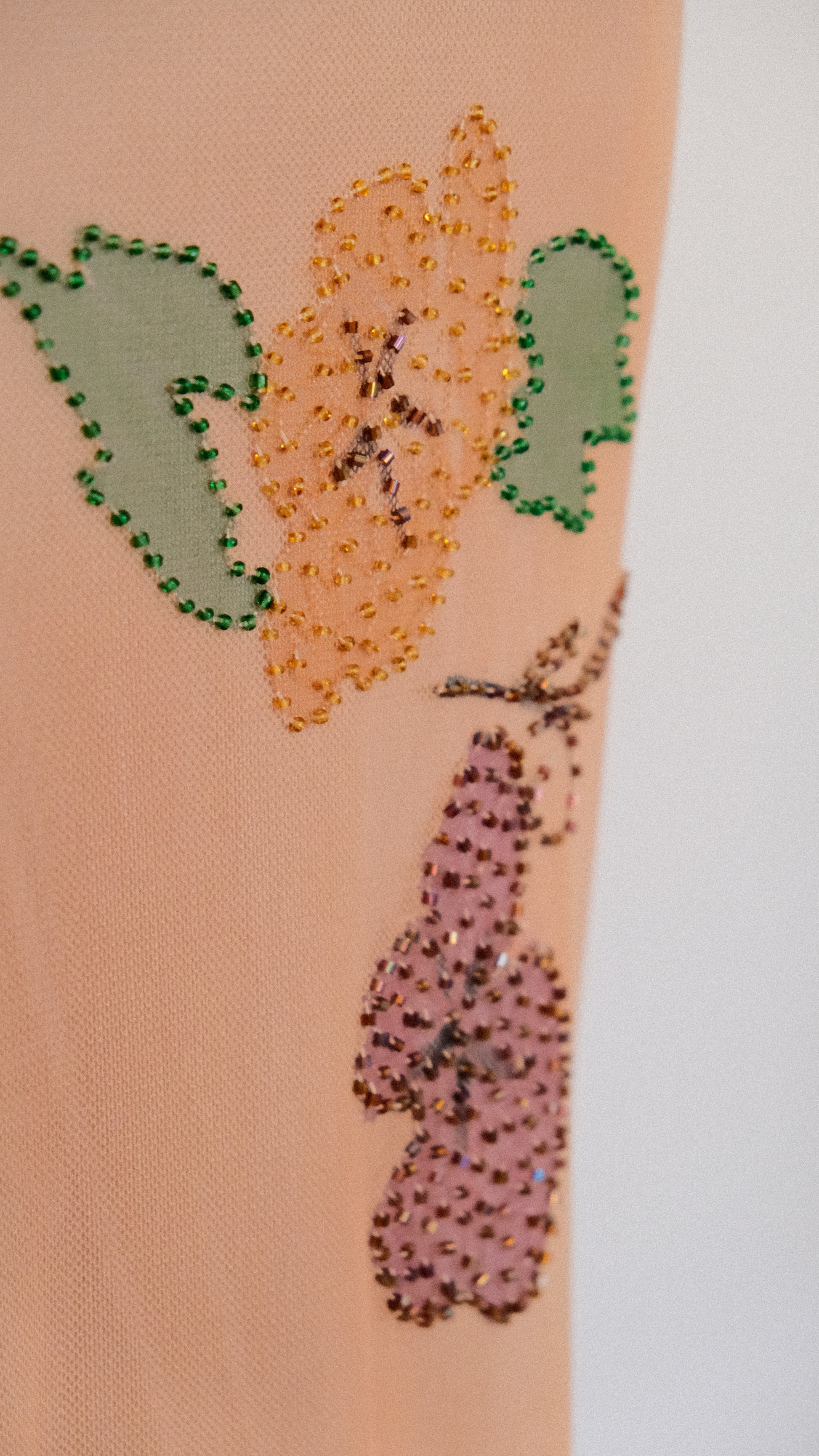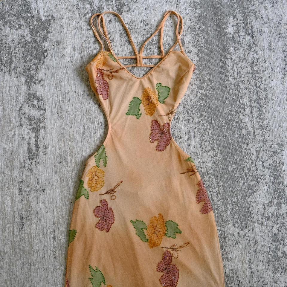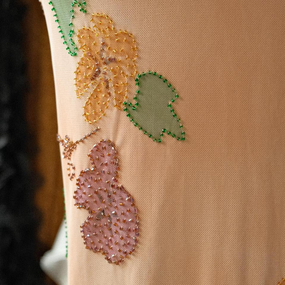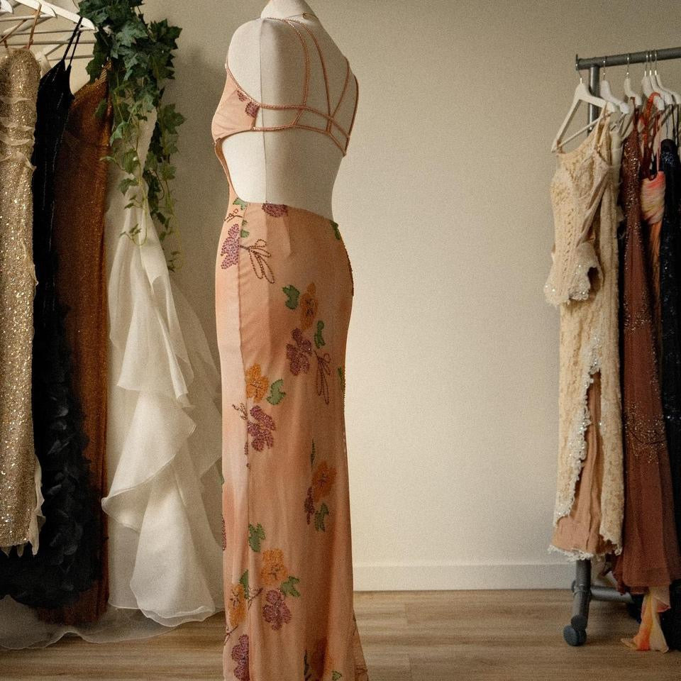 A romantic autumn aesthetic evening dress with cutout detail and embellished floral pattern.
