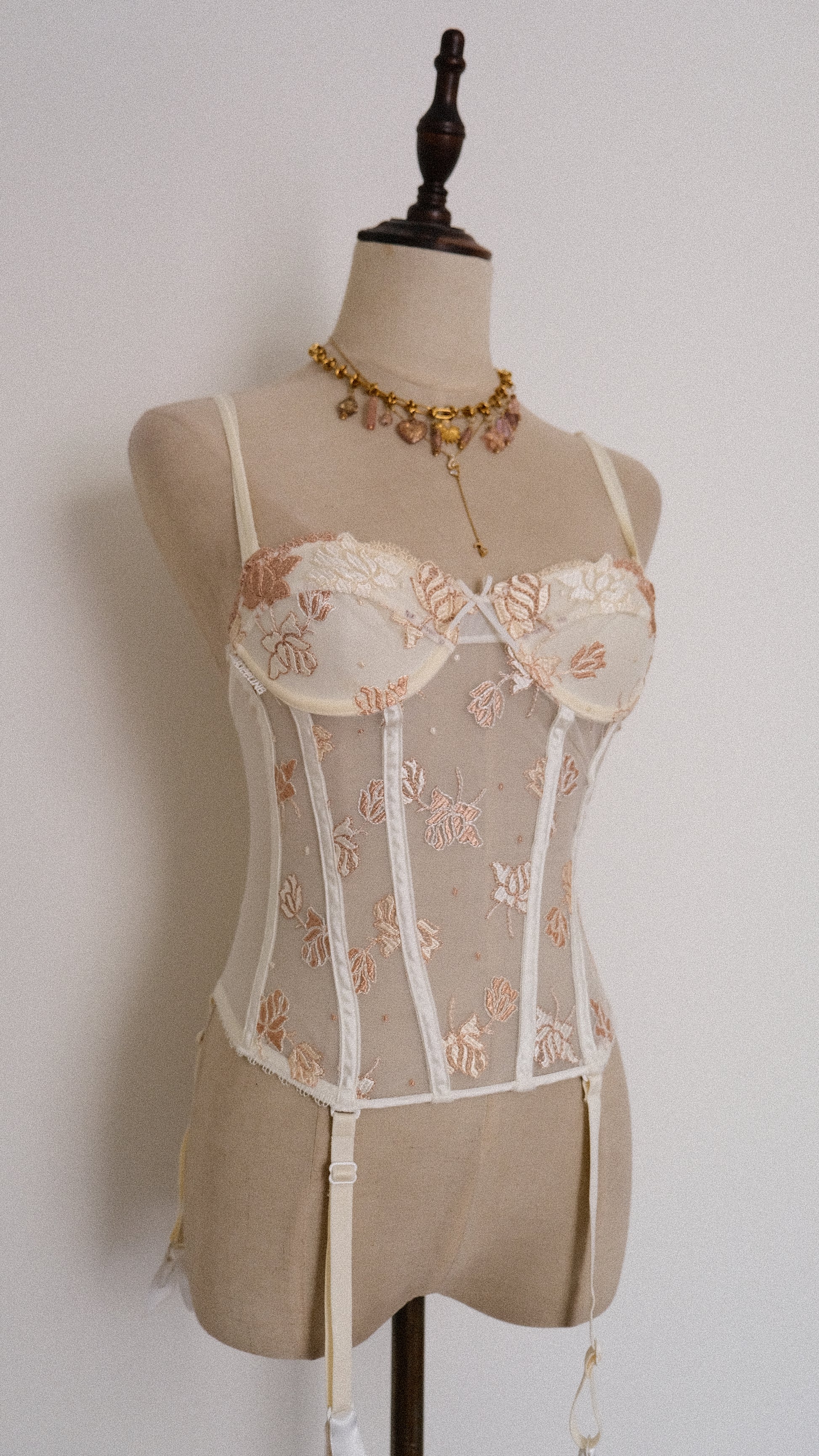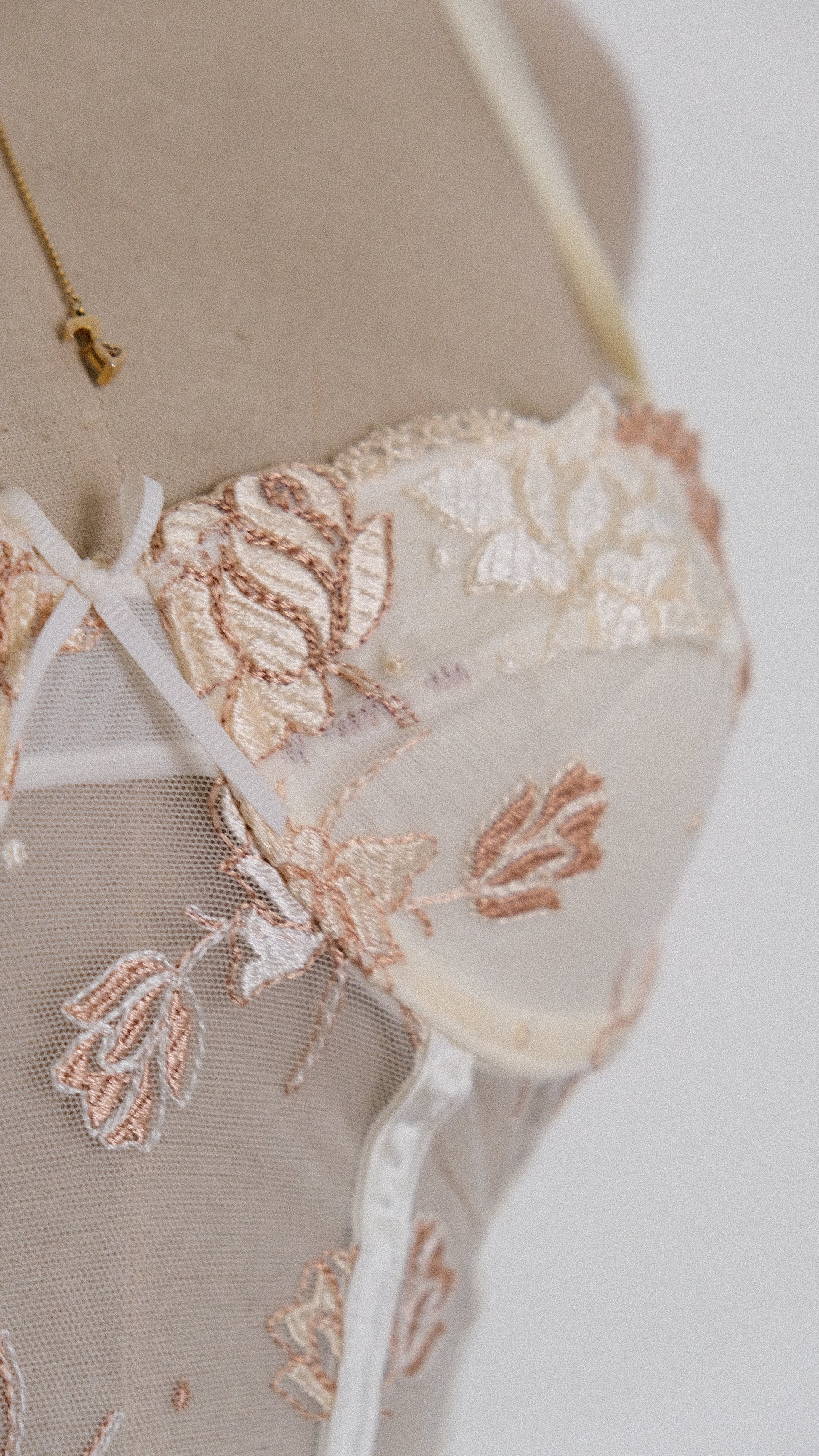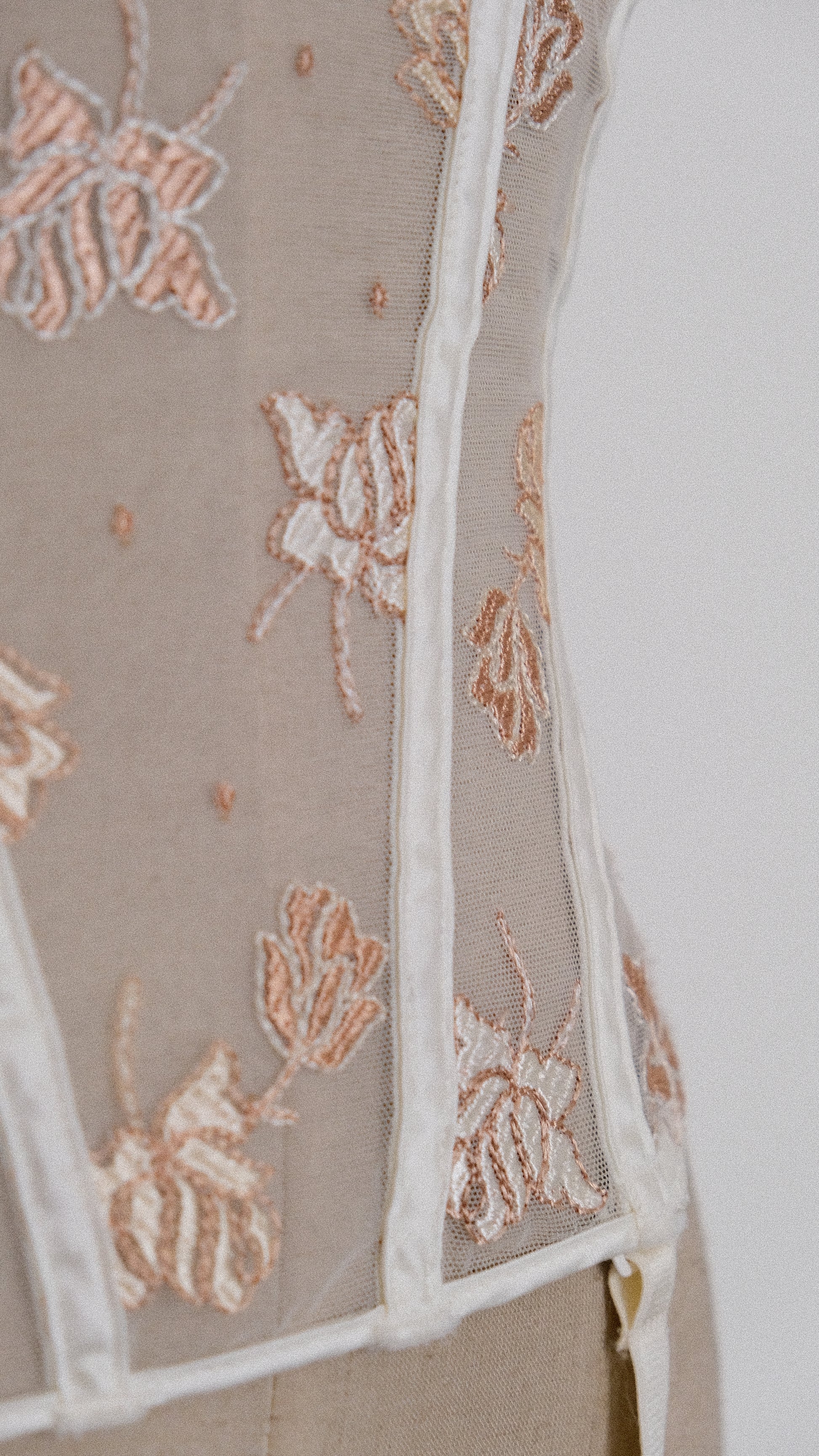 Sheer vintage ivory corset with golden floral embroidery detailing.