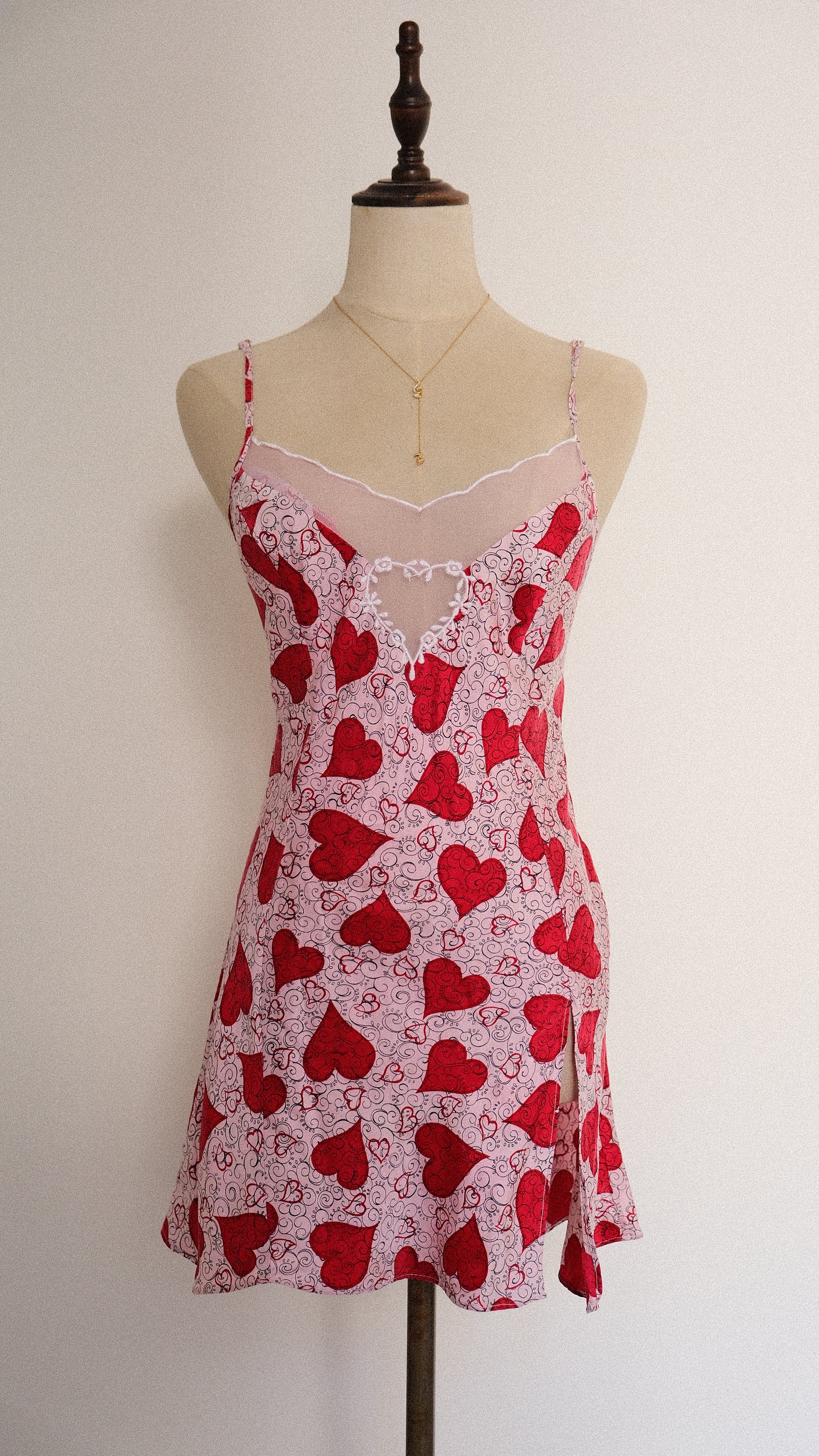 A romantic red and pink vintage Victoria’s Secret golden label babydoll with the most adorable hearts pattern. The babydoll has a mesh white hart shape at the front and an adorable little split at the bottom.
