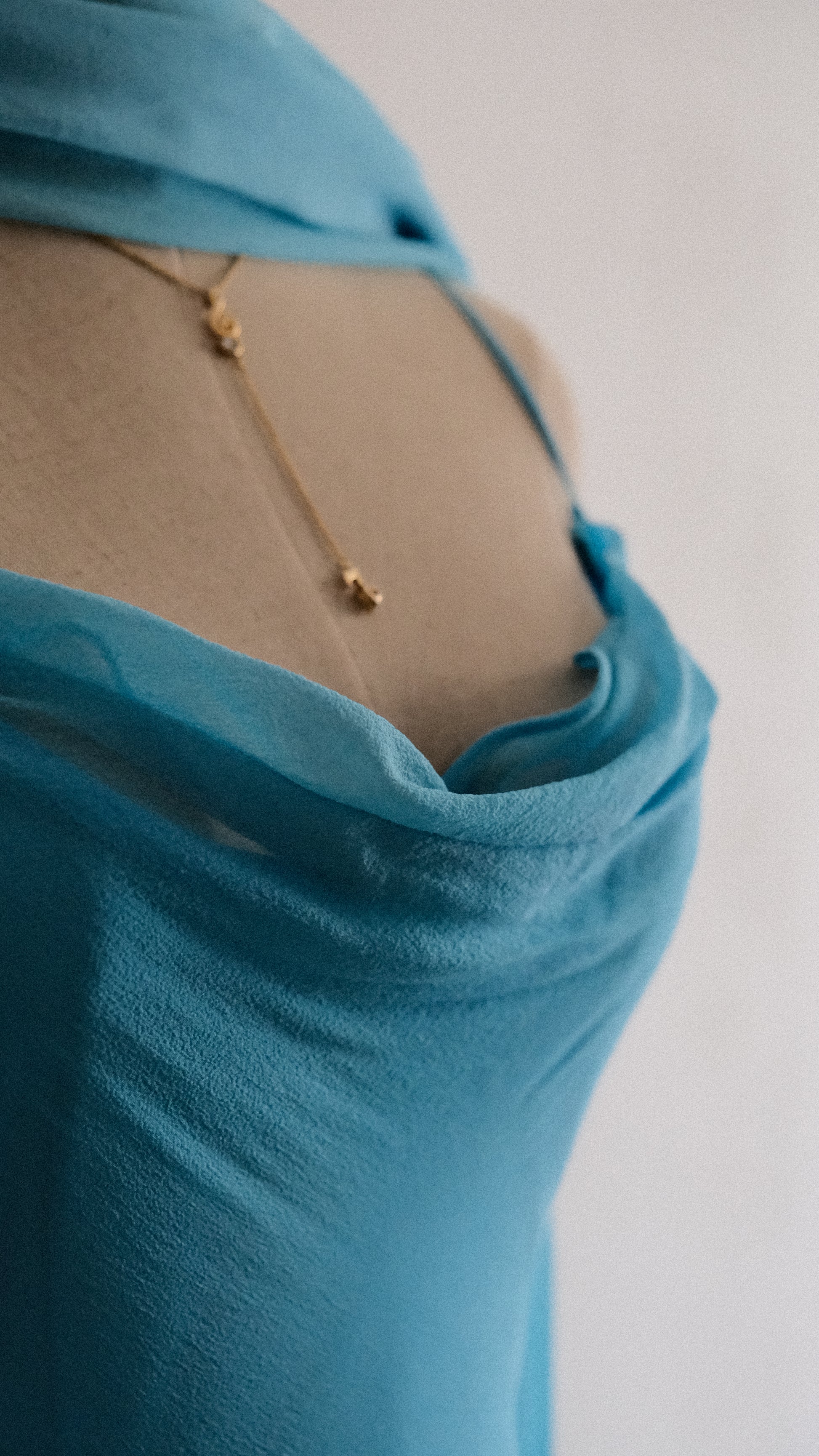 An aqua blue evening dress with ruffled touches and matching scarf.