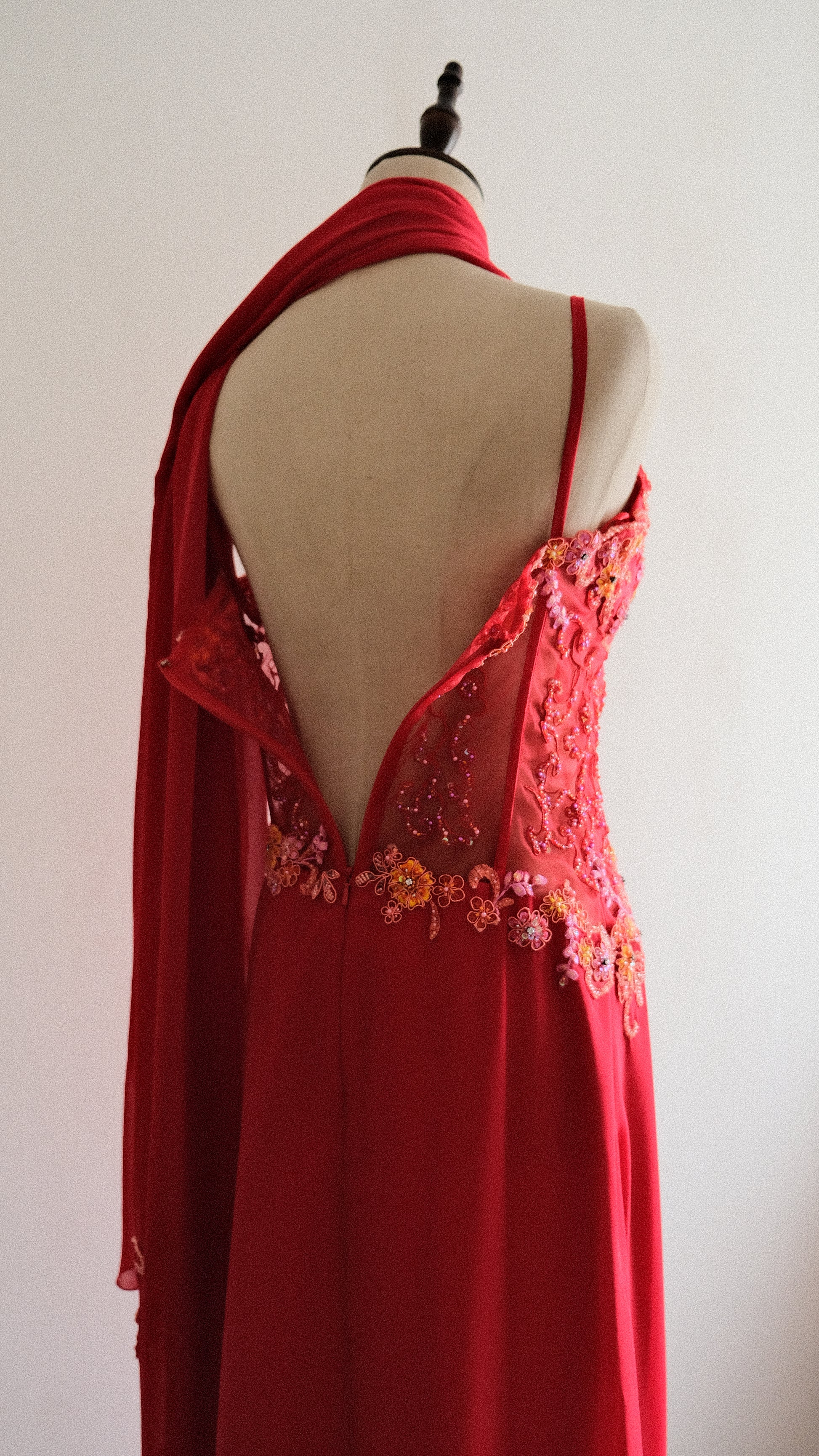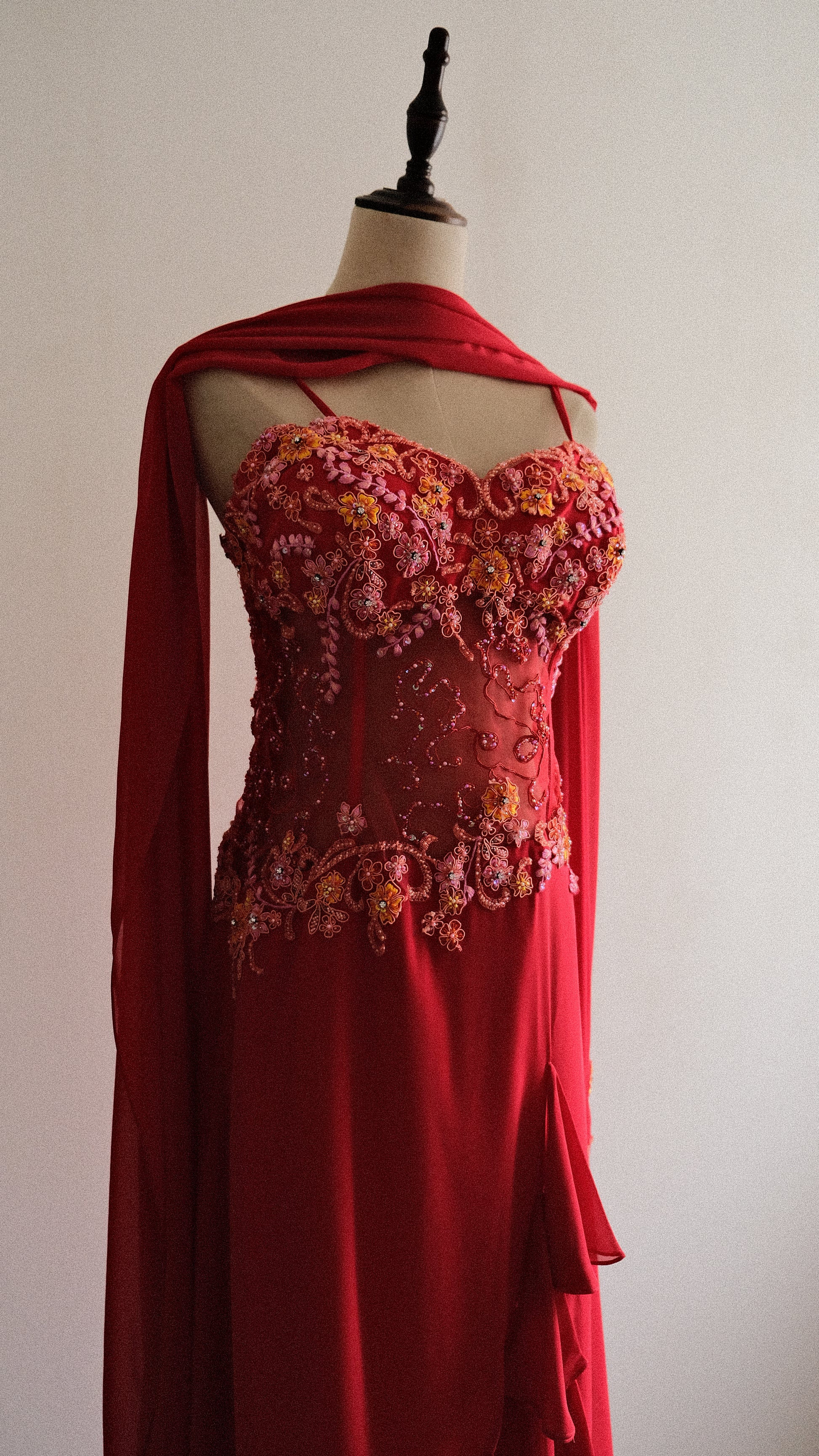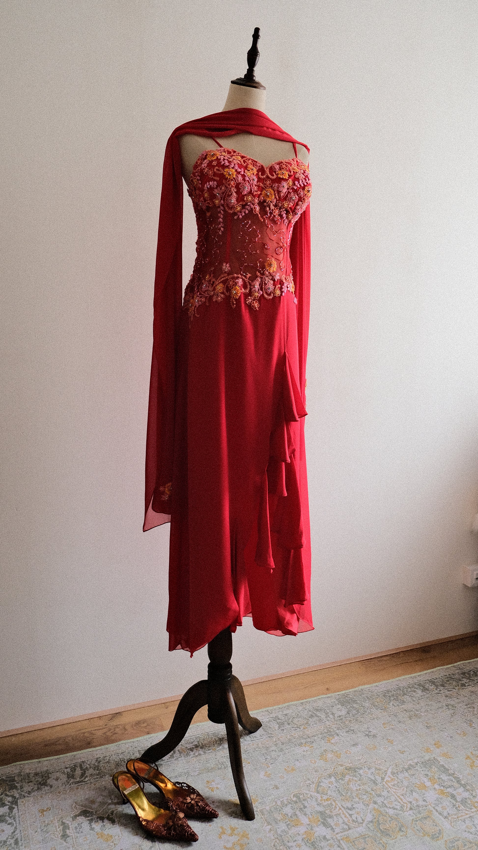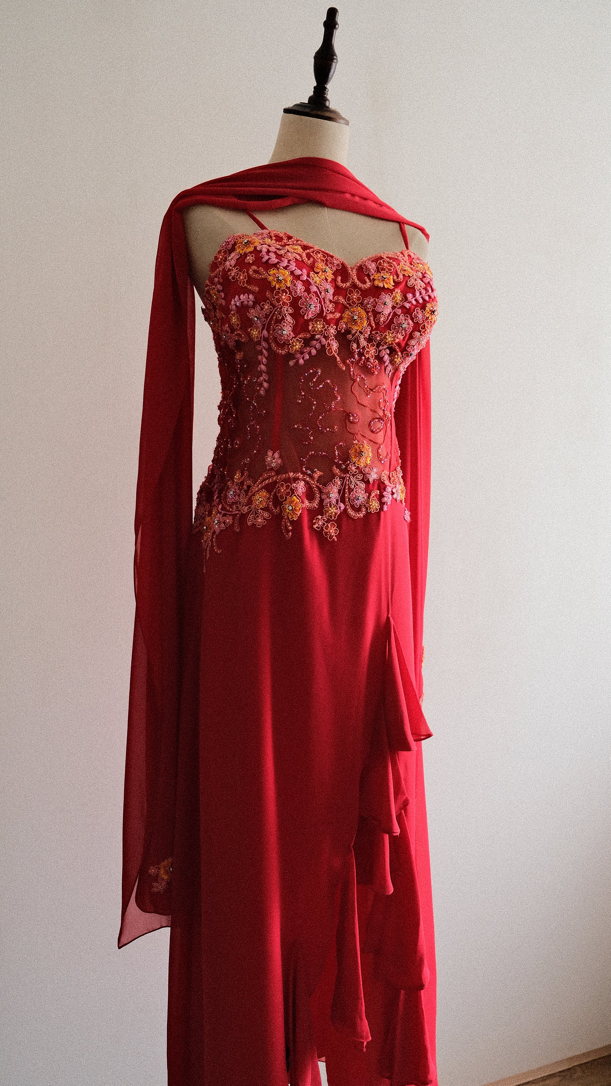 A rare bright red ruffled evening dress with an embellished bustier; luminous, fierce and an elegant vision of allure.