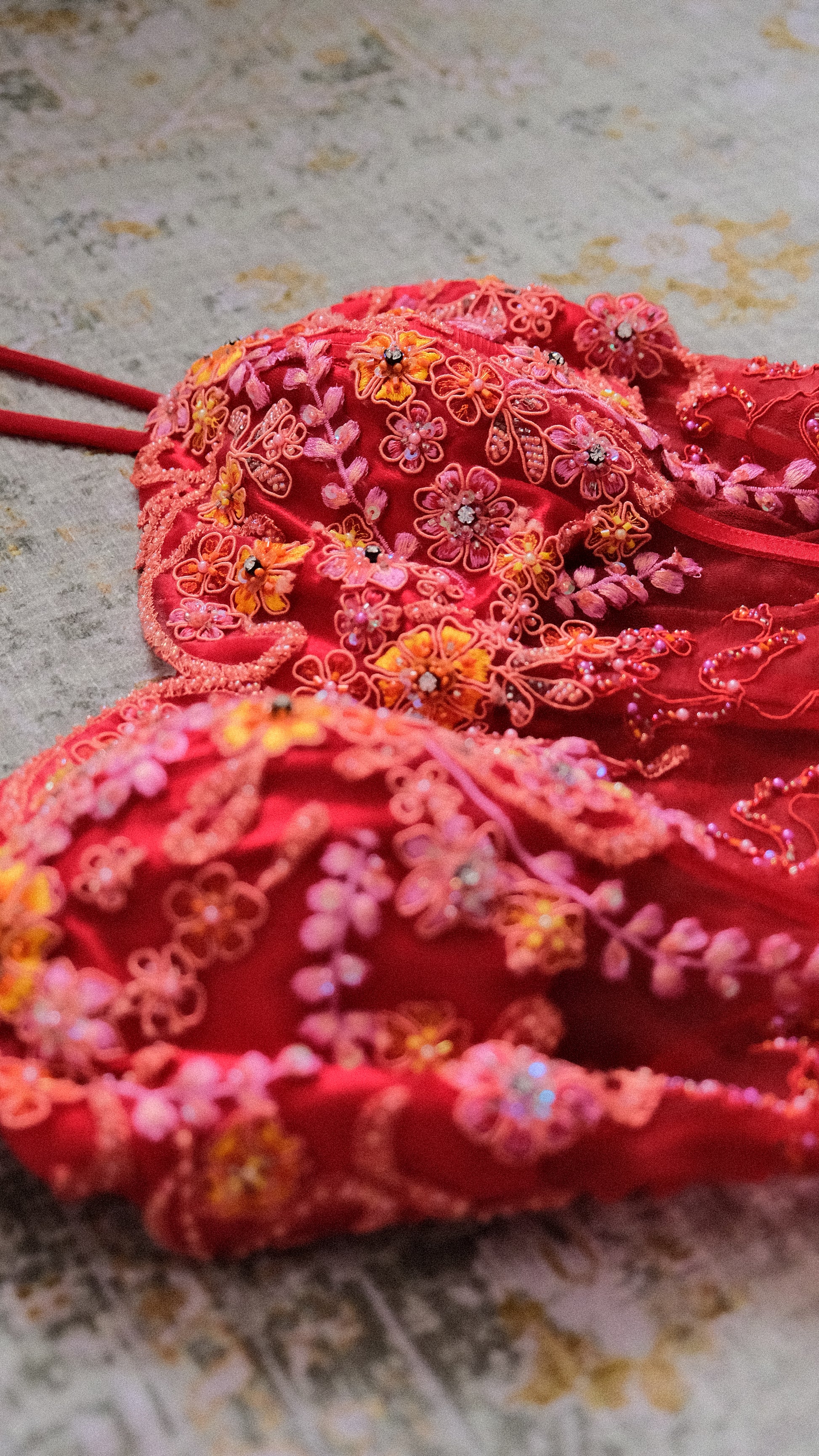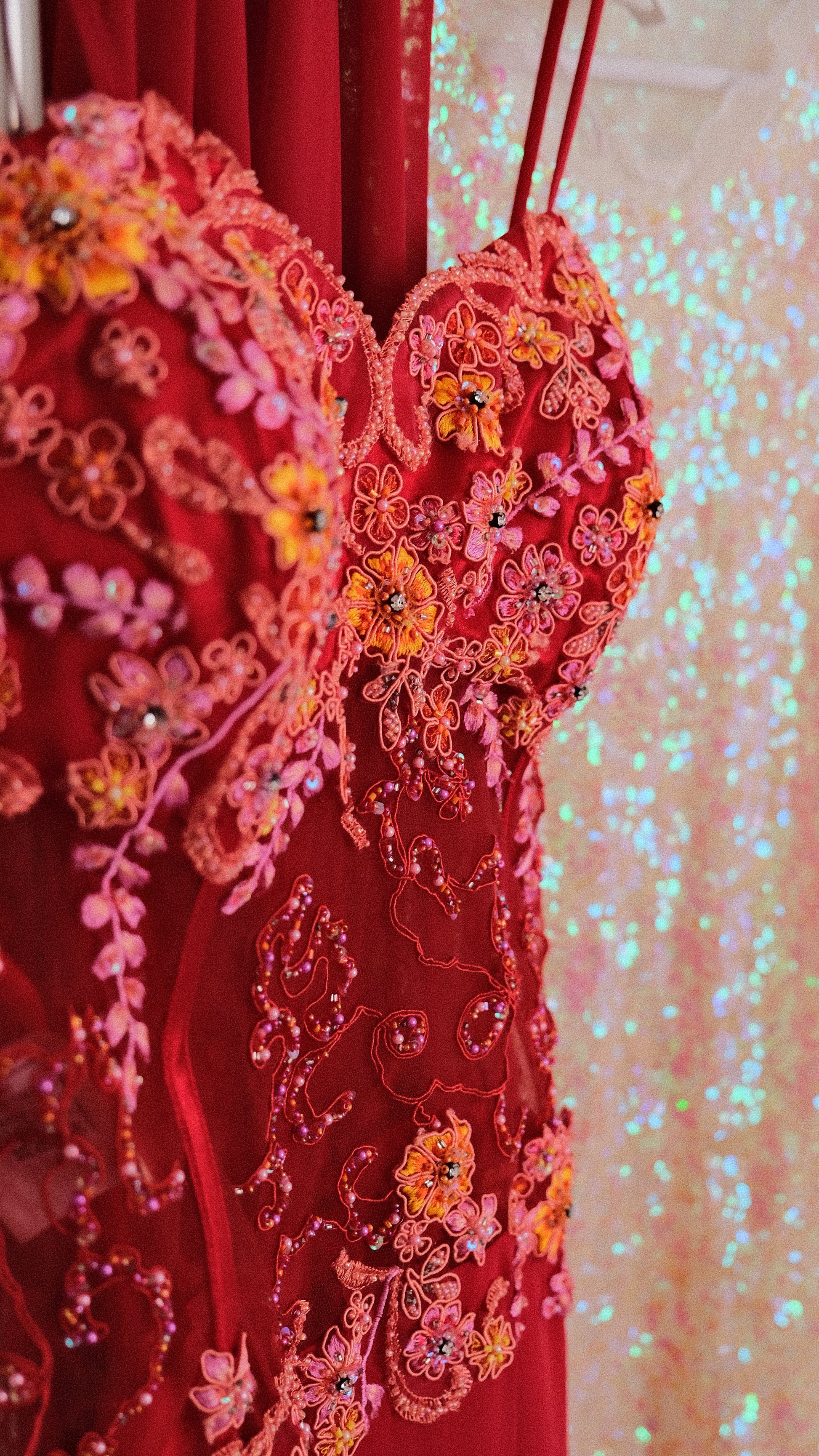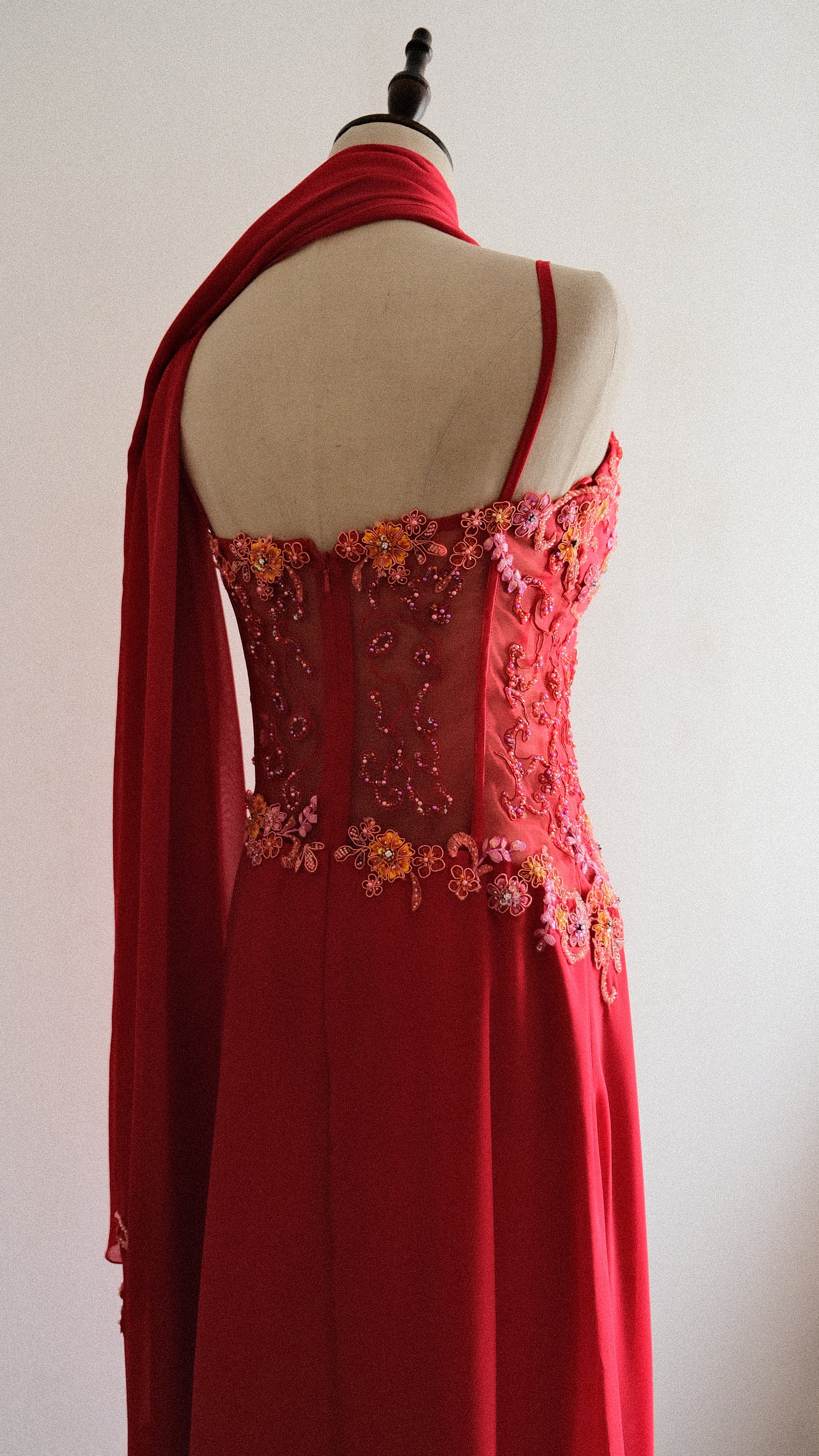 A rare bright red ruffled evening dress with an embellished bustier; luminous, fierce and an elegant vision of allure.