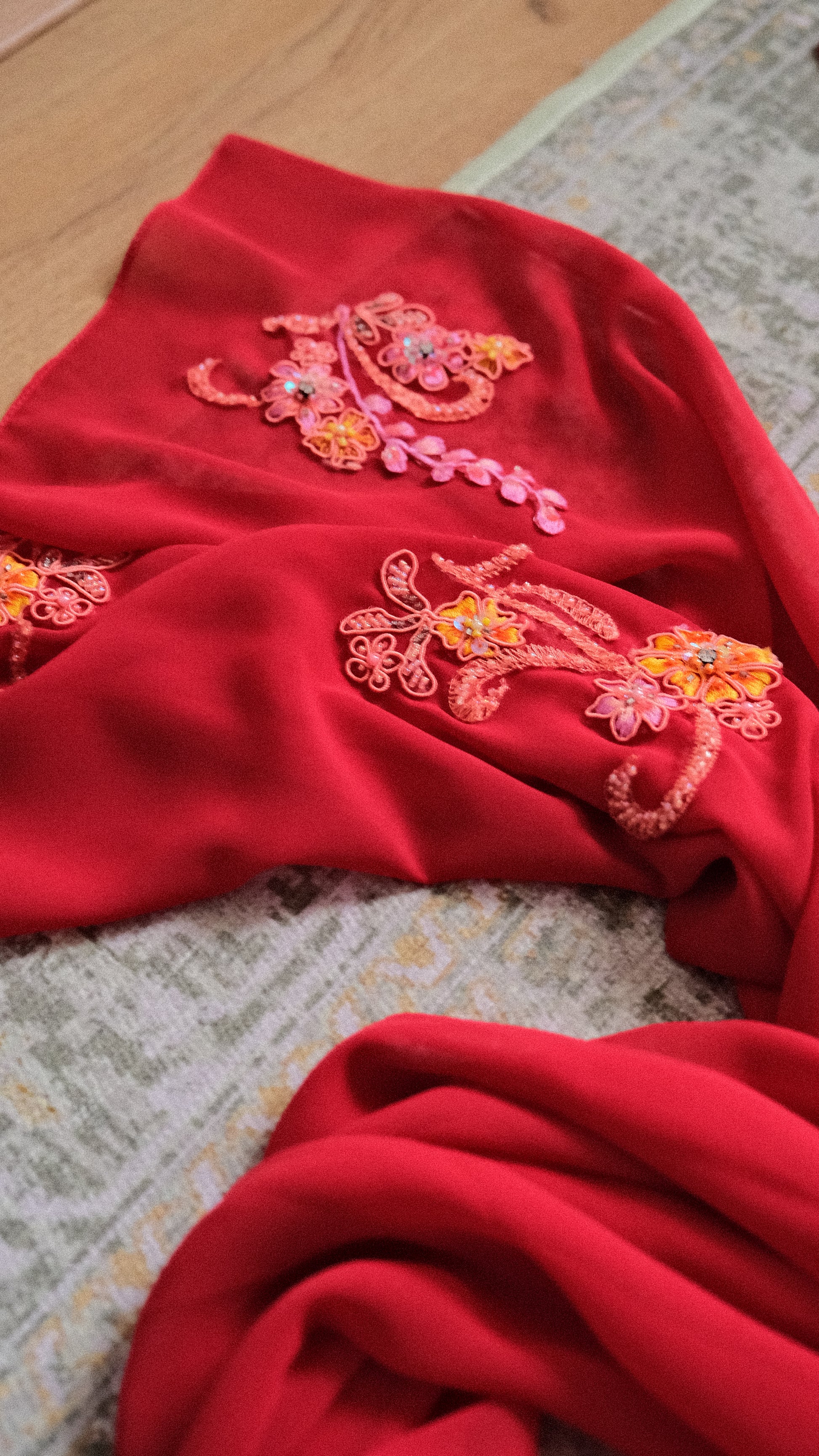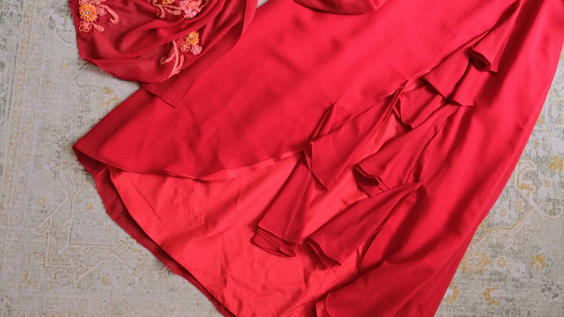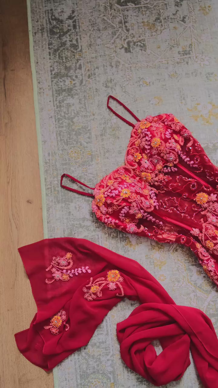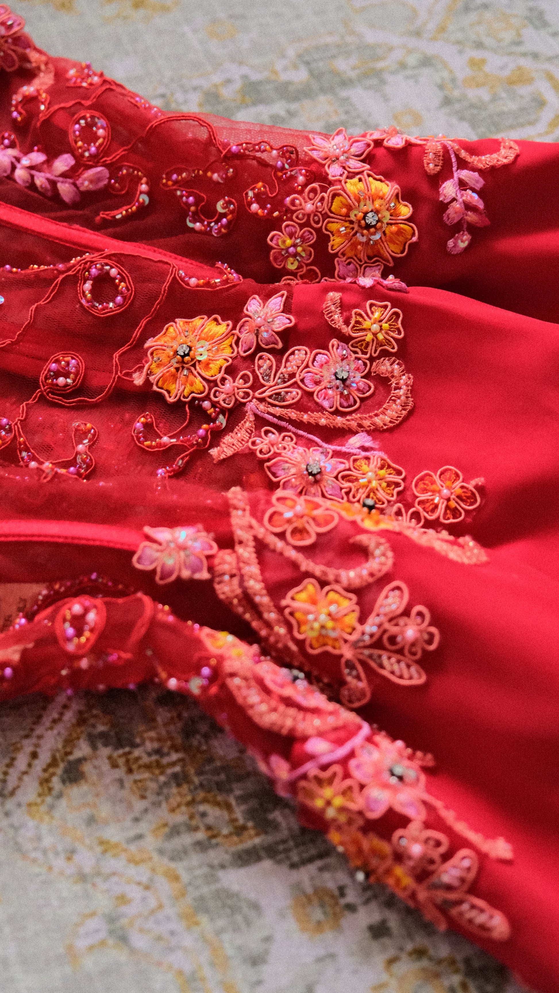 A rare bright red ruffled evening dress with an embellished bustier; luminous, fierce and an elegant vision of allure.