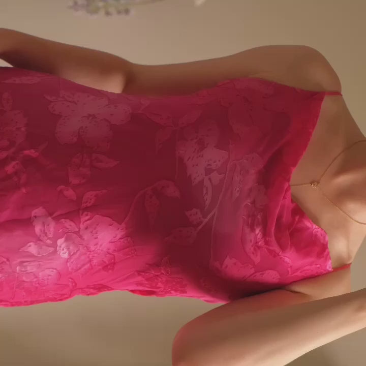 A vibrant fairytale dress with a hotpink color palette and enchanted floral pattern.