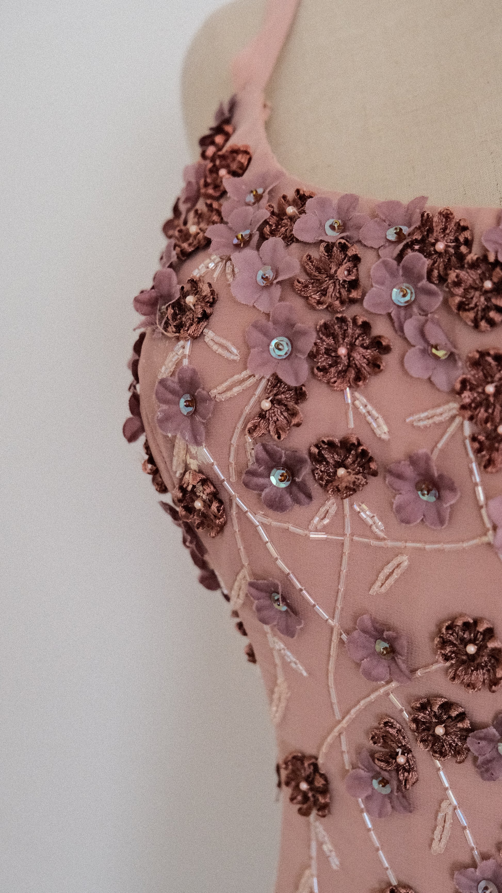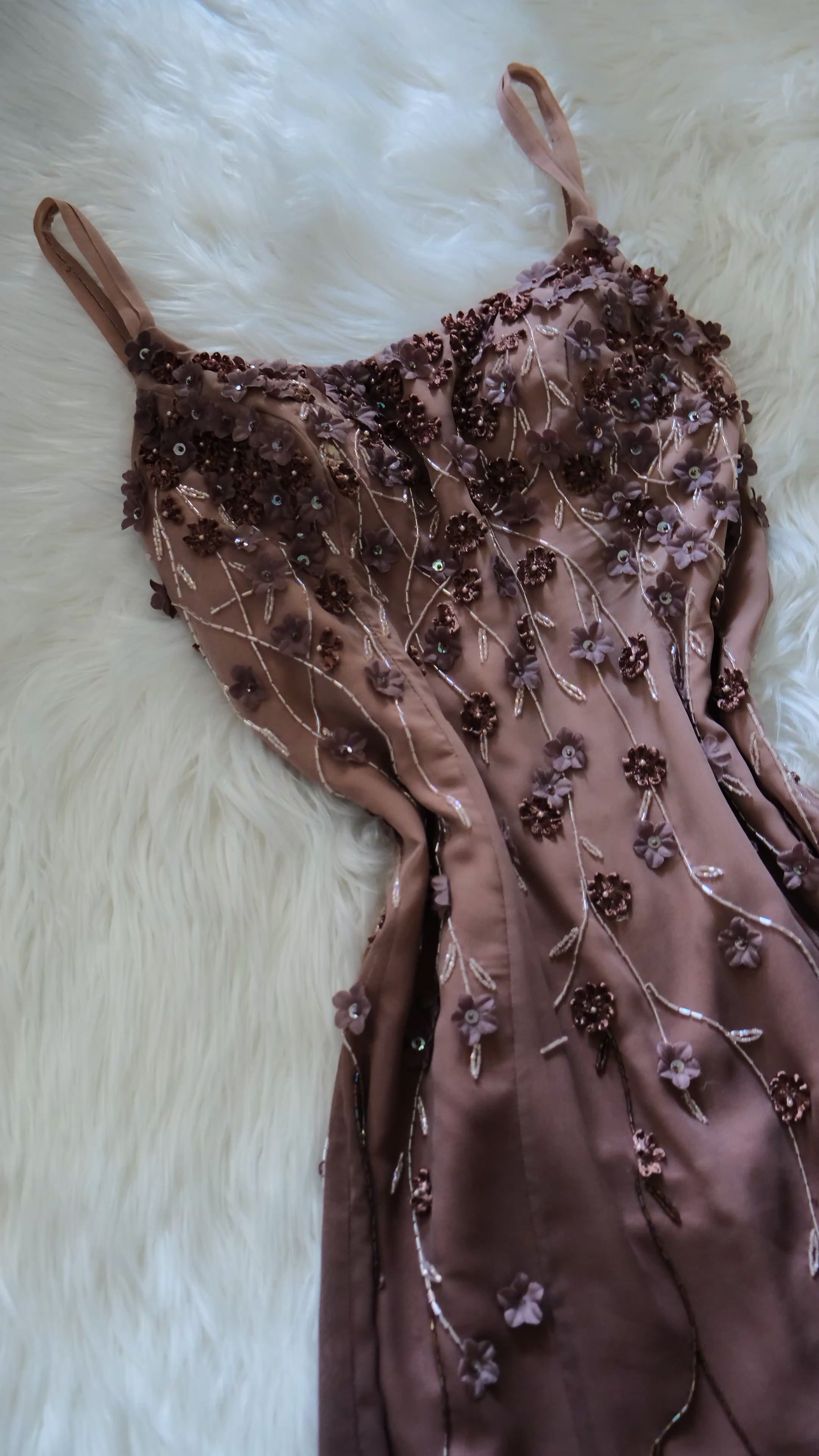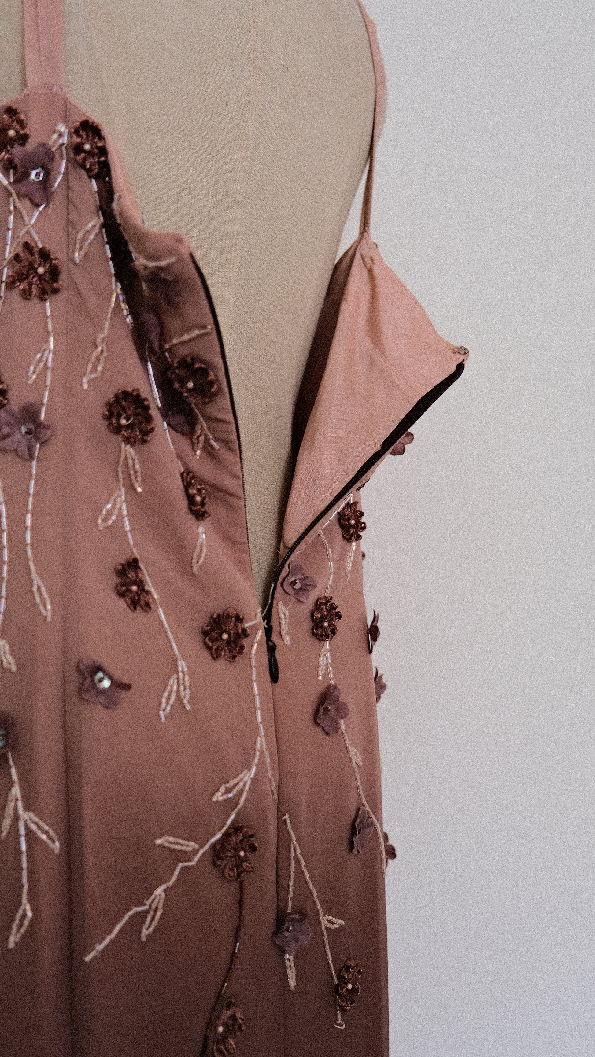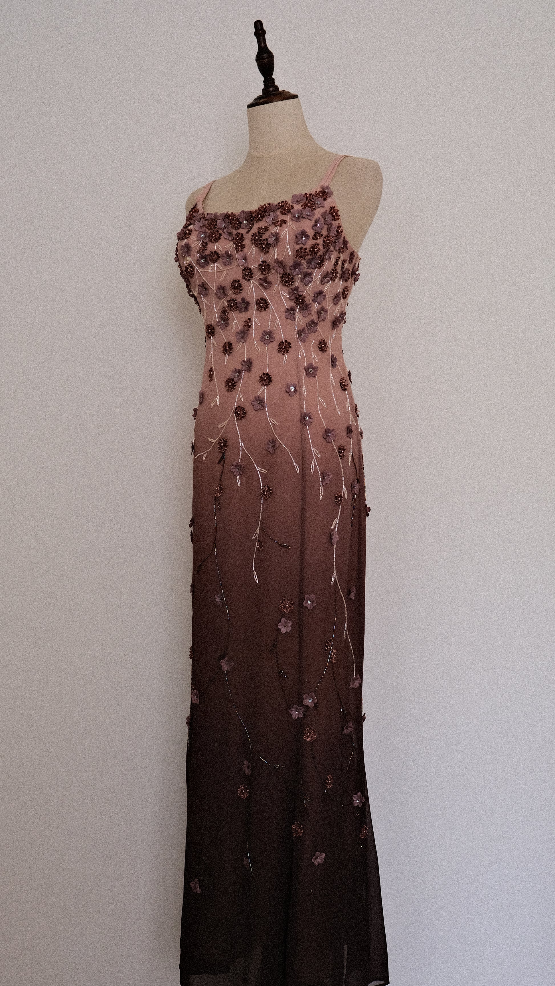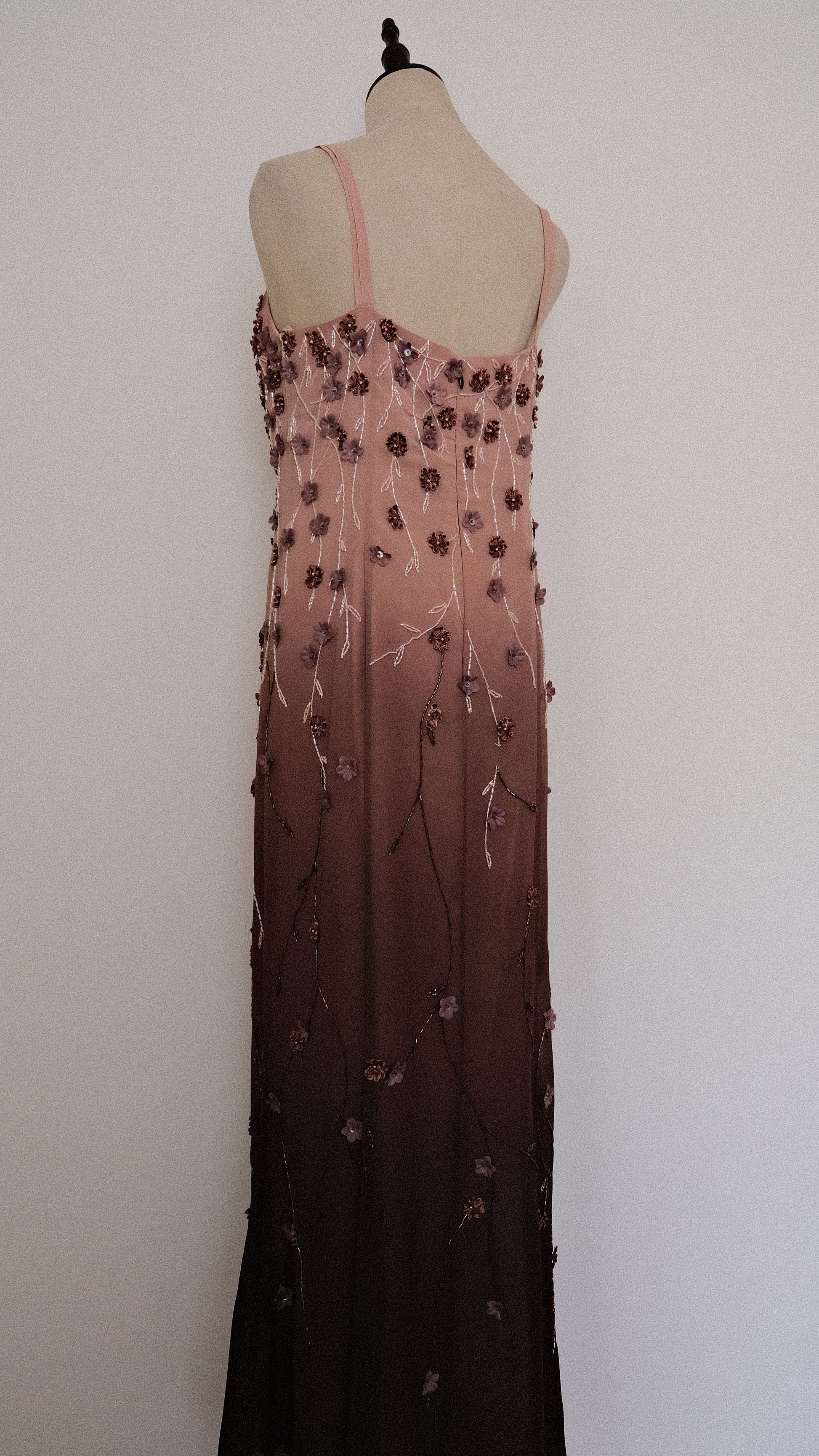 A rare Spanish brown ombre evening dress covered in romantic florals.
