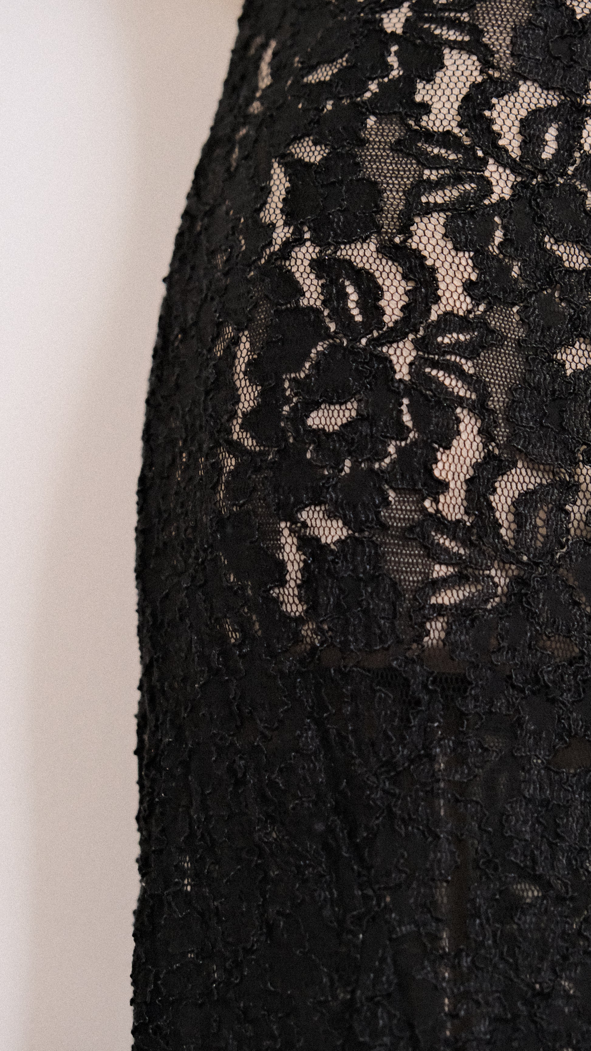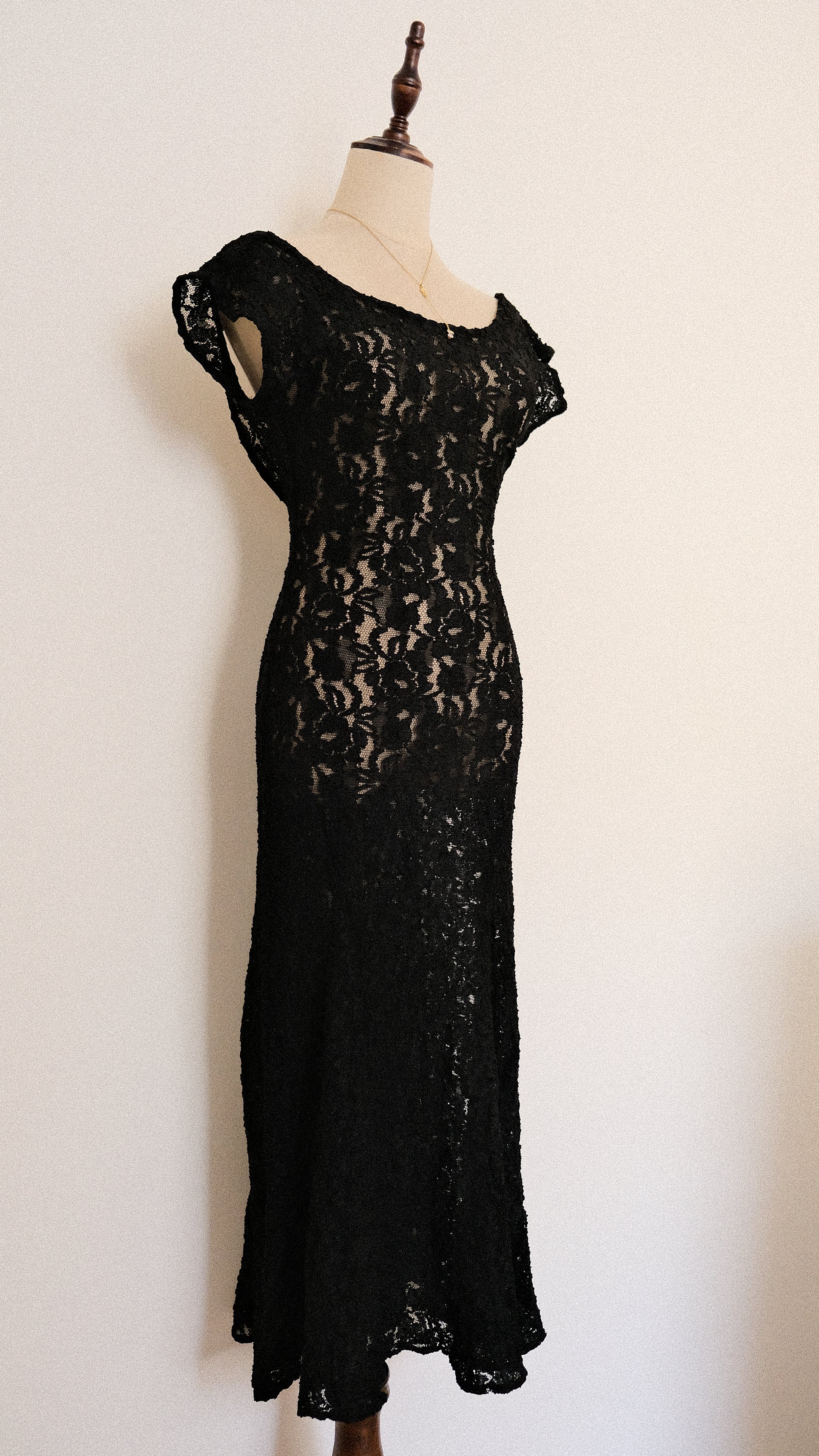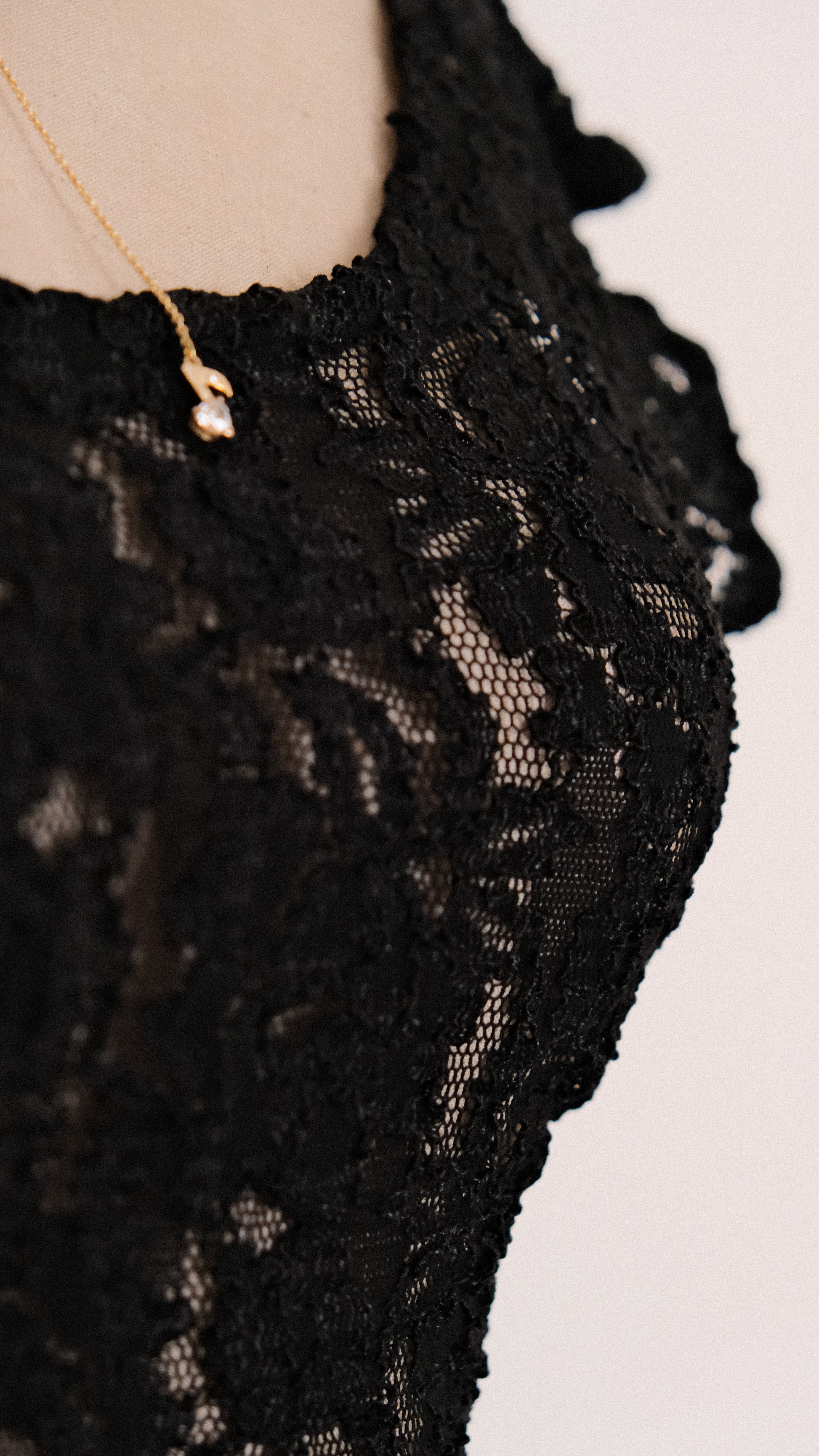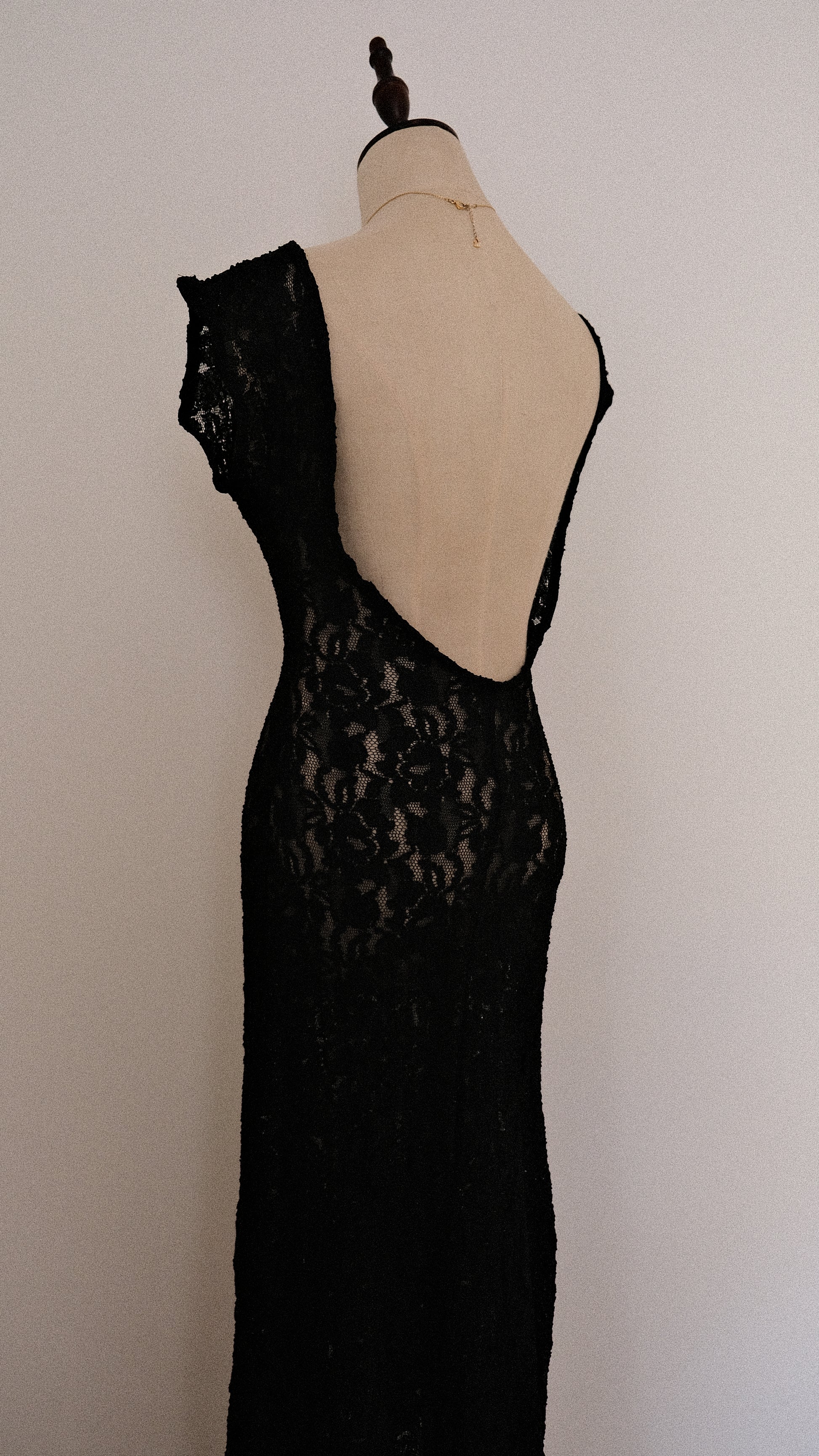A dreamy black lace maxi lingerie dress with a low cut at the back and mermaid shape at the bottom for an even more flirtatious look.