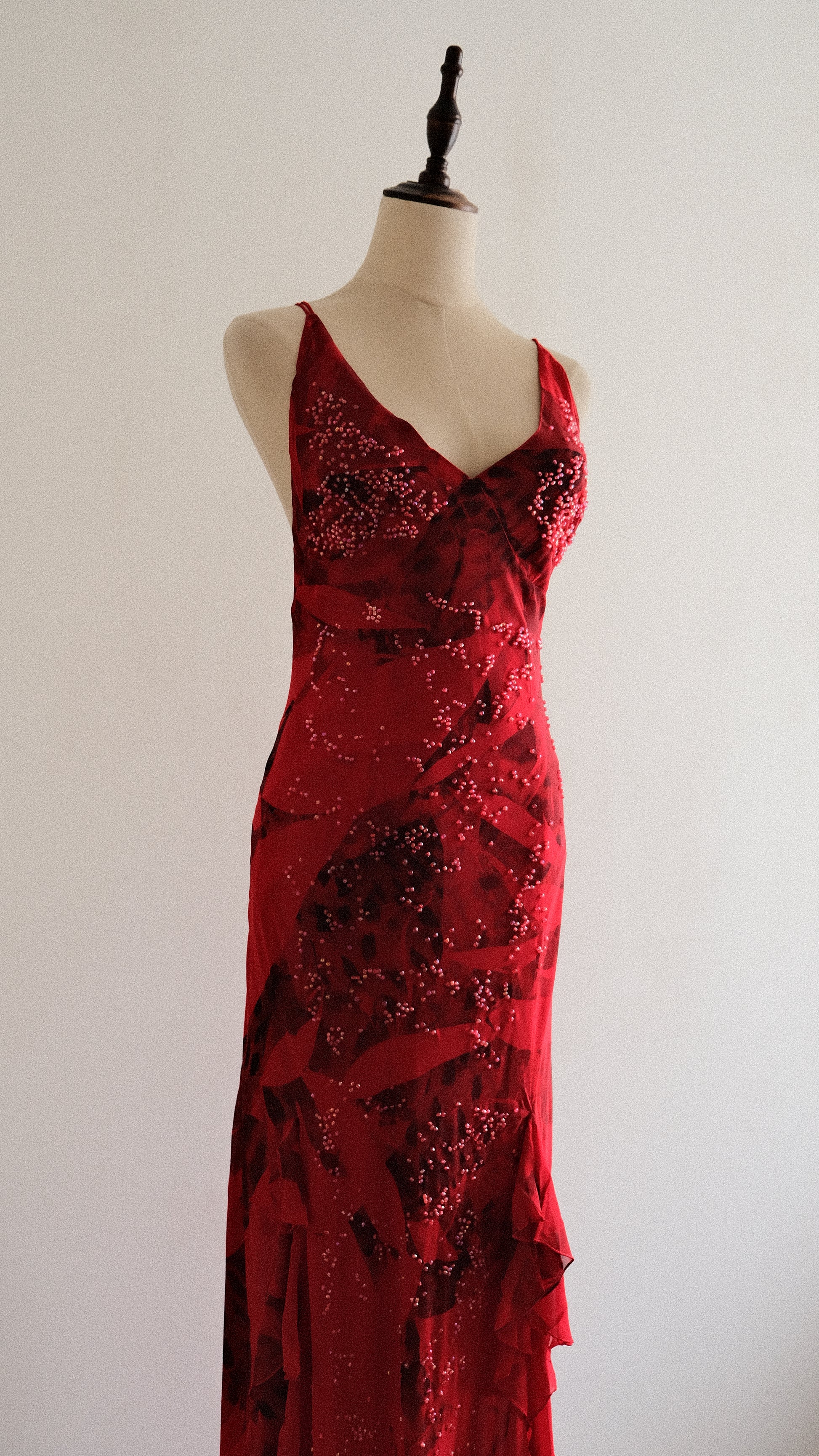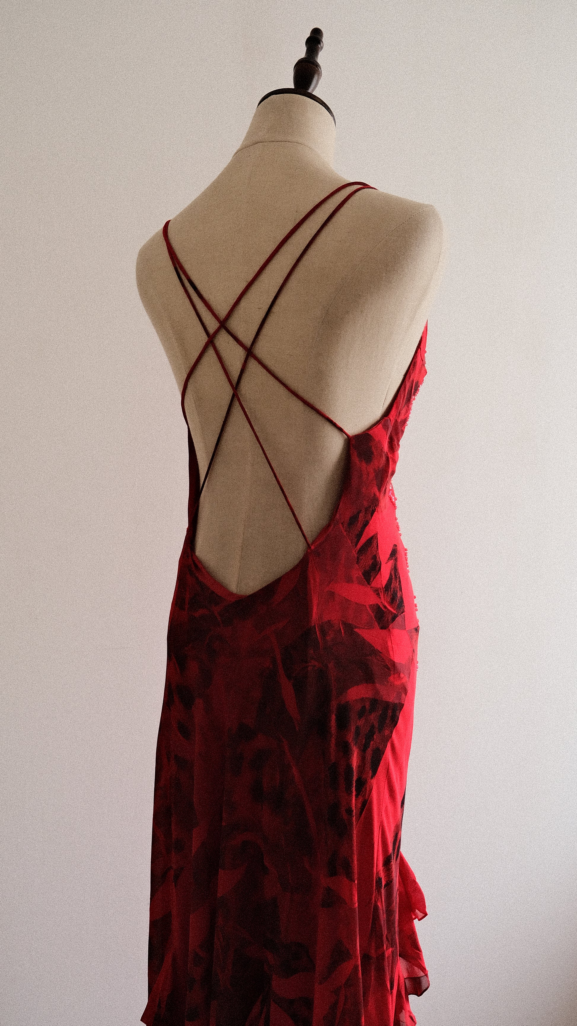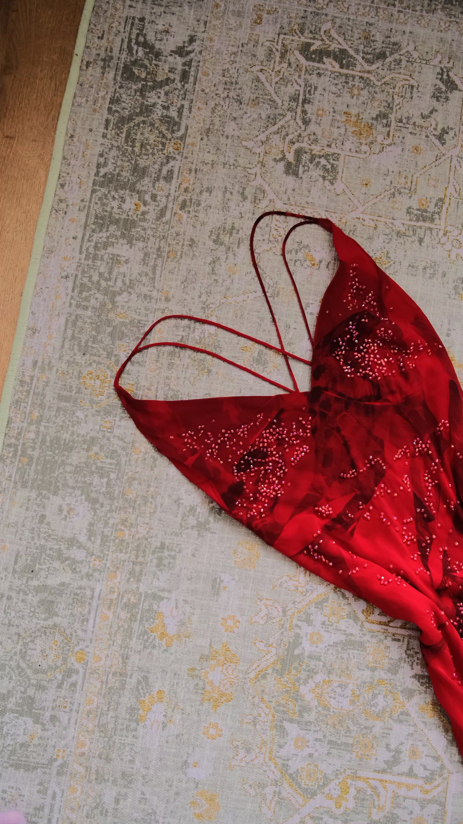 A vintage red dress with embellishments at the front, split details and a low cut back.