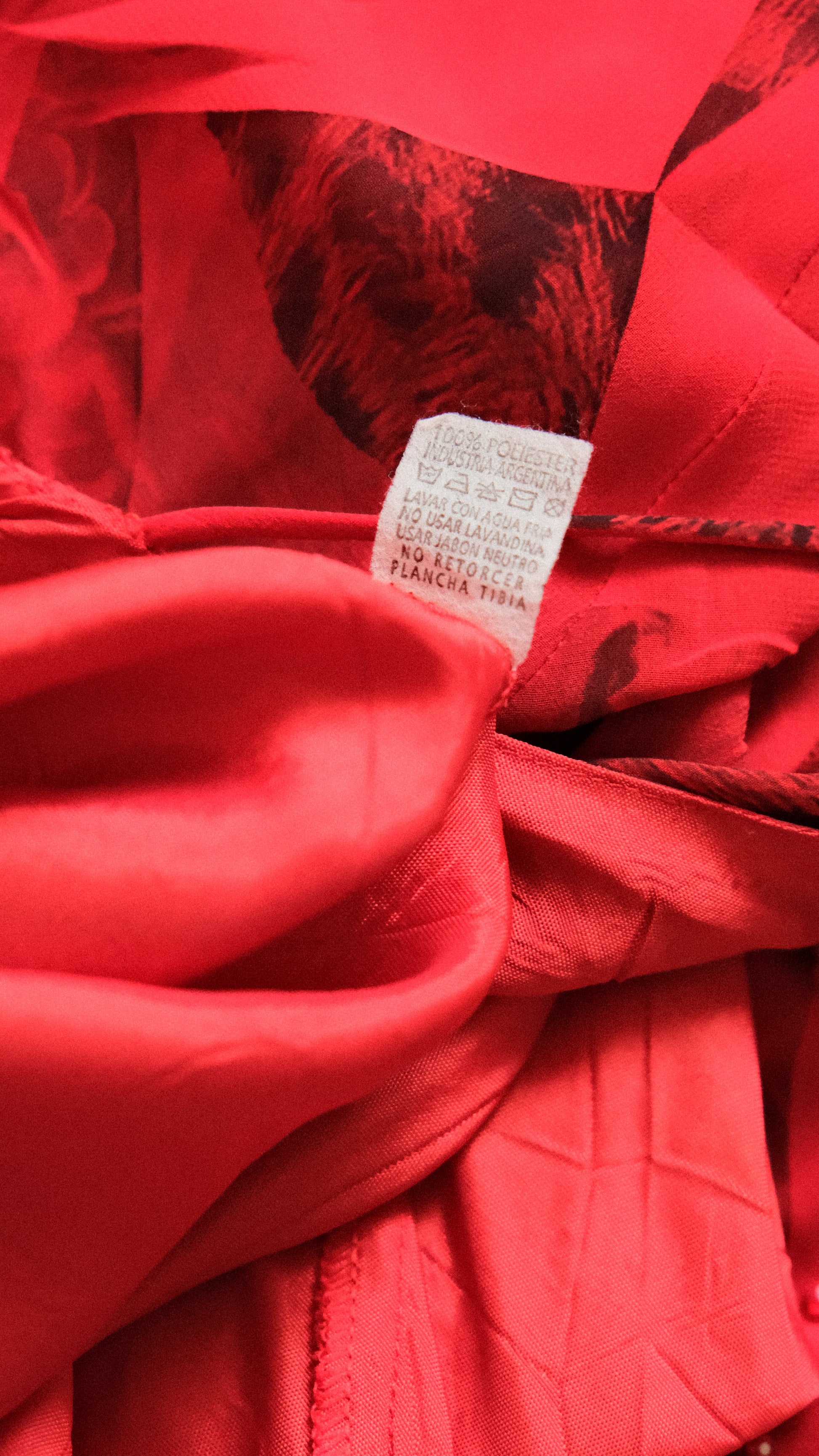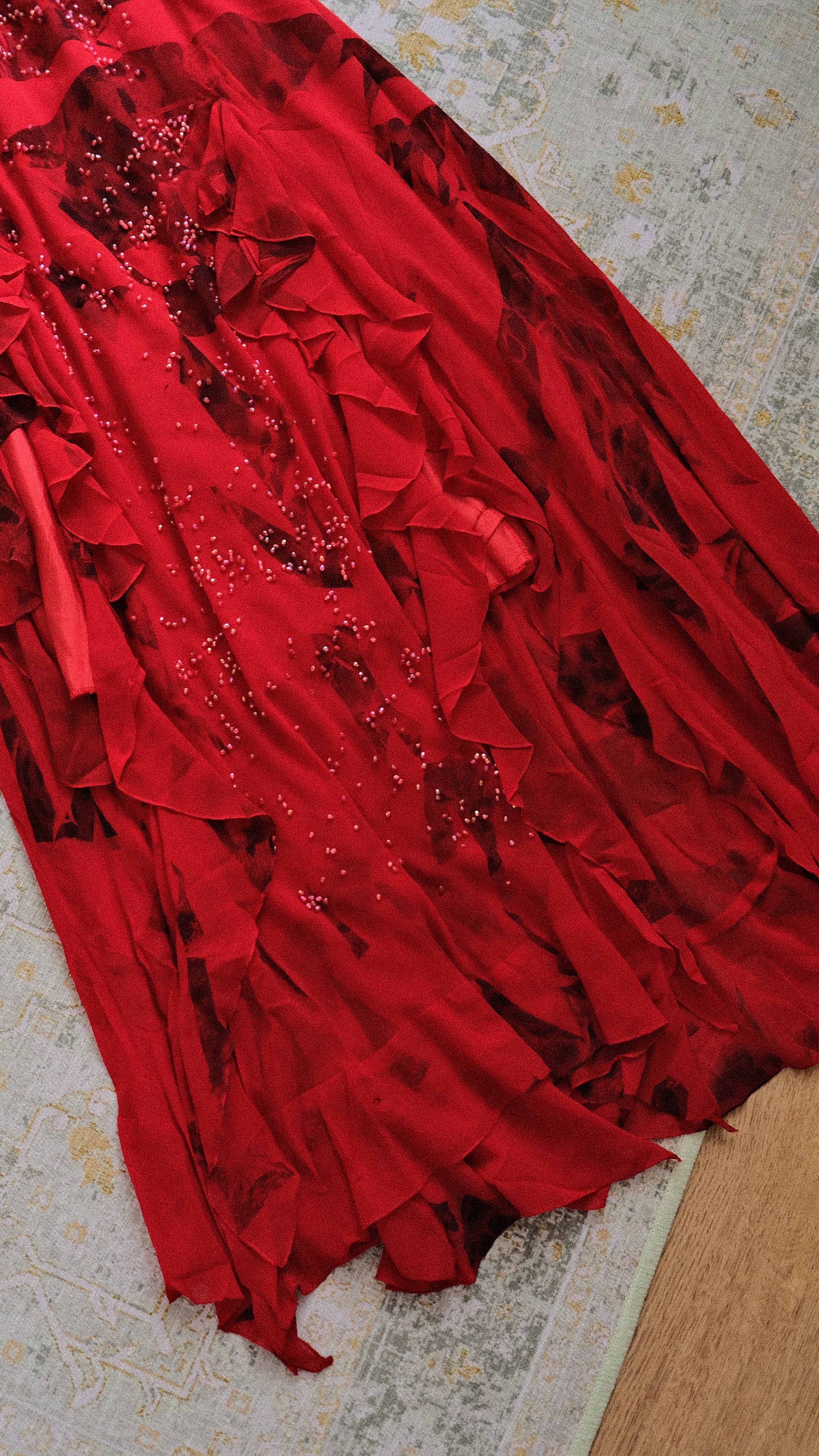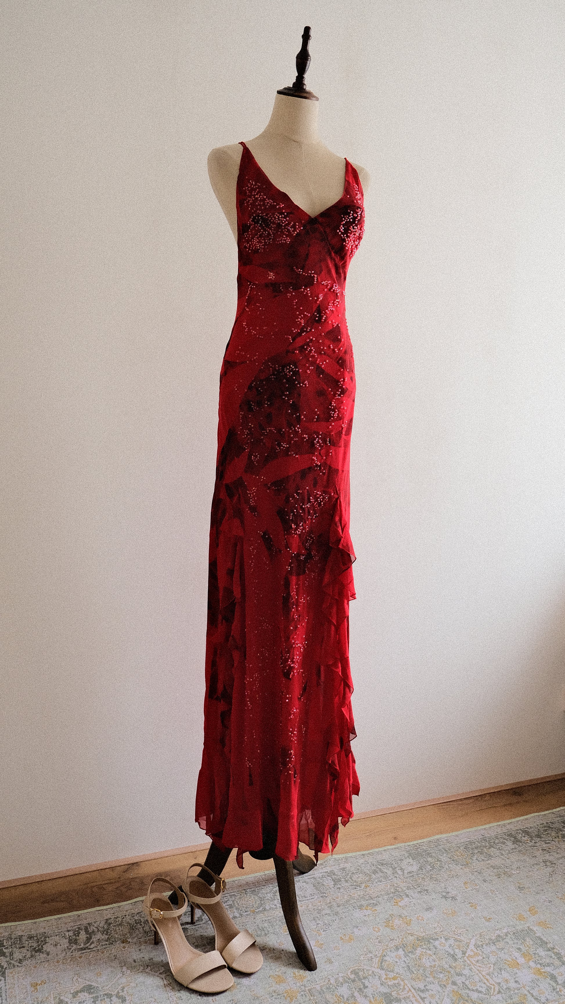 A vintage red dress with embellishments at the front, split details and a low cut back.