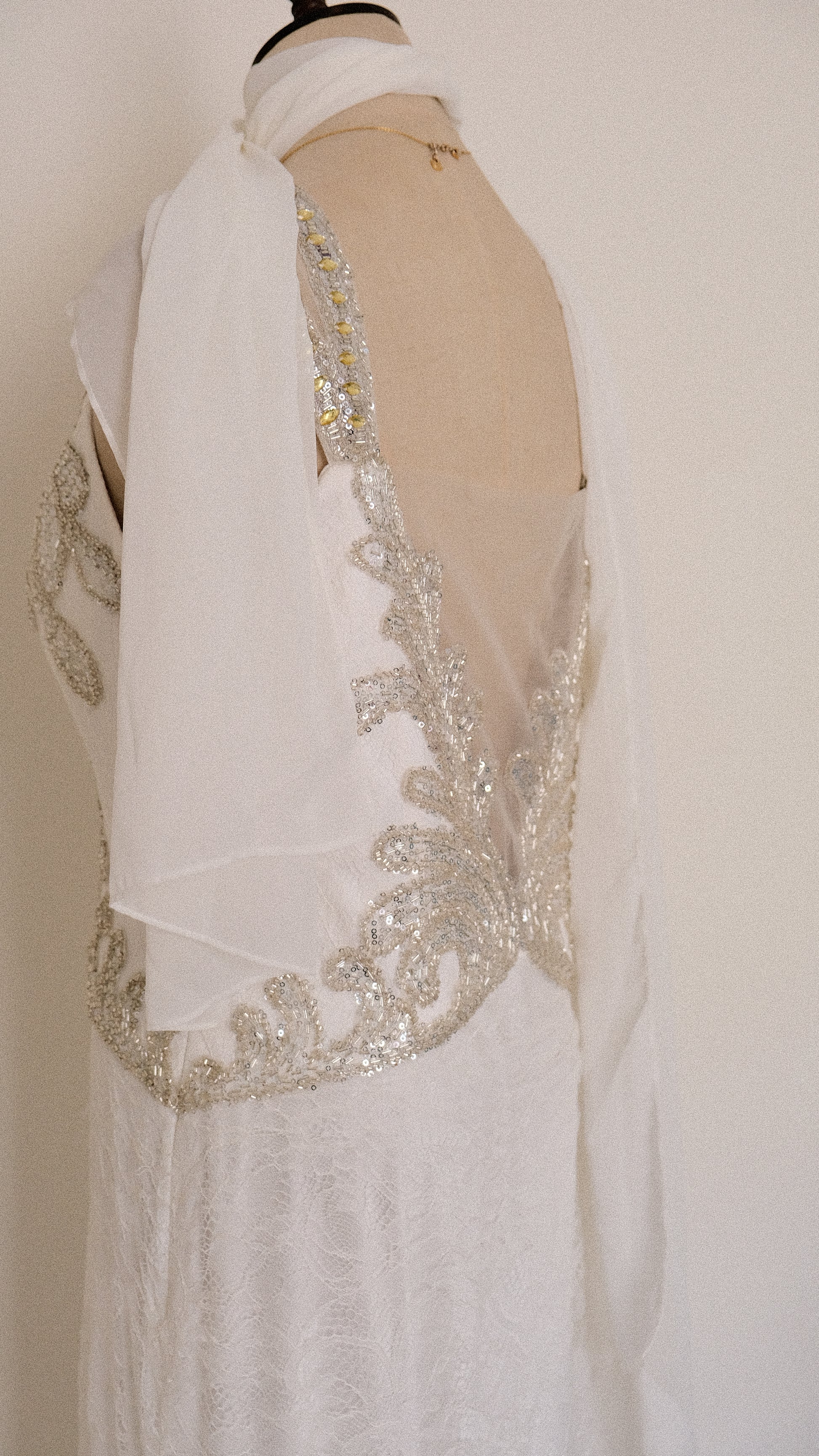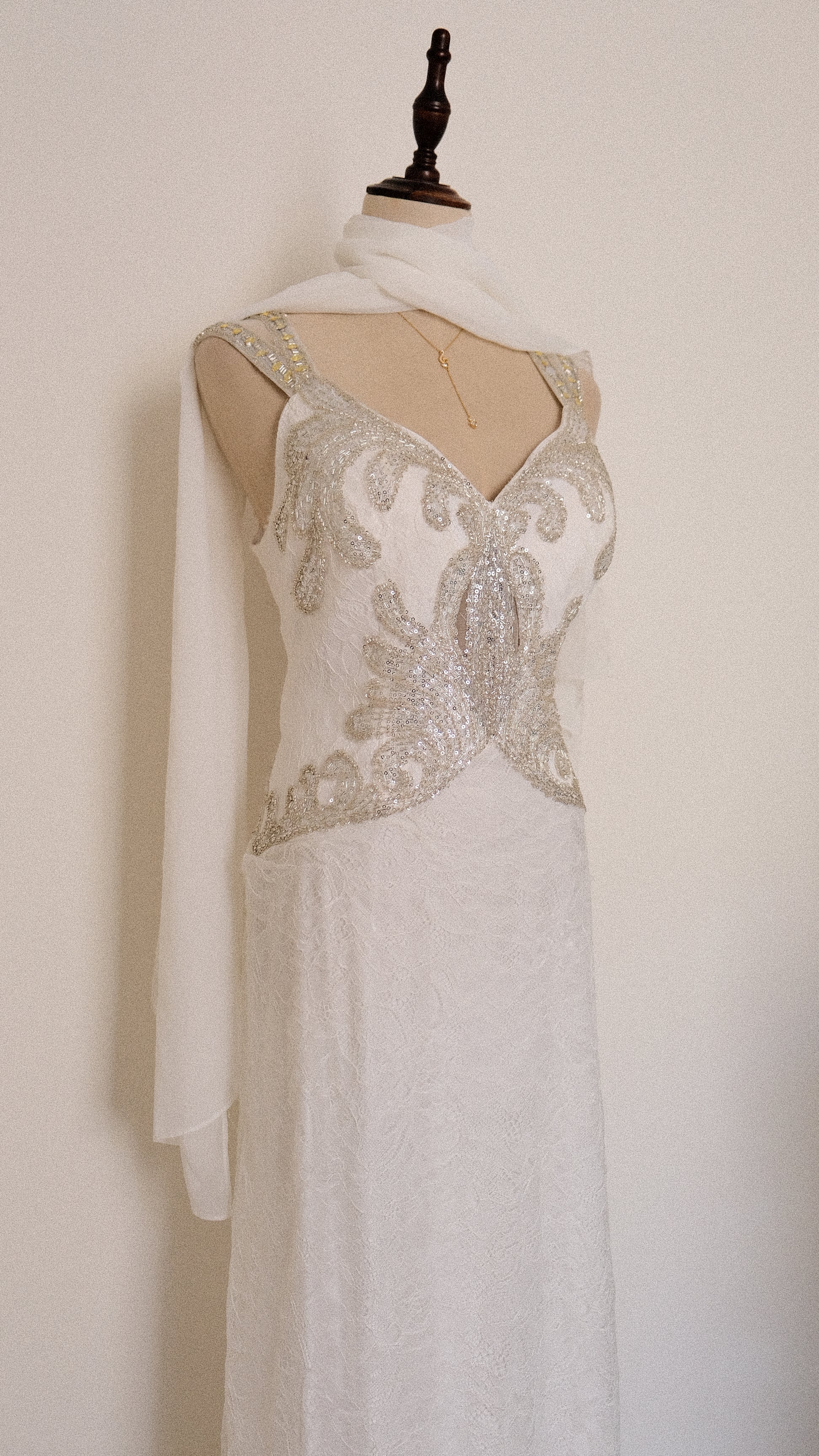A romantic bridal aesthetic maxi dress with a dreamy layer of white lace and silver colored embellished detailing.