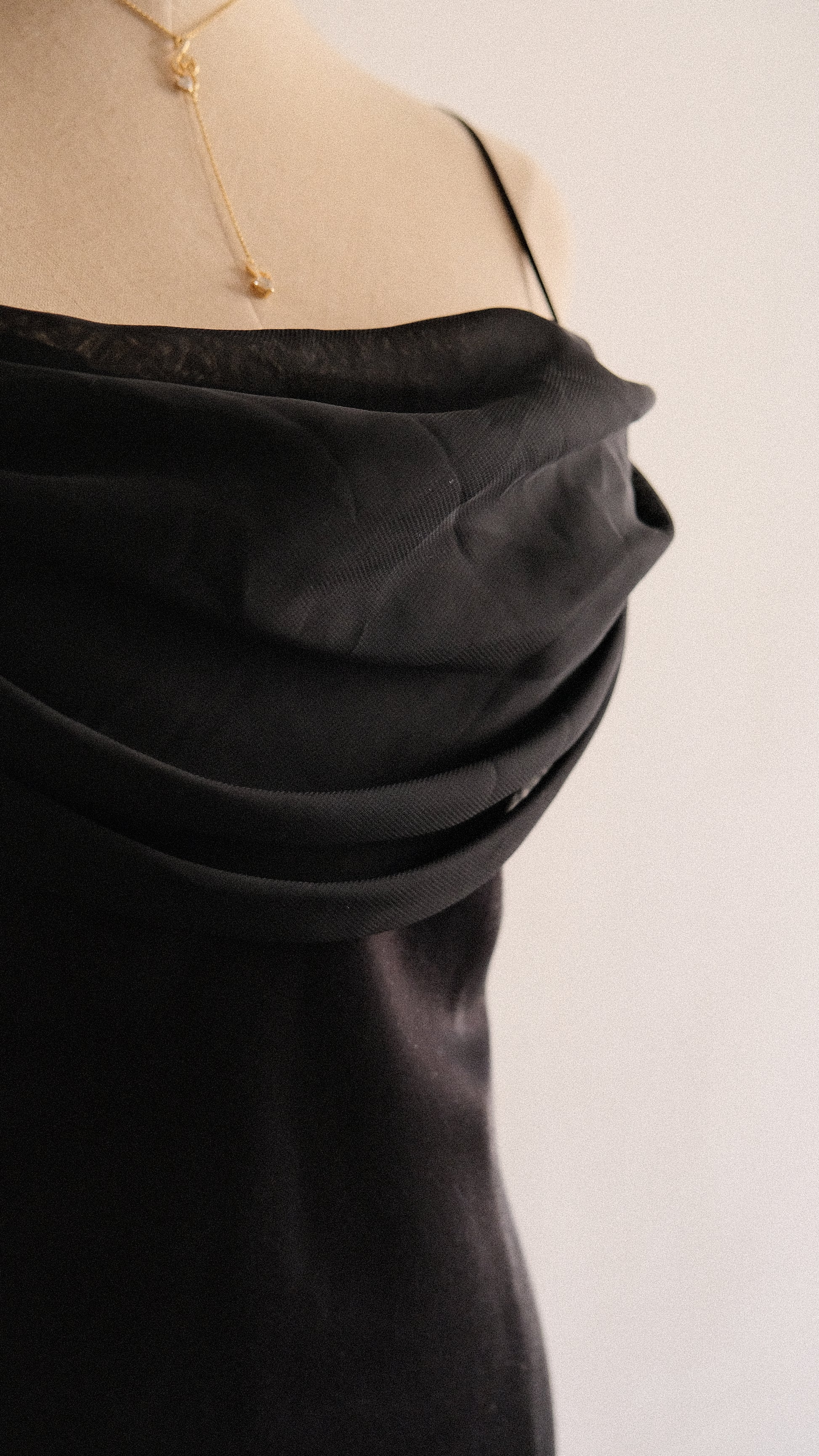 A black evening dress material draping like fairytale wings at the back.