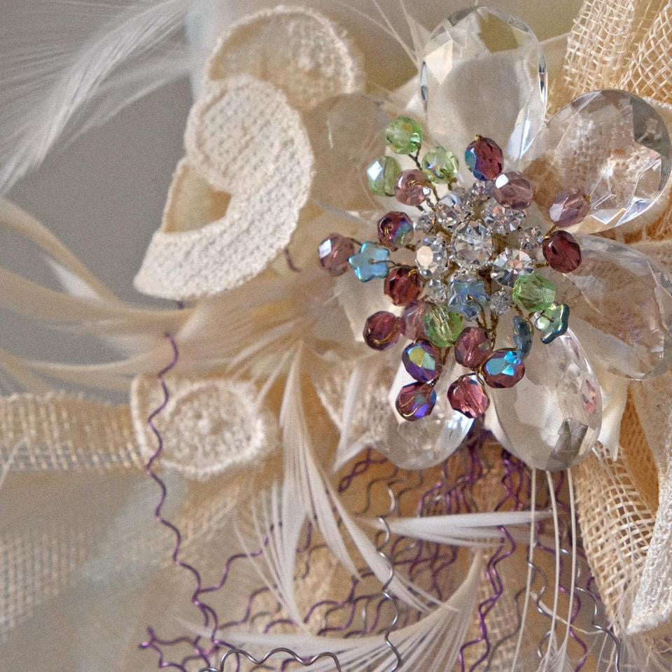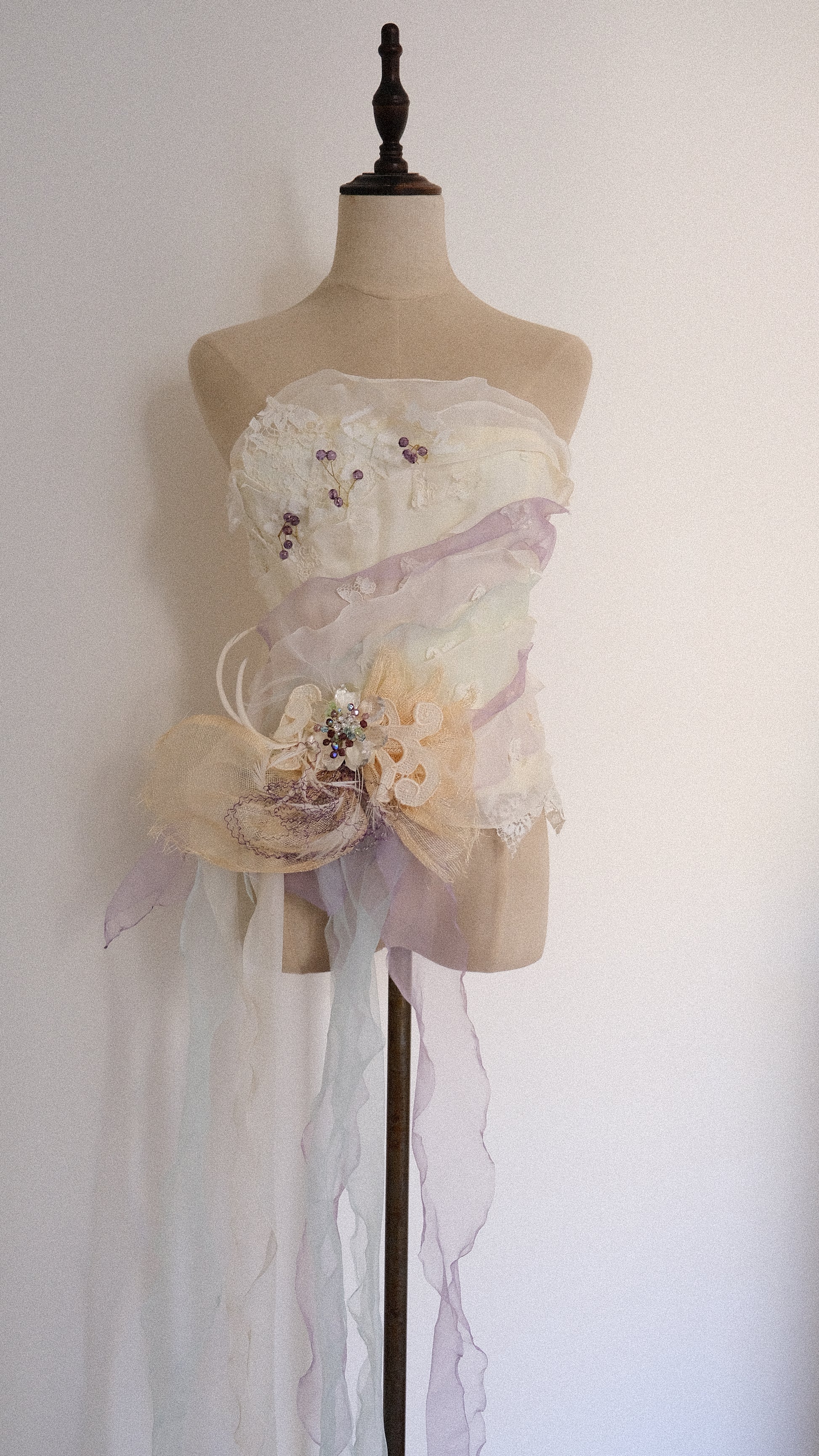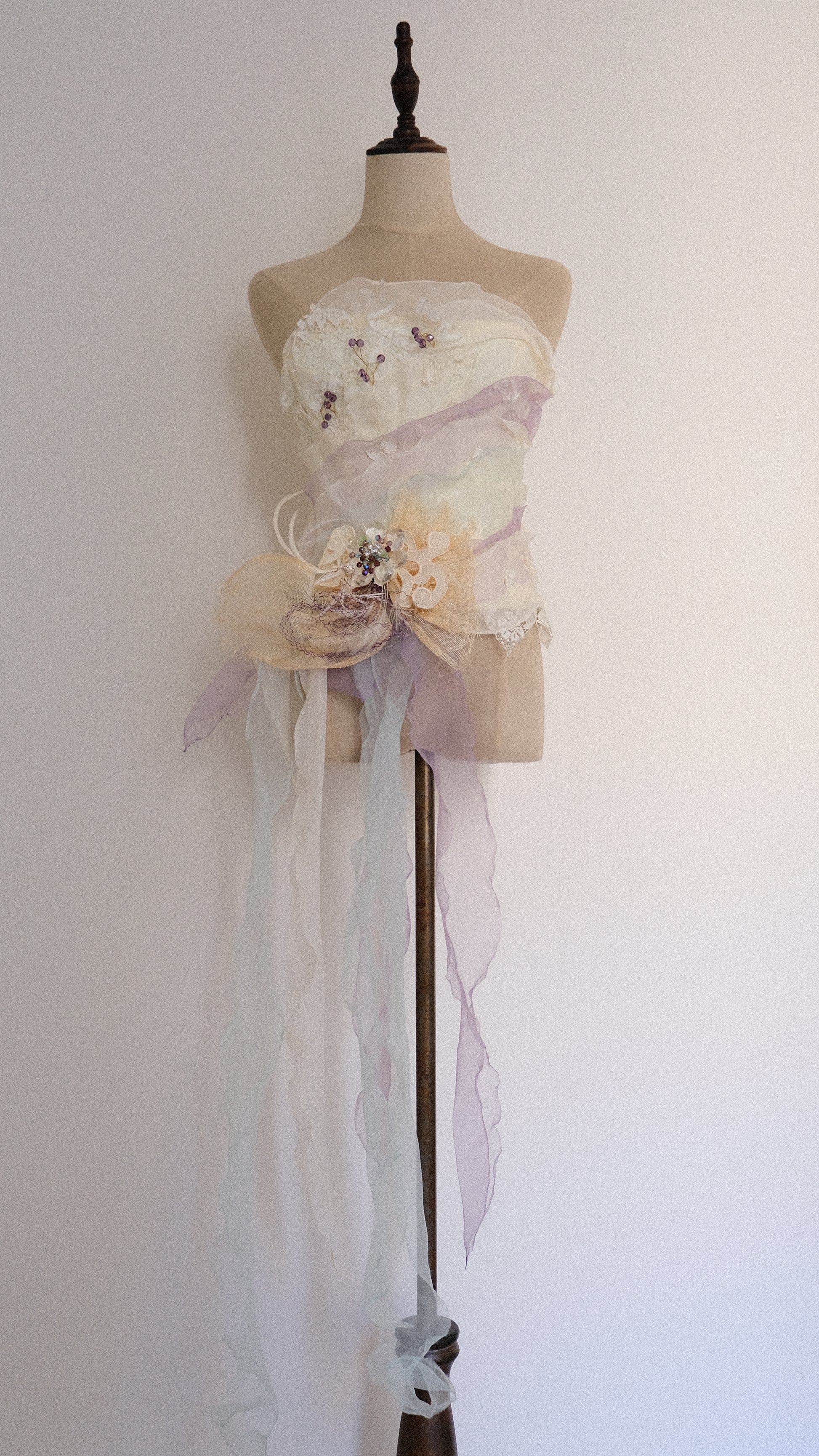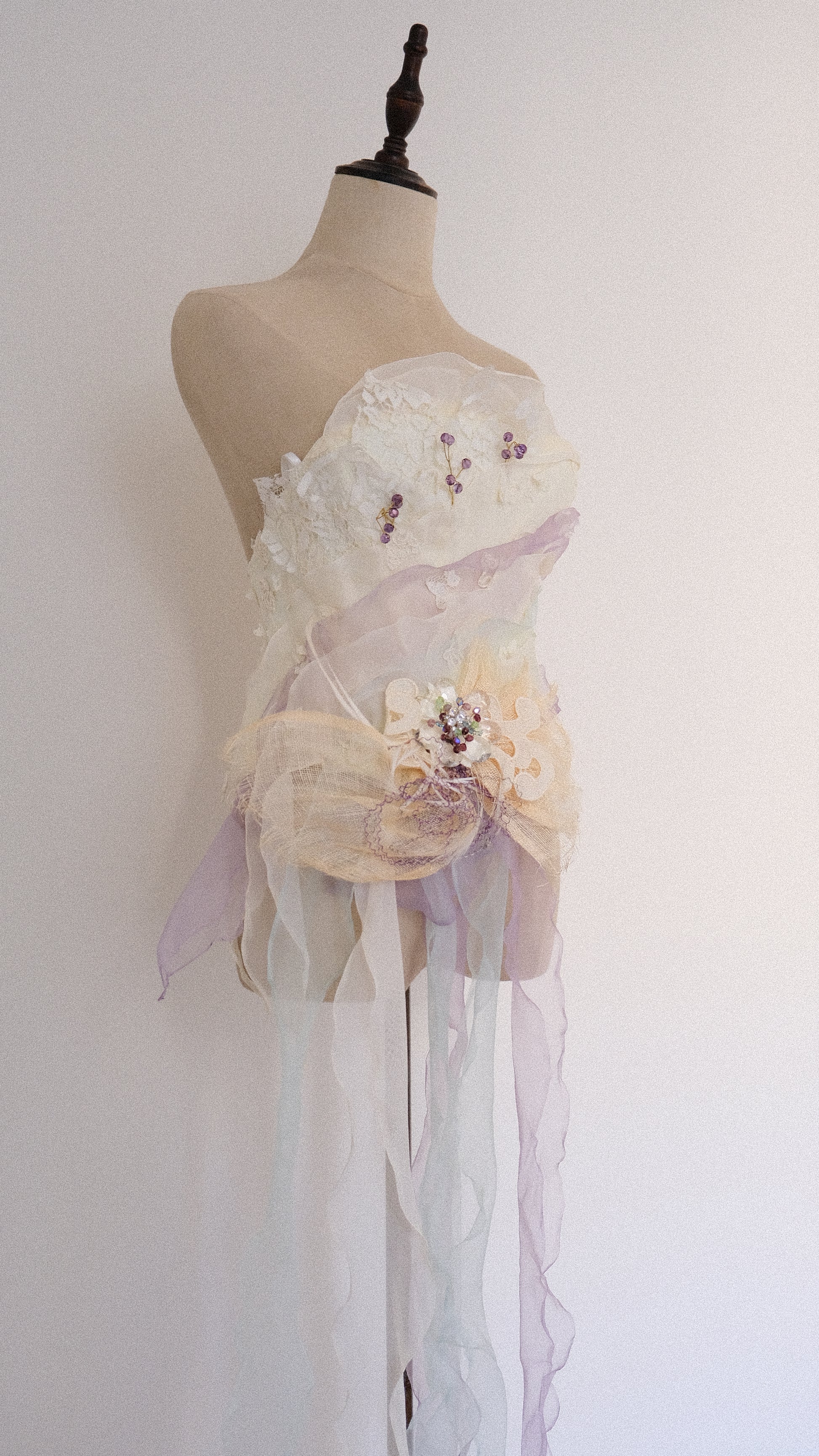 A rare one of a kind magical bustier with ruffled detailing for a dreamy look! The colors have a lilac and pastel blue touch and the detailing also includes a sparkly flower.